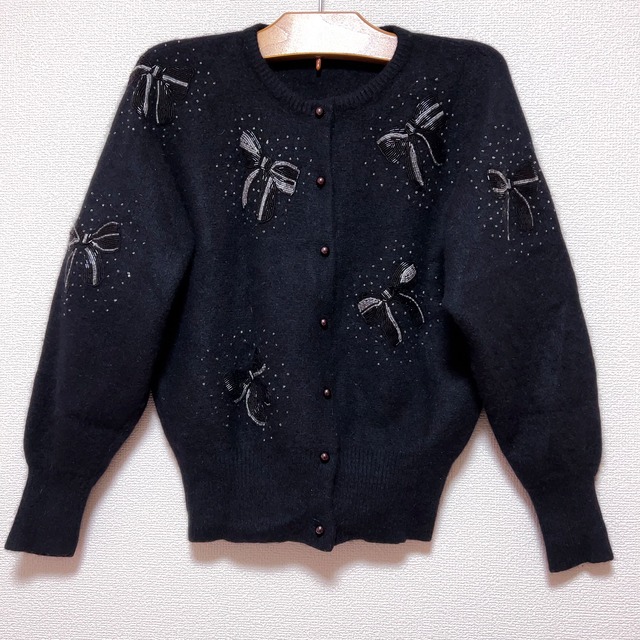ヴィンテージ日本製モヘアカーディガン。 柔らかな毛足の黒地に、ビーズ刺繍で象られた小さなリボンが点在し、光を含むようにきらめきます。 身体甘さは抑えめ、色数を絞った分だけ装いに馴染みやすく、重ね着の幅も広い一枚。 伸びがよく、軽やかな着心地で冬のレイヤードに寄り添います。 いたみもなく申し分ないコンディション。 *画像一枚目が実際の色に一番近くなるようにご用意しています。二枚目以降は質感・縫製等の参考にご覧ください。 着丈: 52 袖丈:60 身幅:50 流れ星を集めて、リボンを縫うための糸にしたそうな。 *** ▼この服がとりわけ似合う方 #骨格ウェーブ #ブルベ夏 #ブルベ冬