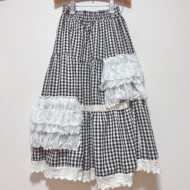 ボリュームたっぷりのギンガムチェックのフレアスカートをベースに、レースやフリルを重ねたリメイク作品です。 コットンレースのリボンテープのあるスカートへ、チュールとレースの三段フリルを左右アシンメトリーにトッピングしています。 裏地あり。 月と星をモチーフにしたパール加工ボタンを縫い付け、装飾性を高めました。 甘さと遊び心を詰め込んだ、夢のような一点ものです。 *画像一枚目が実際の色に一番近くなるようにご用意しています。二枚目以降は質感・縫製等の参考にご覧ください。 ウエストゴム、平置き33センチ伸縮性あり 着丈: 80 *** 雲に抱かれていい夢を。