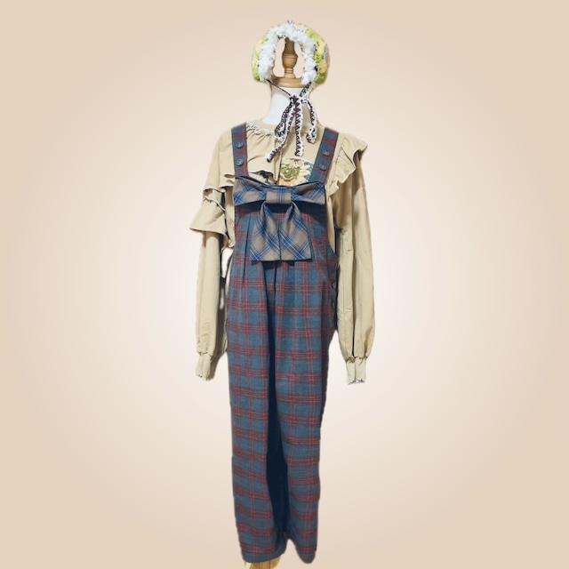 レトロなグレーチェックのサロペットパンツと、毛糸のヘッドドレスの2点セット。 サロペットは胸当て部分に別布で仕立てた大きなリボンが付いたデザイン。 シルエットは足首に向かって細くなるテーパード型で、すっきりとした印象です。 肩紐は長さ調整が可能なため、インナーのデザインや身長に合わせて着用できます。 真夏以外のオールシーズン着られる中厚手で、しっかりとした生地。コンディションは最高です。 両サイドには深めのポケットを配置。 ポケットはハート型で、リボン装飾付きの遊び心あるディテールです。 ヘッドドレスはモール毛糸を含む複数の毛糸を使用し、ふんわりとしたボリューム感。 顔まわりを華やかにしつつ、ほっこりとしたカントリーな雰囲気を添えてくれます。 単体でも、セットでも。 甘さと落ち着きのバランスを楽しめるコーディネートです。 *画像一枚目が実際の色に一番近くなるようにご用意しています。二枚目以降は質感・縫製等の参考にご覧ください。 *90年代以降のお品物です 着丈:最大127 身幅:57 サテンのリボンが手から滑り落ちる。昂揚する心が入ってる。 *** ▼この服がとりわけ似合う方 #骨格ウェーブ #骨格ナチュラル #イエベ春 #イエベ秋