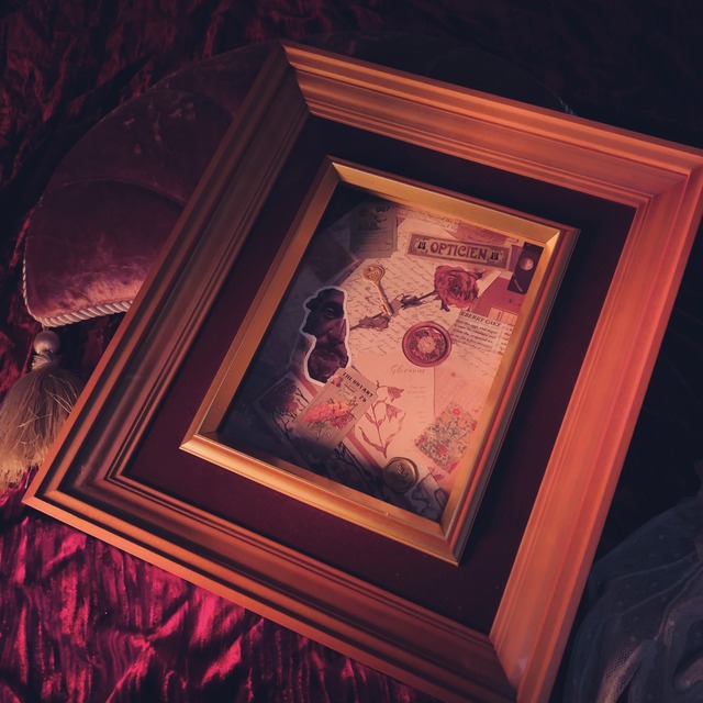 ヴィンテージ額縁インテリア。 ゴールドとワインレッドの二重フレームデザインの木製アンティーク額縁。 50〜60年ほど前の日本製、ガラスがあります。 二重式で美しく、新品に近いコンディション。 厚みがあり頑丈で、飾るだけで部屋が博物館のように。 飾る作品を選ぶまでの間のために、当館で作成したコラージュを入れておきました。 closet museumとあなた様のご縁をしたためます。 壁掛け金具はありませんので、市販の金具を木製部分へネジ付けください。 発送時は元々この額縁が入っていた箱を補強して緩衝材とさせていただきます。 サイズ センチ 横29 縦32 厚み4.5 作品が見える部分:14×17