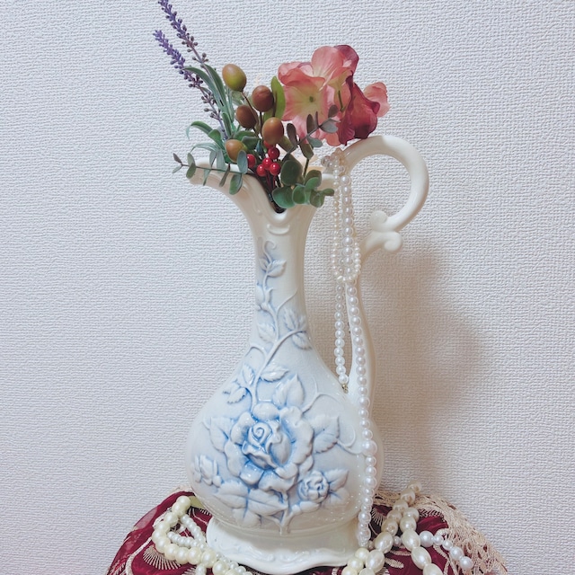 レトロクラシカルな陶器のフラワーベース。 大きく丸みのある曲線シルエットで、全体はミルク色。 表面には群青色の影を伴う薔薇のレリーフ装飾があります。持ち手が付いた形状で、水瓶やミルクポットのようなスタイルです。 口径が小さく、一輪挿しや存在感のある花材向きのデザインになっています。下部に向けてふくらむため、安定感があります。 大きめなサイズ感で、お部屋に置くだけで博物館のようなシックな印象へ。 目立つ傷や欠けはありません。 表面や底面にわずかな使用感は見られますが、全体として良好な状態です。 *** サイズ 縦35 横最大20 奥行き13 陶器 古代ギリシャでは、水瓶(アンフォラ)は“運命を運ぶ器”と呼ばれた。薔薇のレリーフは、愛の女神アフロディーテの象徴。 ミルク色の壺は、ギリシャの神々が飲んだ乳と蜜“ネクタル”を思わせる白さ。 花を差すと、静かに時代が重なる。