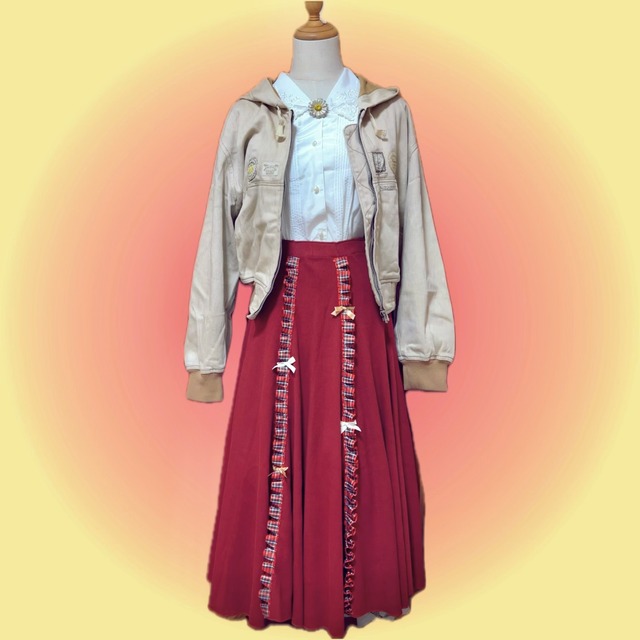 ヴィンテージ日本製スカート。 コットン100%のリブ生地をたっぷり使った、レトロなレッドのスカートに、赤チェックフリルとサテンリボンをトッピングしたリメイク品です。 縦ラインが強調されスタイルアップ。アンダースカートを着用するとさらにふわっとAラインになり、レトロガーリーさが上がります! 総ゴムなので楽ちん。 ※スカート本体以外のディスプレイ品は付属しません。 ※ジャケット、ブラウスは他ページでお求めになれます。 *画像一枚目が実際の色に一番近くなるようにご用意しています。二枚目以降は質感・縫製等の参考にご覧ください。 着丈: 78 ウエスト:平置き34 総ゴムで少しゆとりがあるので、普段の着用サイズが〜Sの方は大きく感じると思われます。 かわいいかわいい赤ずきん、オオカミには気をつけて。 *** ▼この服がとりわけ似合う方 #骨格ウェーブ #イエベ春