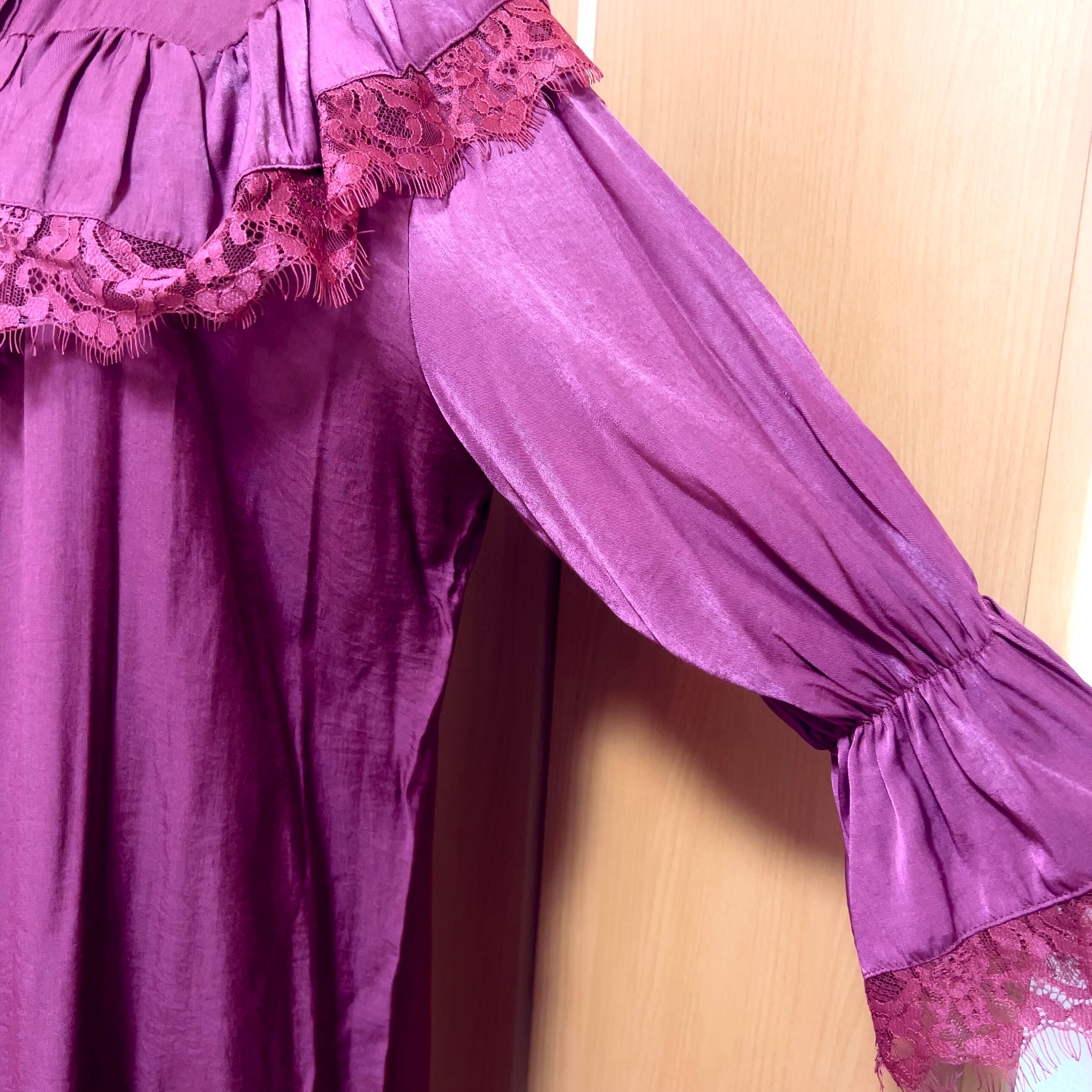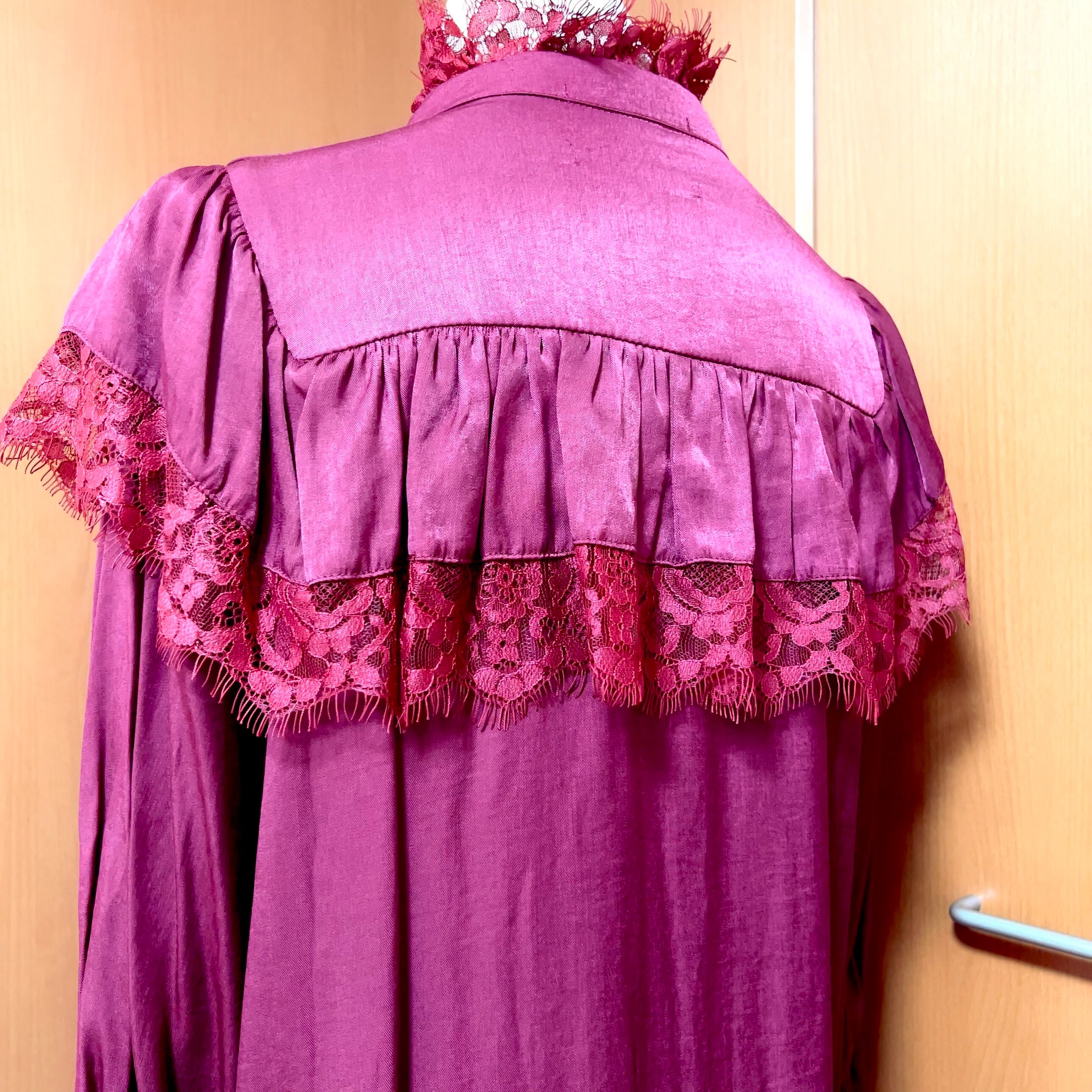 襟、袖にふんだんに縁取られたケミカルレースはフリルのたっぷりボリュームと相まって、クラシカルな印象へ。