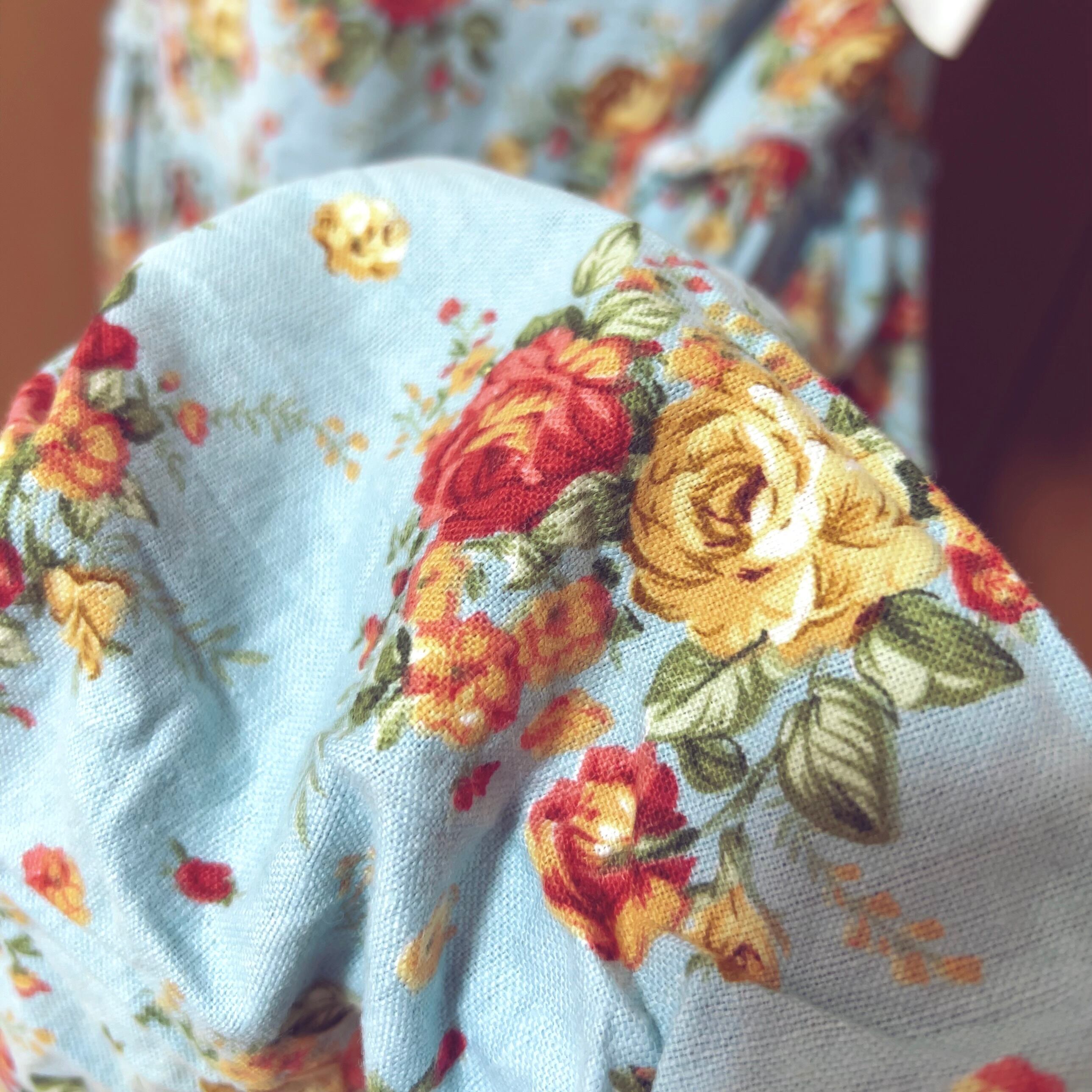 ヴィンテージフラワー柄と、ロマンティックに広がるマーメイドラインのキャミソールワンピース。黄みのあるブルーがレトロ感を味わえます。