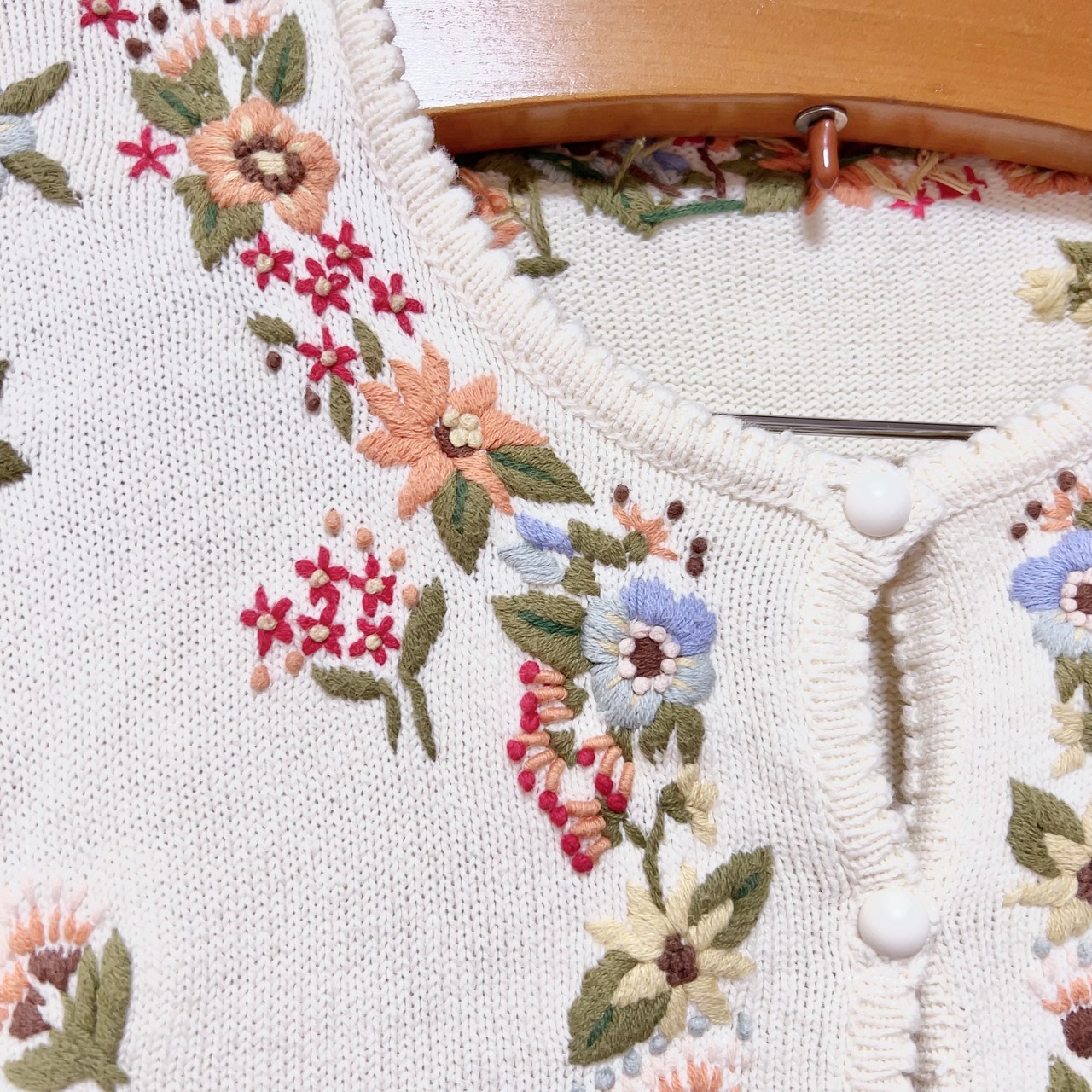 色とりどりの花の刺繍は見ているだけでも楽しい柄。肌寒い日に重ねるのにちょうどいい一枚。