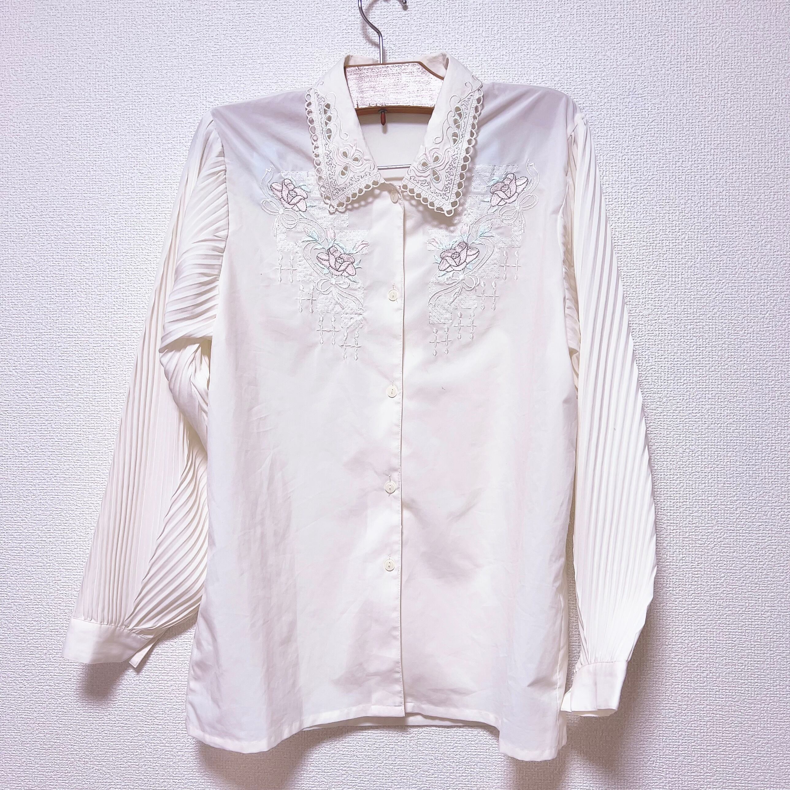 プリーツのたっぷりした袖と淡いピンクの花の刺繍と飾り襟が優美なブラウスです。