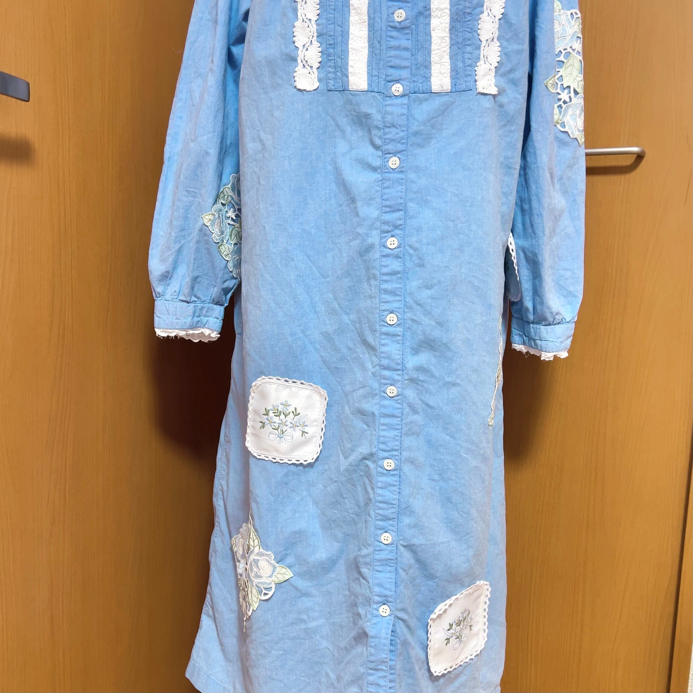 袖にできたシミはヴィンテージの素材を使って、デザインと目隠しを兼ねています。素材はホワイトと淡いブルーで統一してイノセントな雰囲気を保つようにしました。