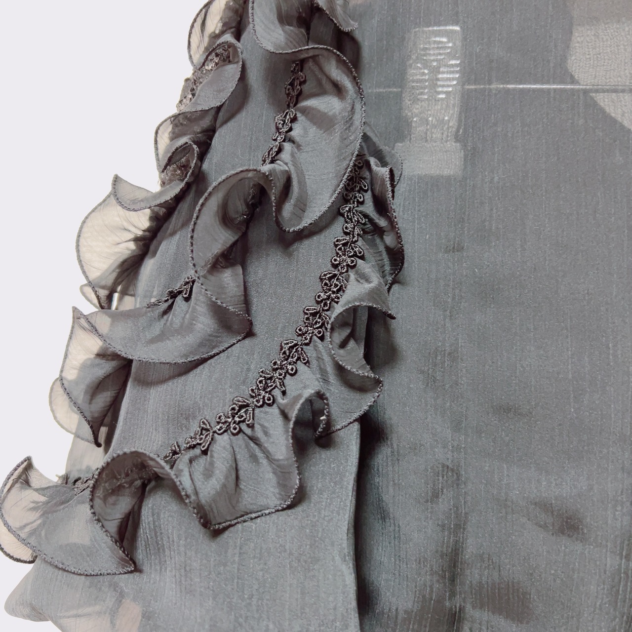 ウエストには絞りがあり、幾重にも重なったオーガンジーフリルが優しくスタイルカバー。