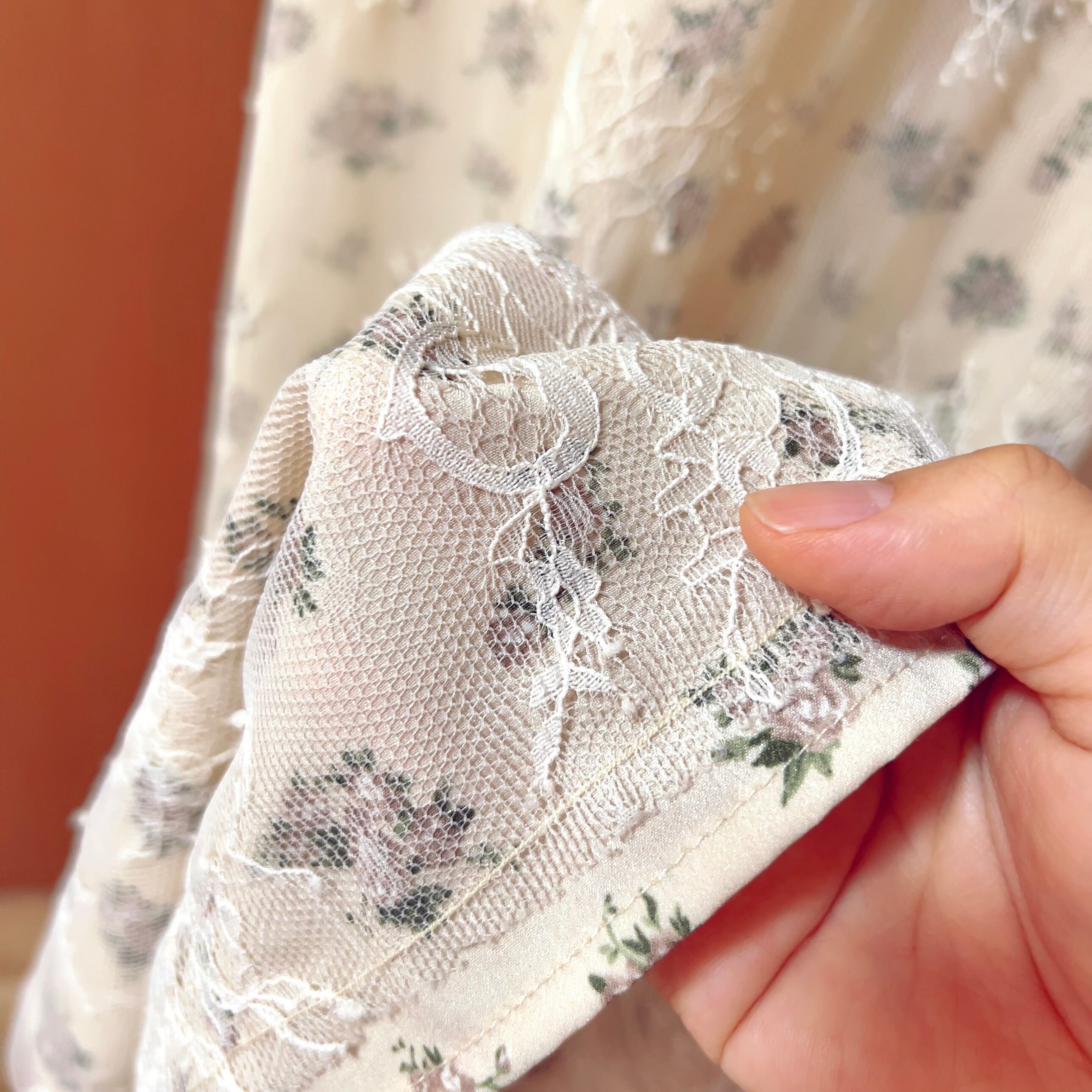 優しいベージュの花柄にチュールがふんわりとかかったワンピースへ、オーガンジーフリルとコットンのリボン、袖のオーガンジーリボンのたっぷりトッピング。