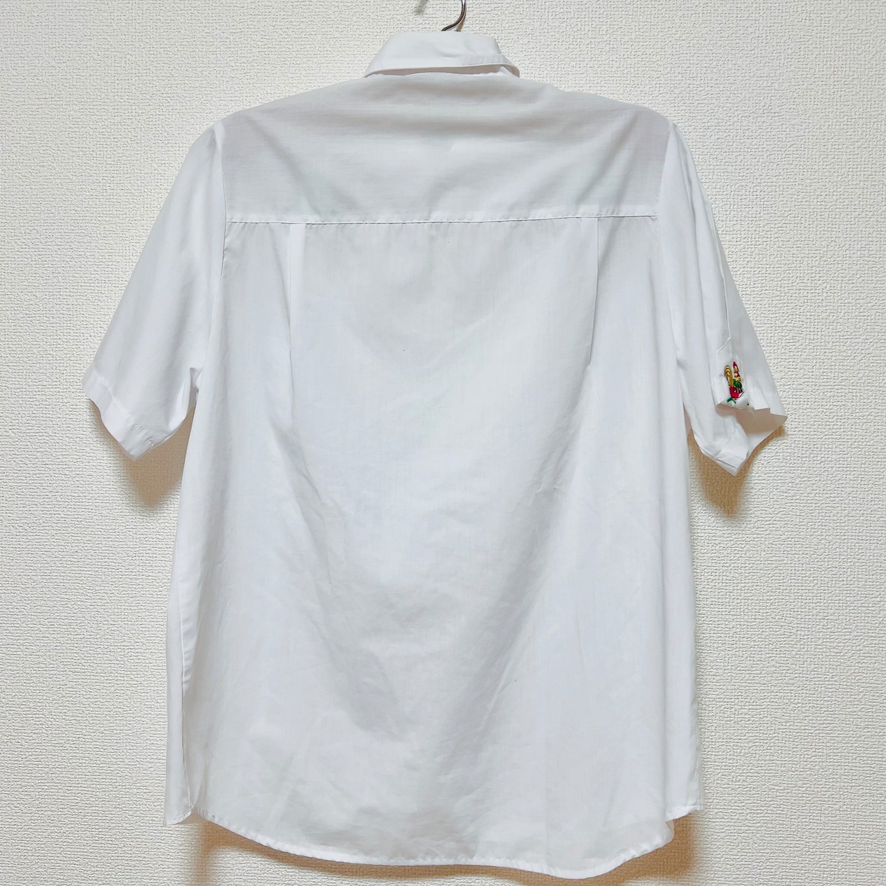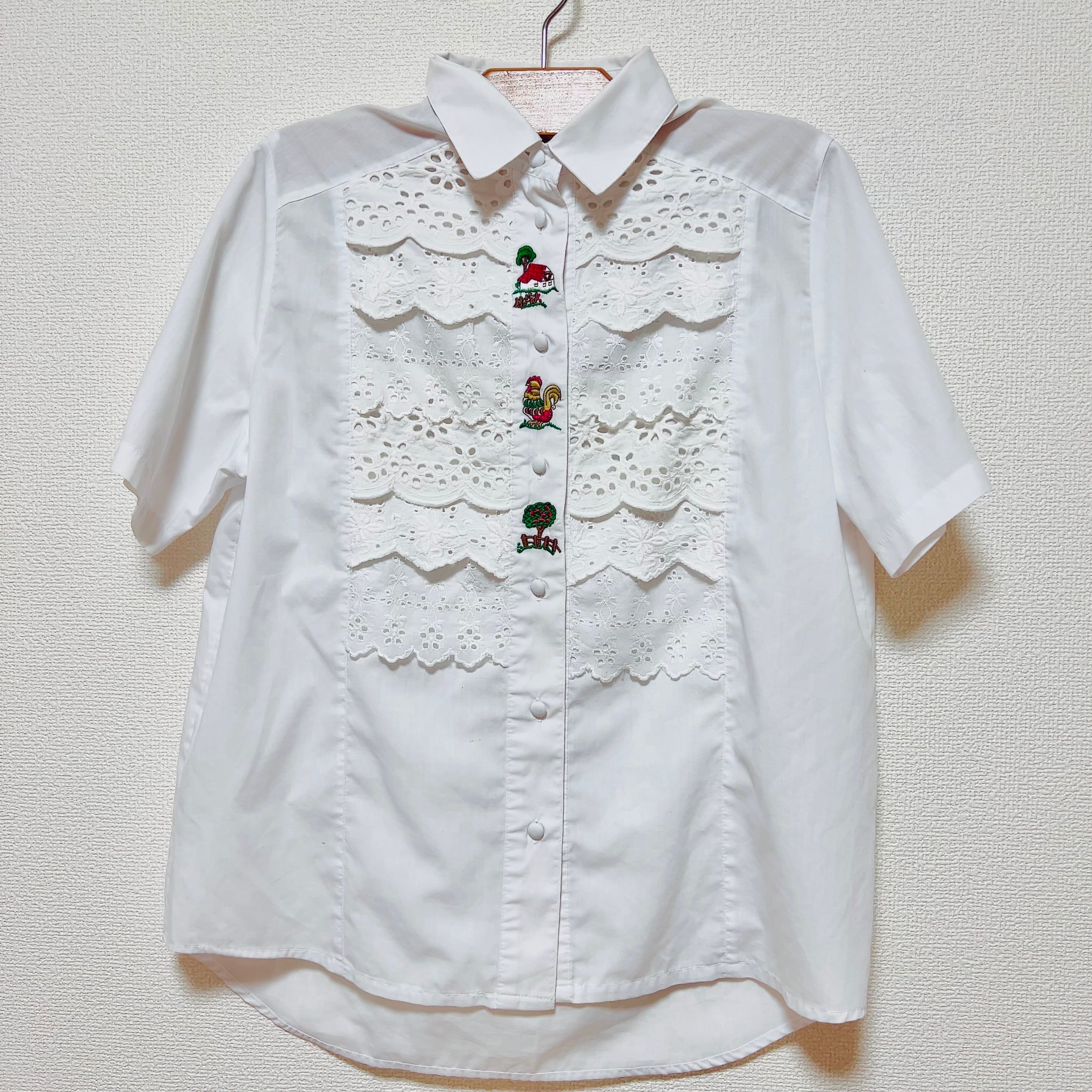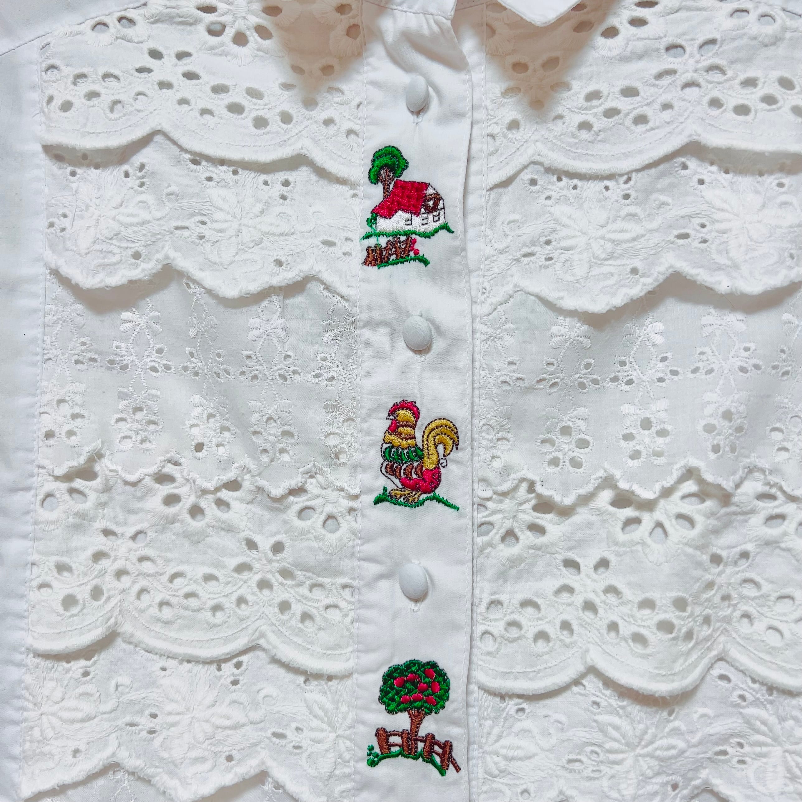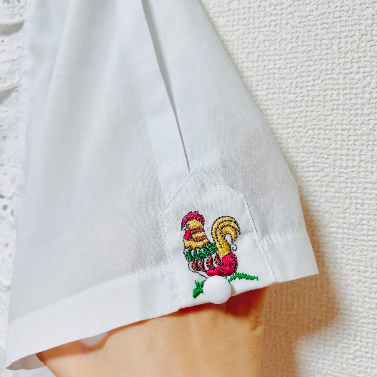 メンズライクな形のシャツにフリルレースがついているユニークなシャツでありつつ、さらにニワトリの刺繍がされている唯一無二な1着。