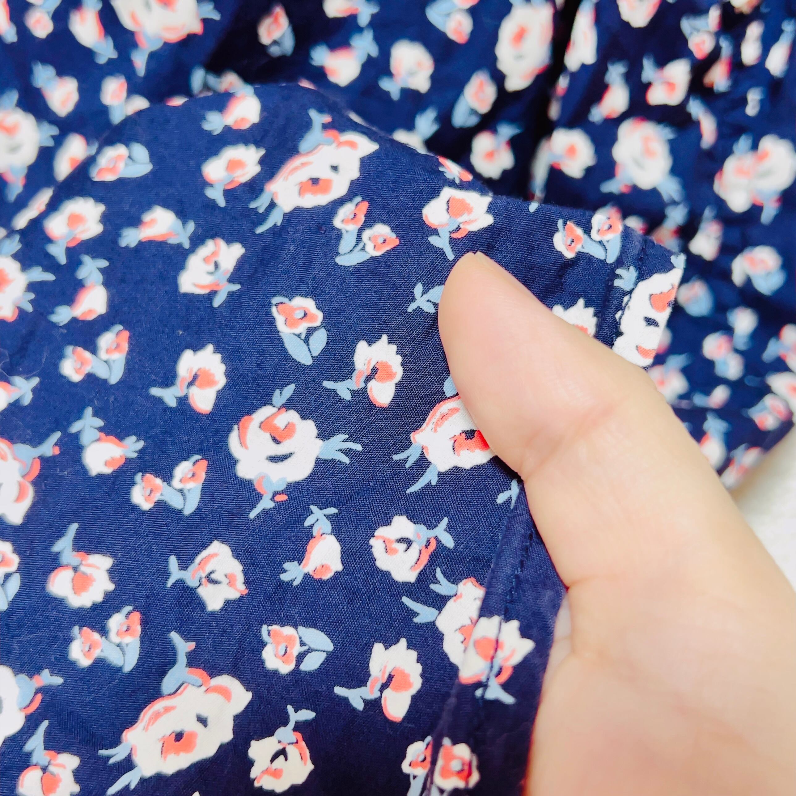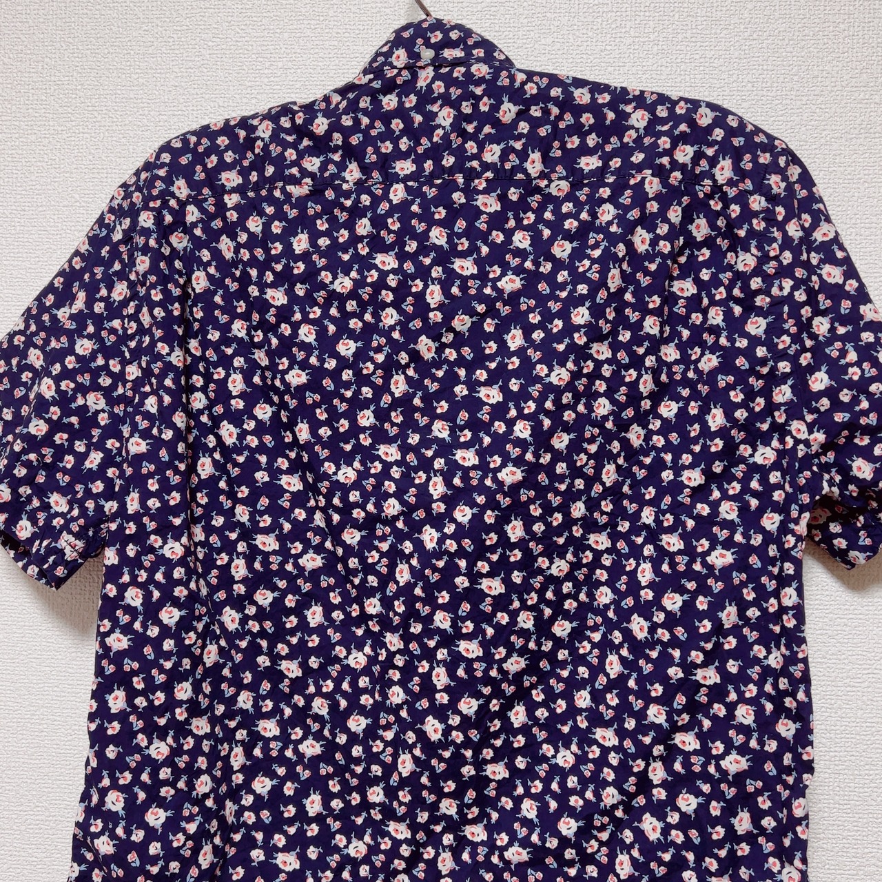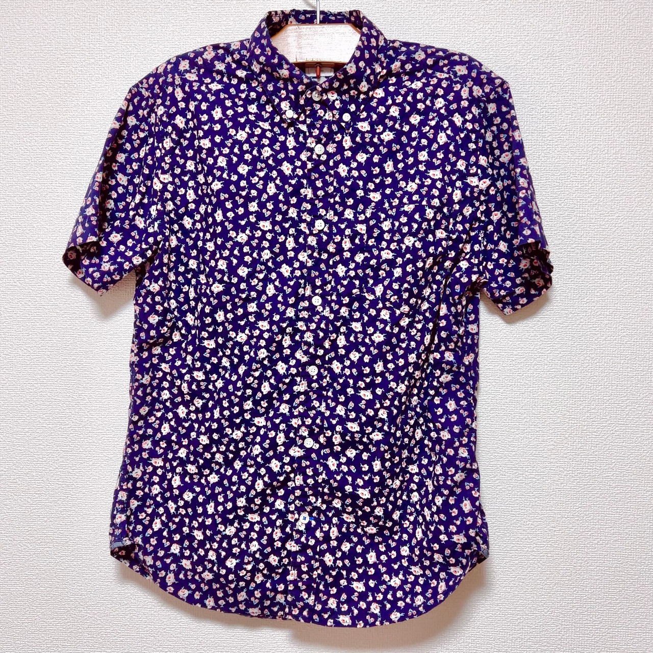 メンズシャツといっても小さめでレディースサイズ。ネイビーの生地にピンクの花柄がキュート♡