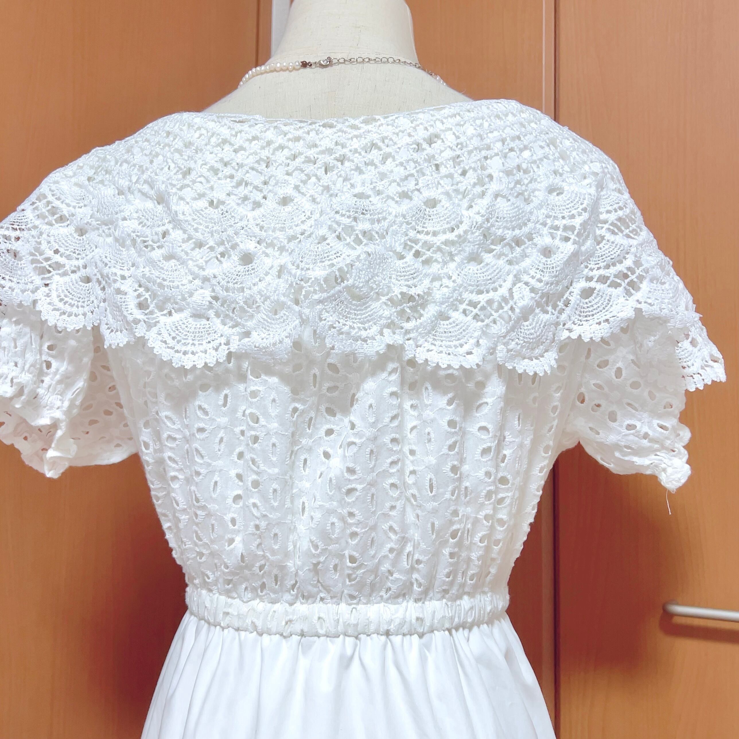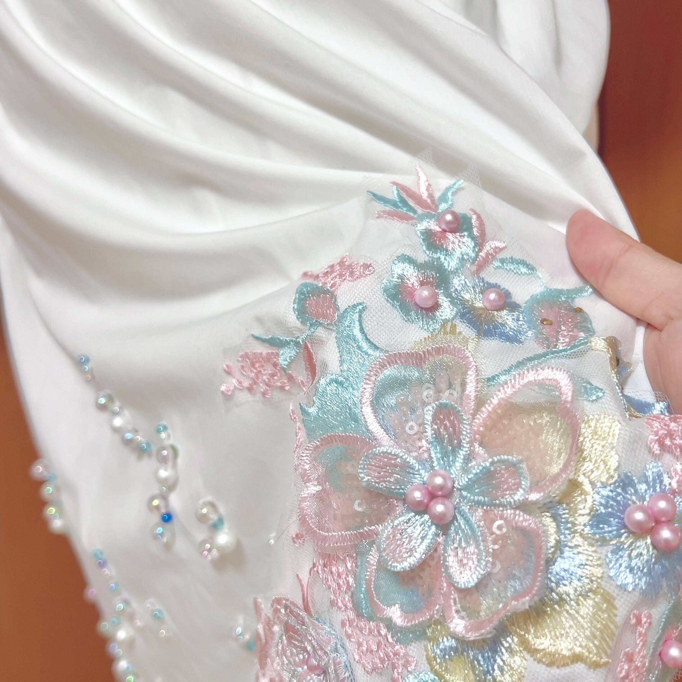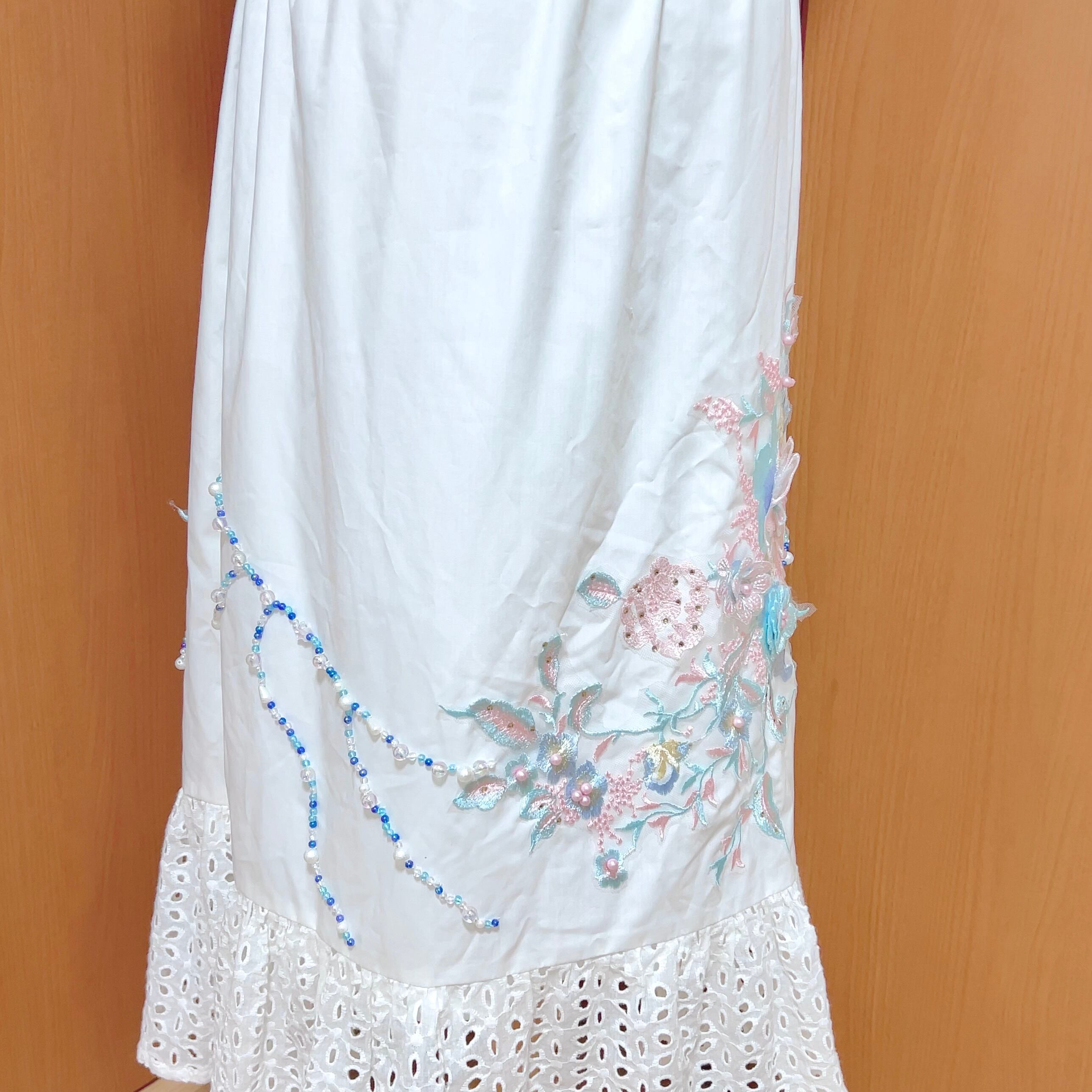 ホワイトのコットンレースのワンピースに、華やかなピンクやブルーの花柄刺繍と、夏の日差しにきらきら反射するブルートーンの波しぶきのビーズ刺繍。