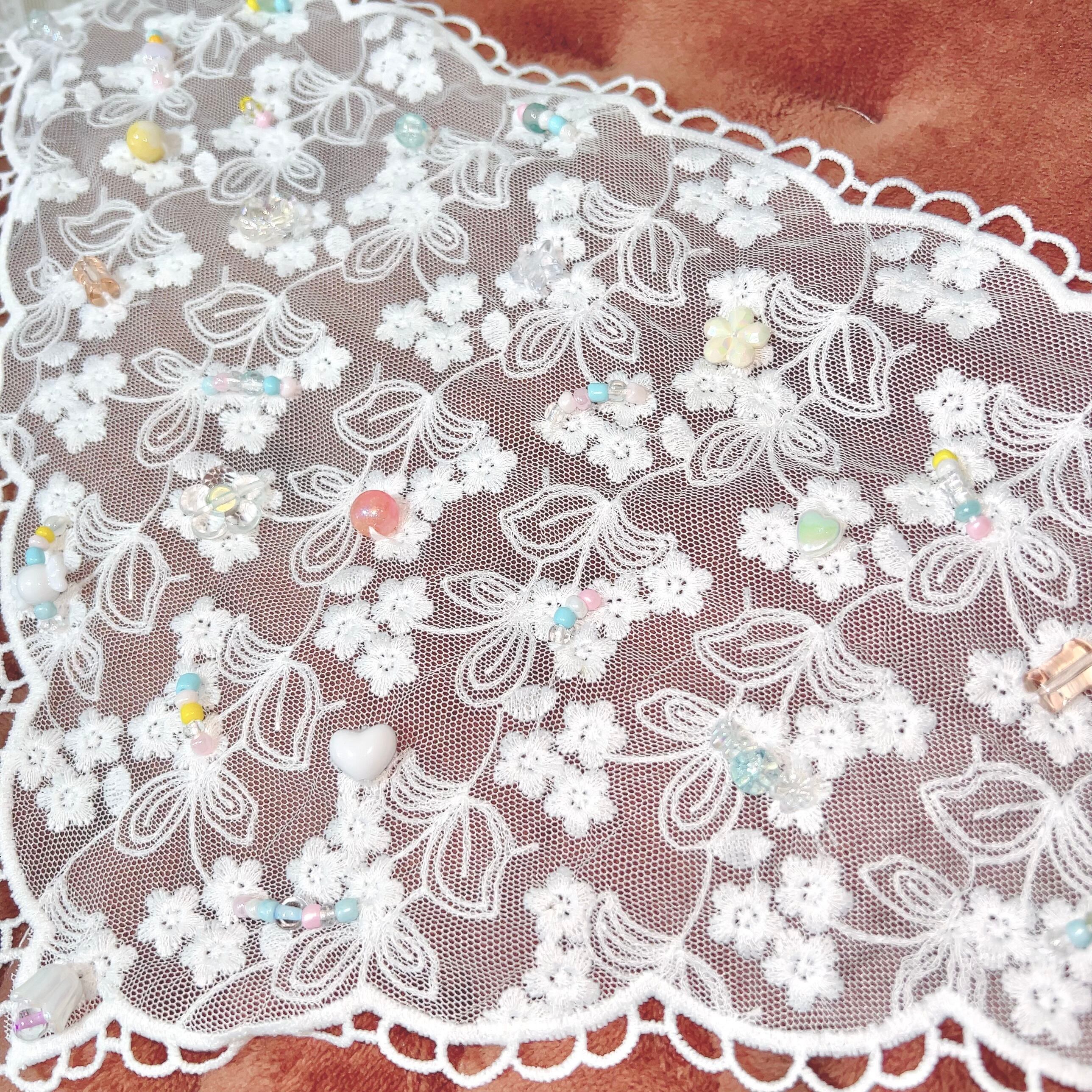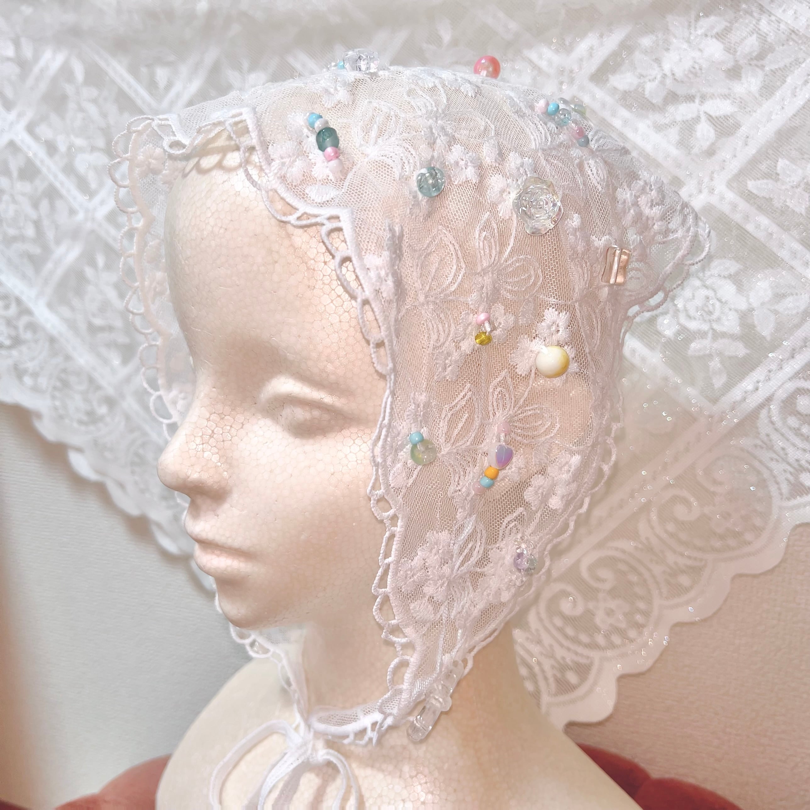 カラフルなガラスビーズとアクリルビーズをたっぷり散りばめたキャンディの雨のようなヘッドドレスです。