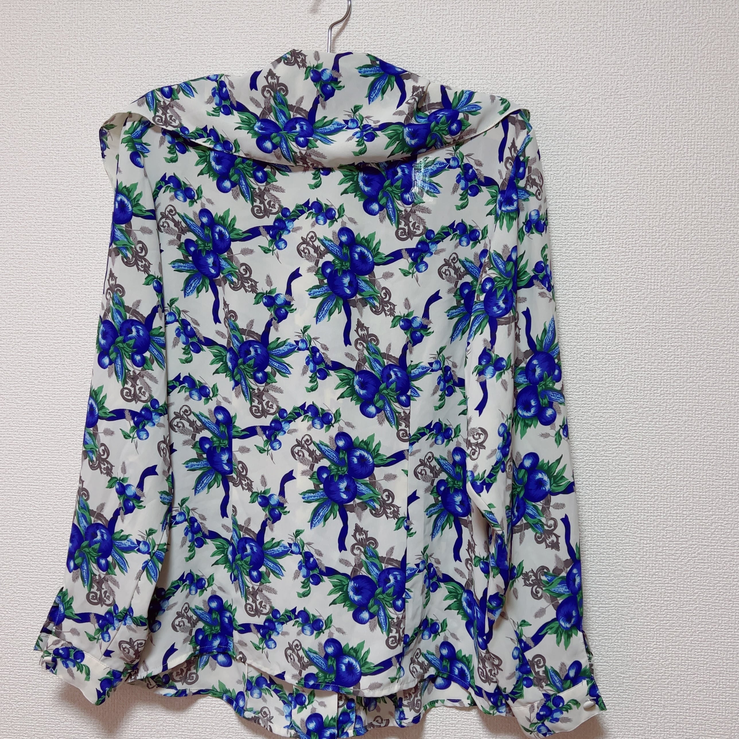 オイスターホワイトの地色にブルーベリーとリボンの柄のレトロクラシカルな一枚。