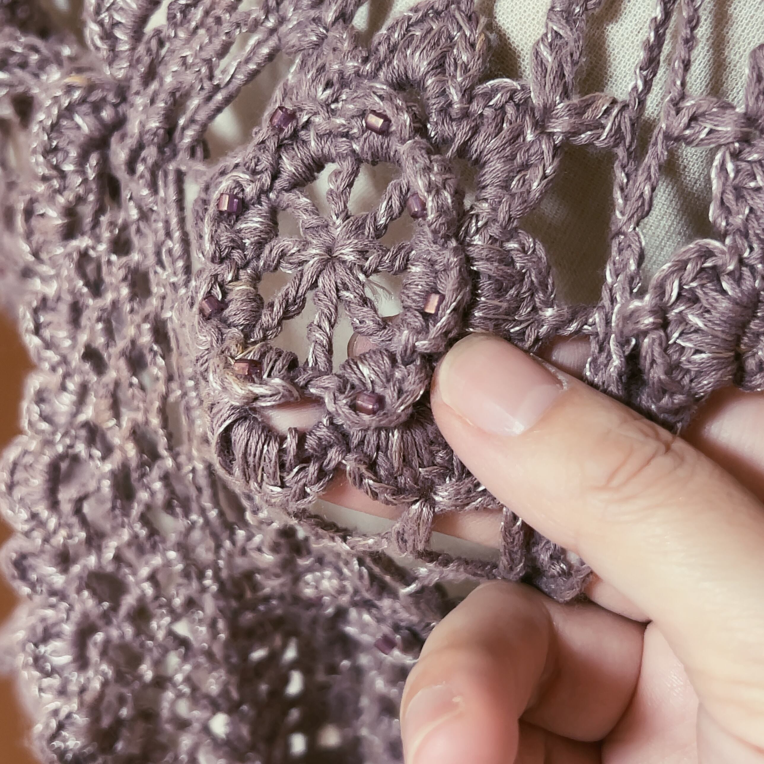 くすんだパープルのざっくり編みニットは長い季節着用いただけます。