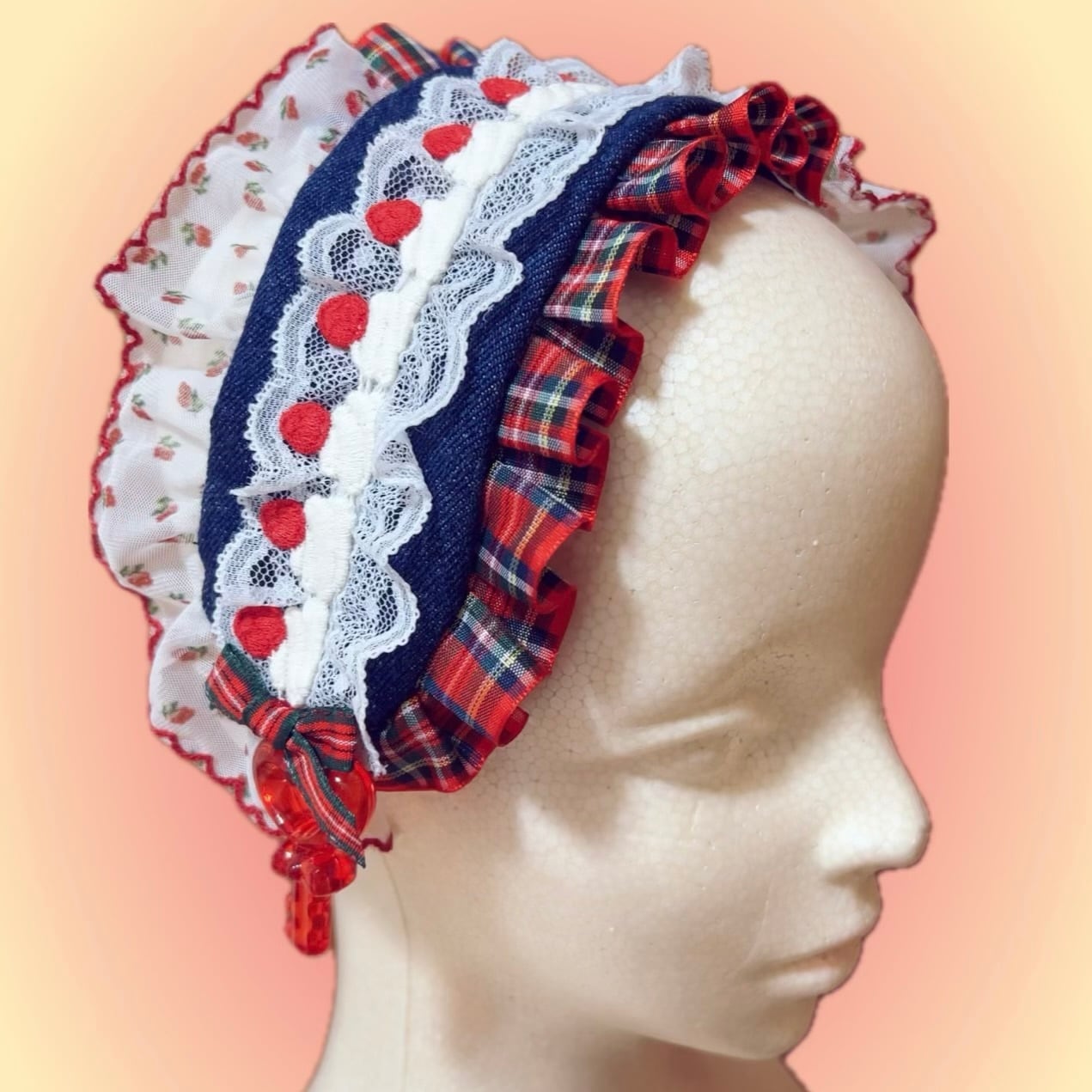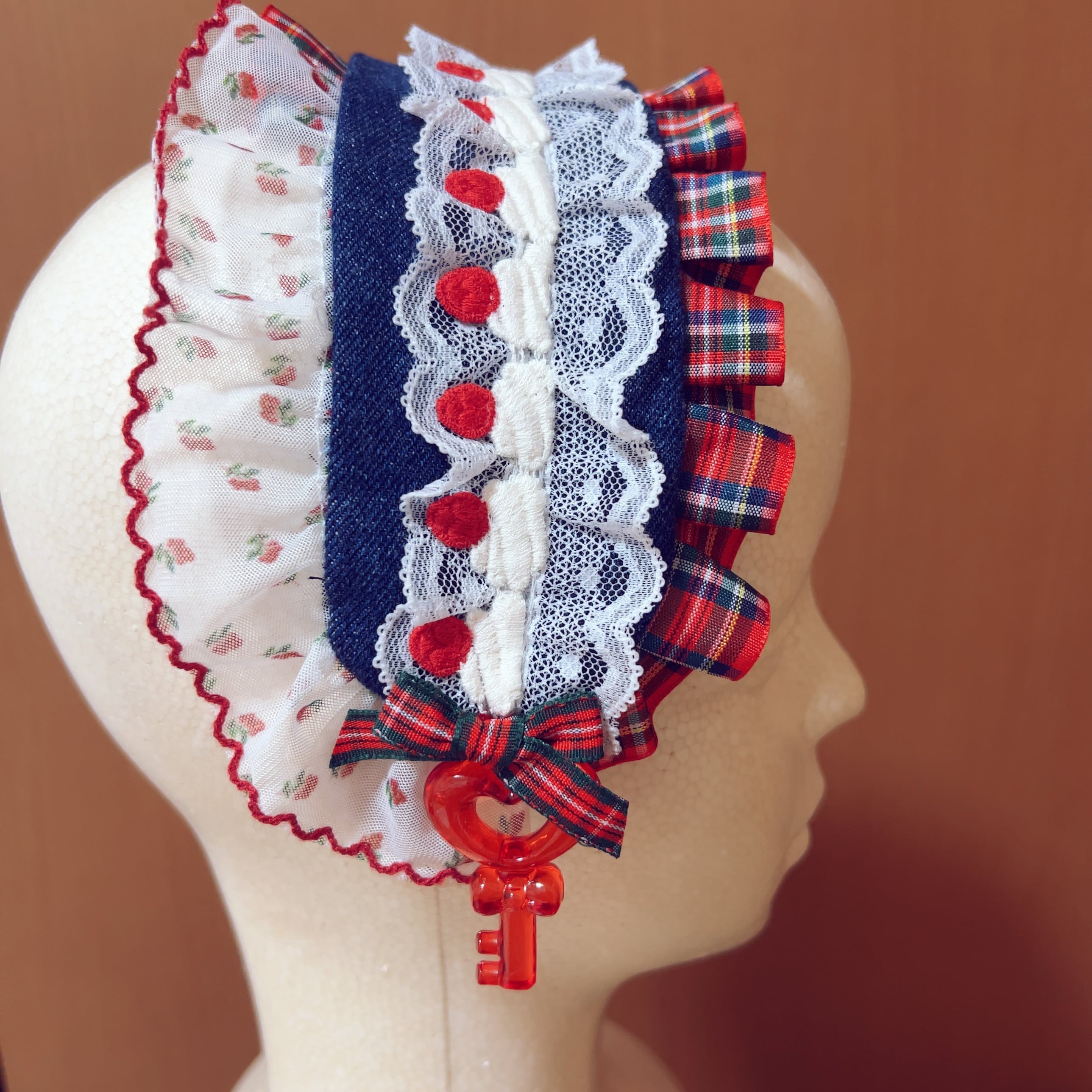 デニムに赤チェックとシアーフリルを使ったヘッドドレス。いちごショートケーキの刺繍ブレードと赤のアクリルハート鍵モチーフがとびきりキュート。