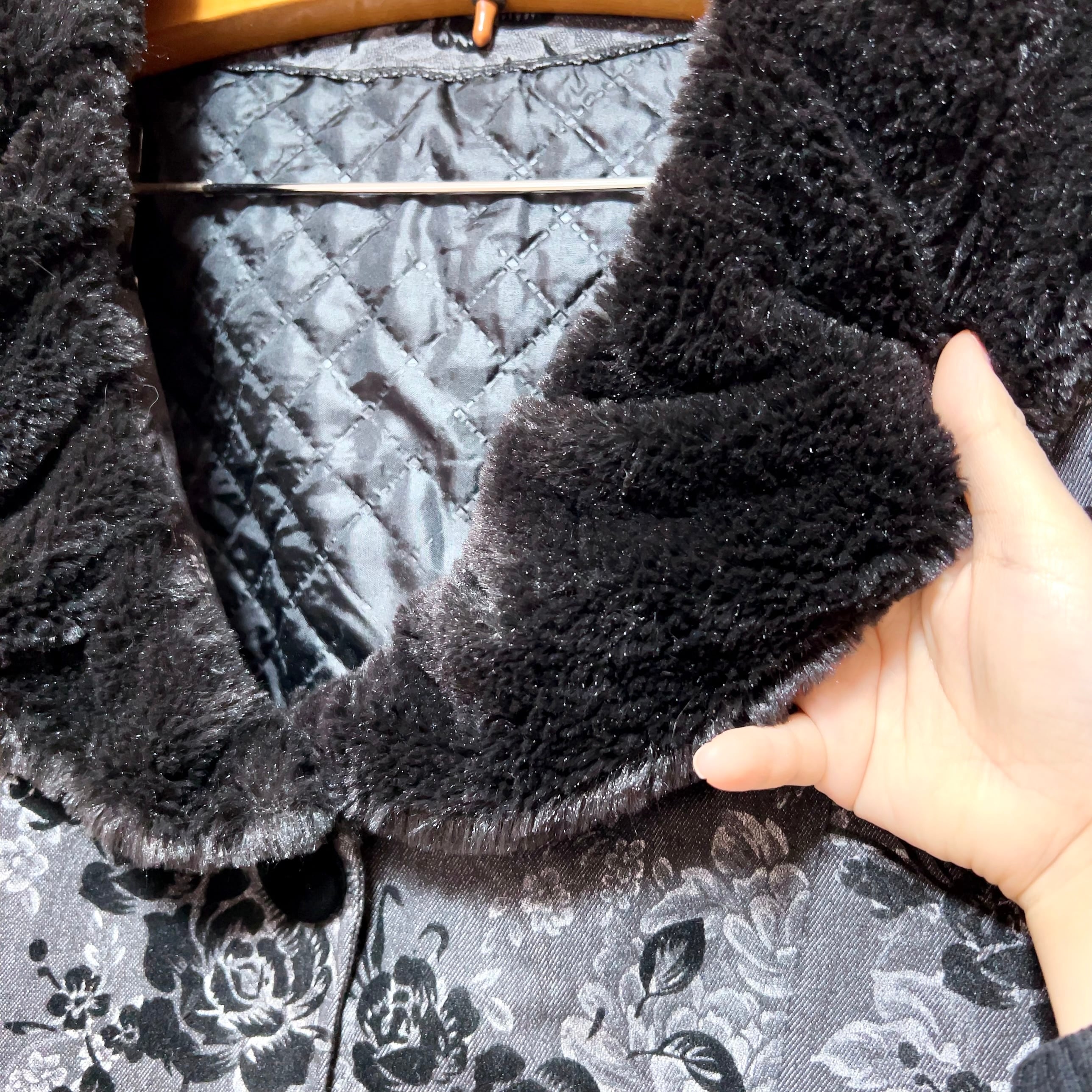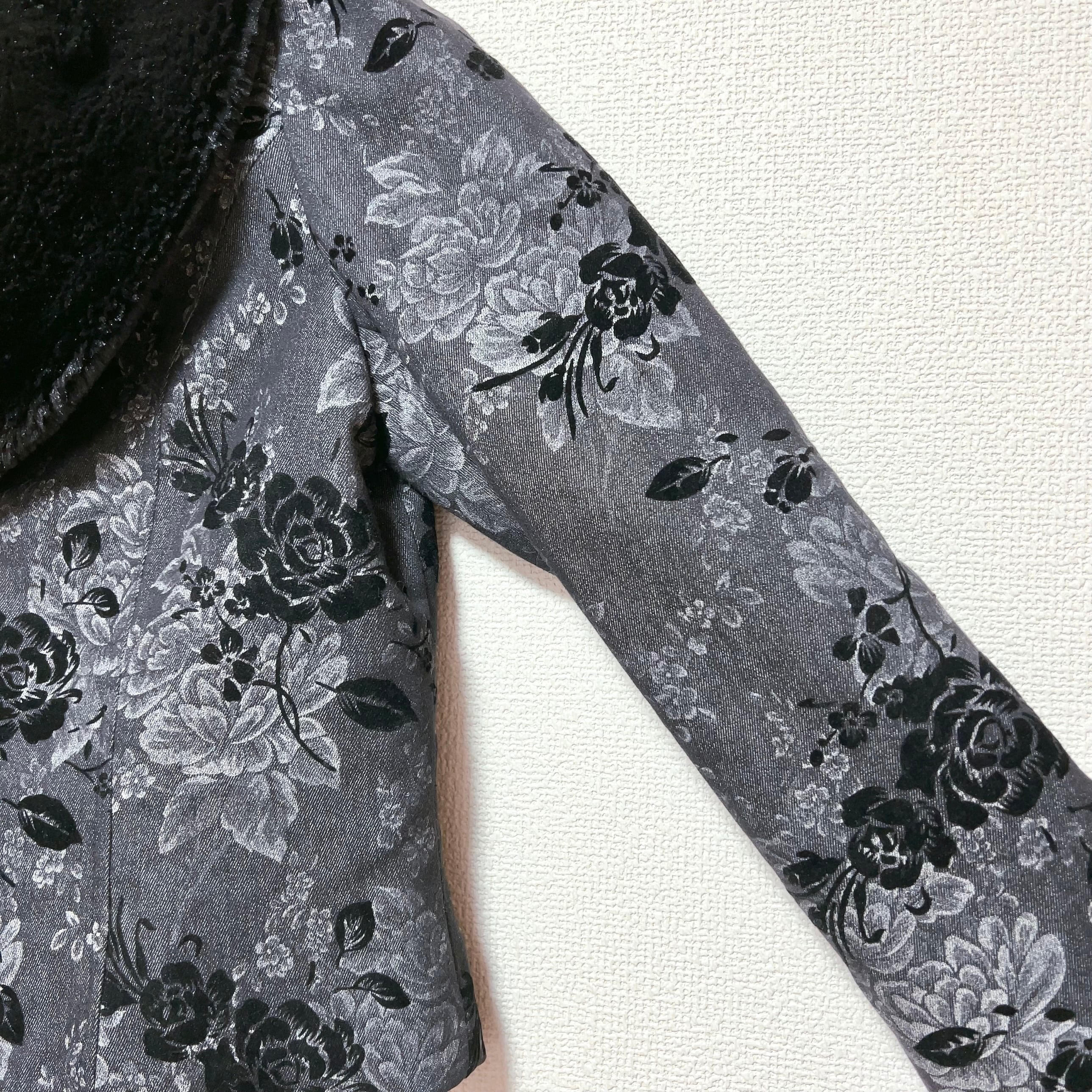 ショールカラーに黒のファーをあしらった、どこまでもクラシカルなジャケット。