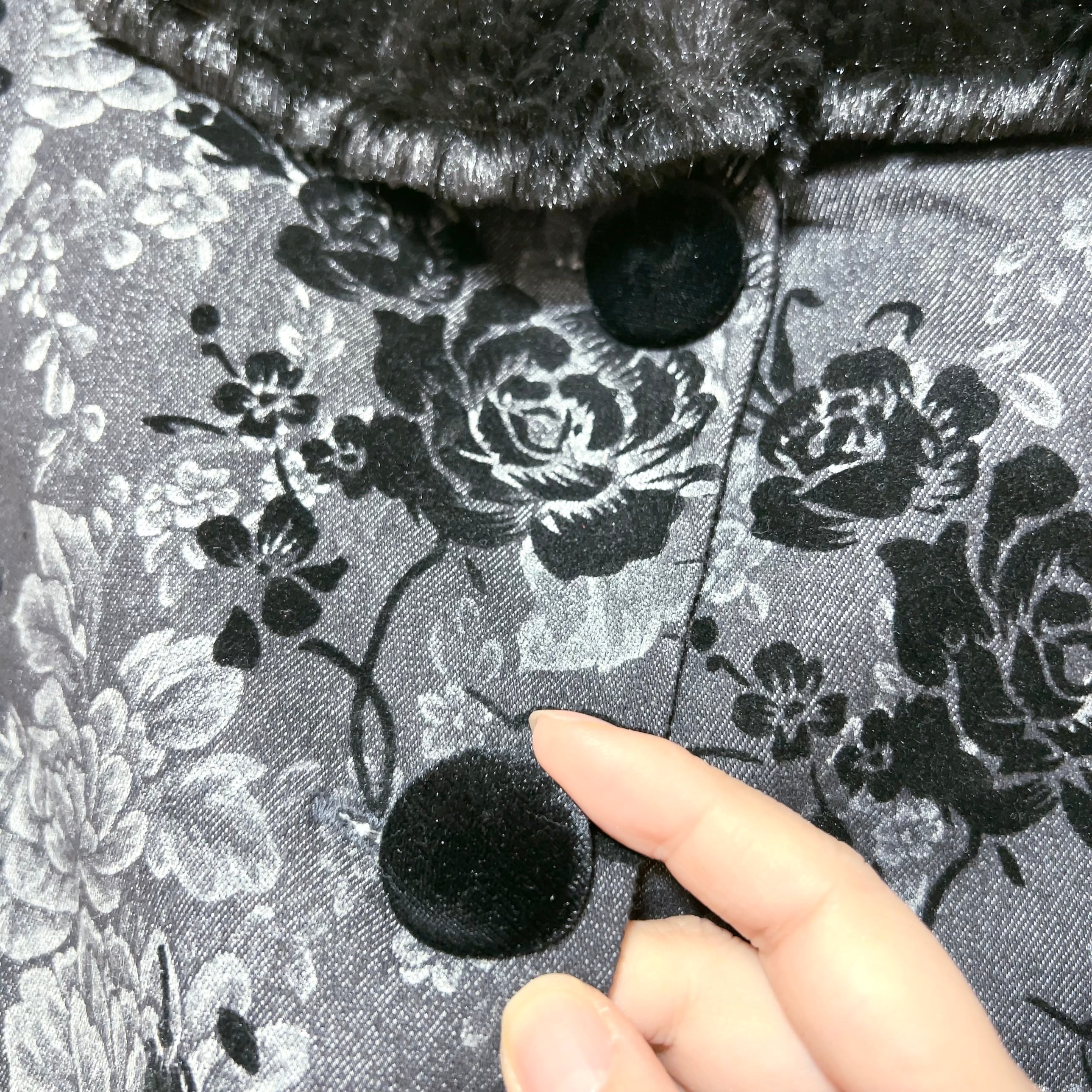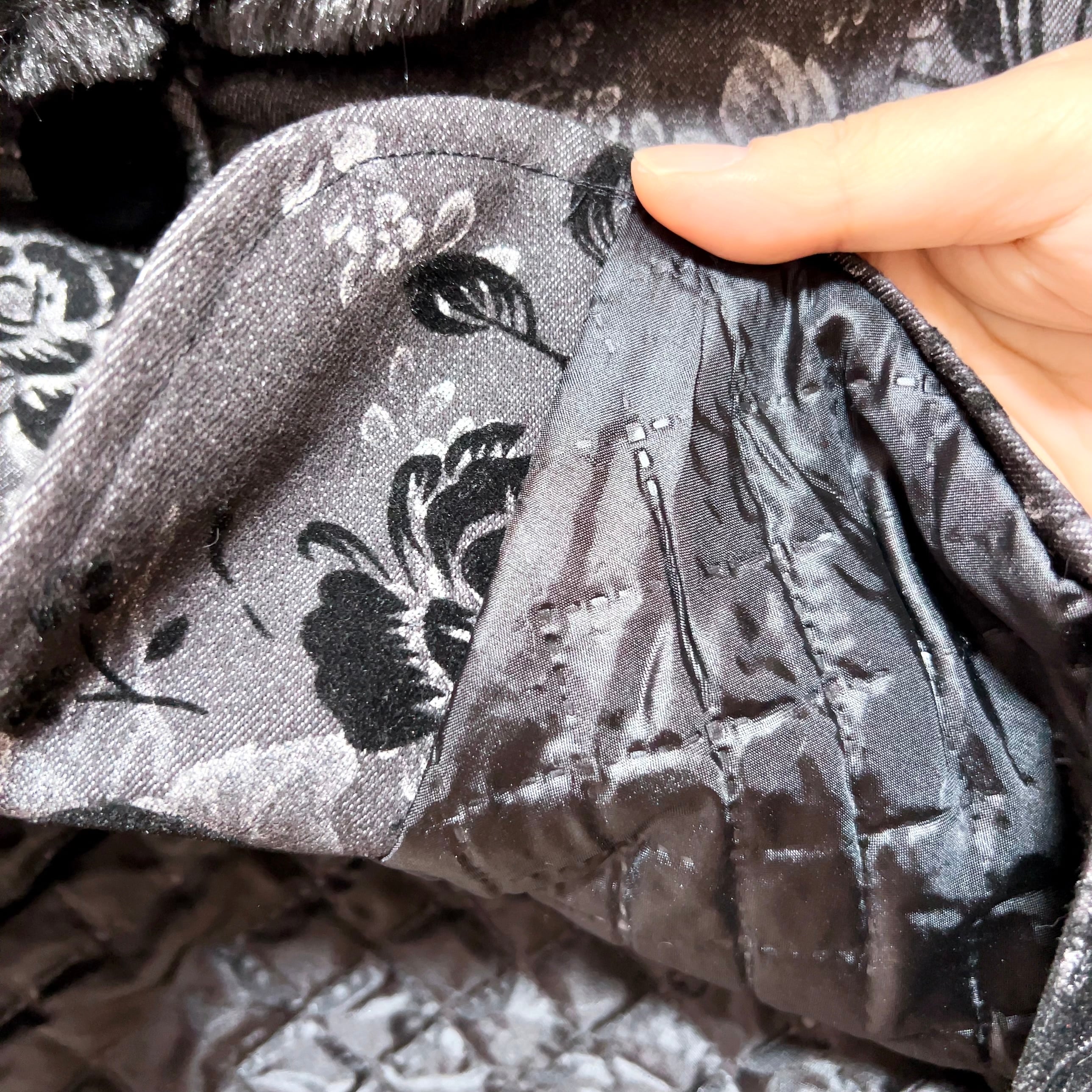 グレーの生地には表情があり、黒い薔薇をフロッキー(短い起毛)で上から重ねてあるシックな柄です。