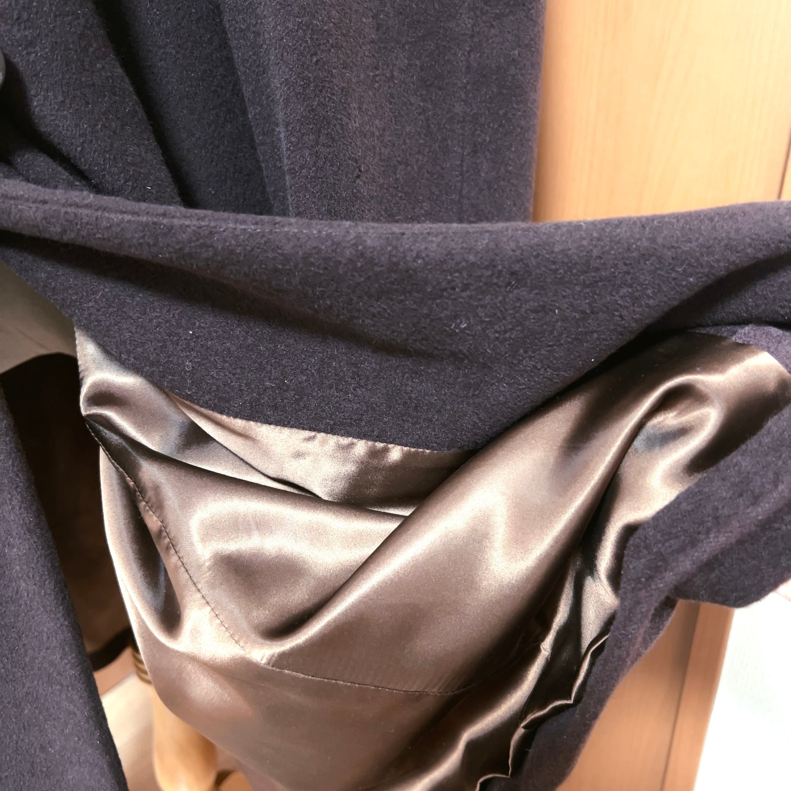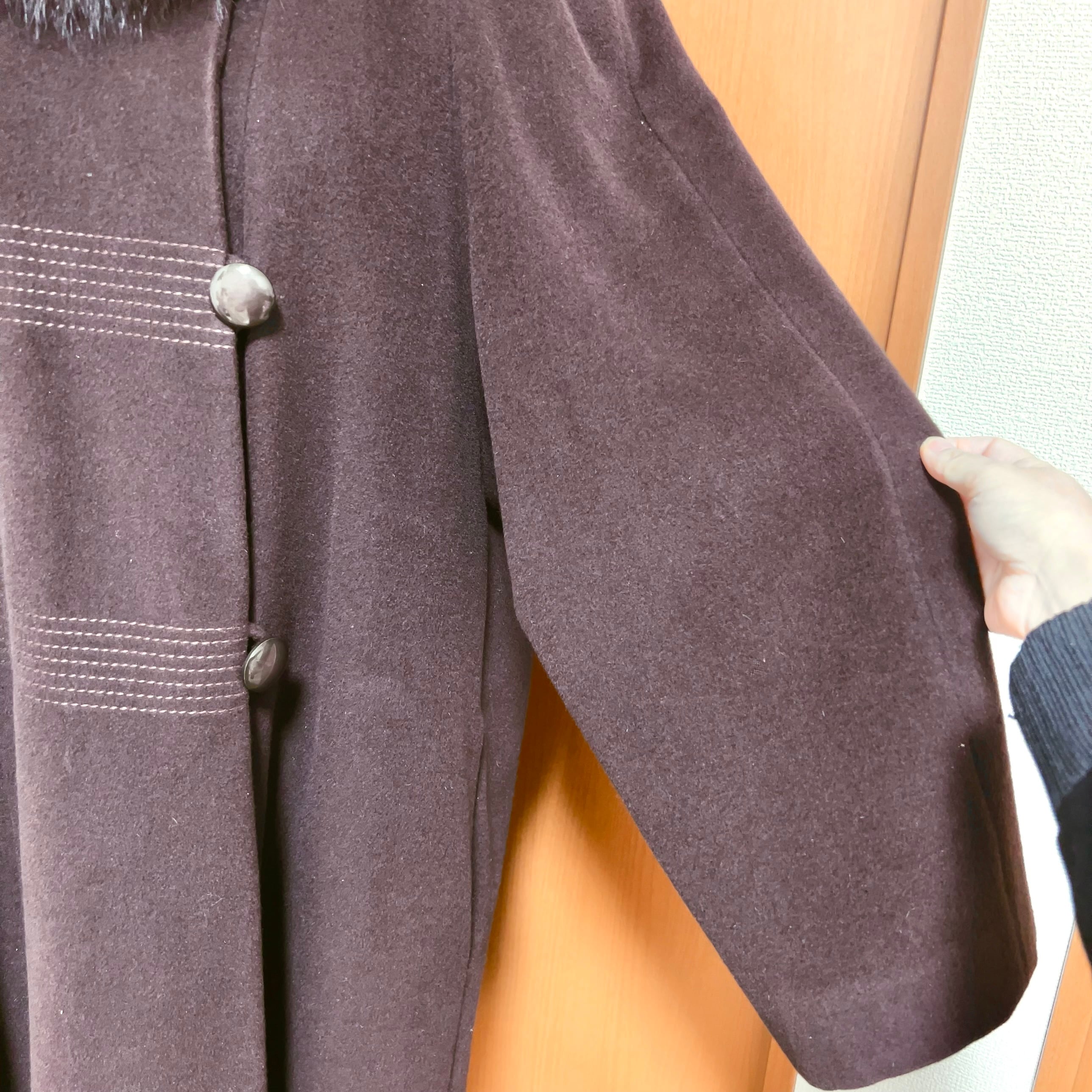 身幅の広いココア色のこのコートは、裏地がすべすべのサテン地なので冬場にさっと羽織れるのに上質な着心地をくれます。