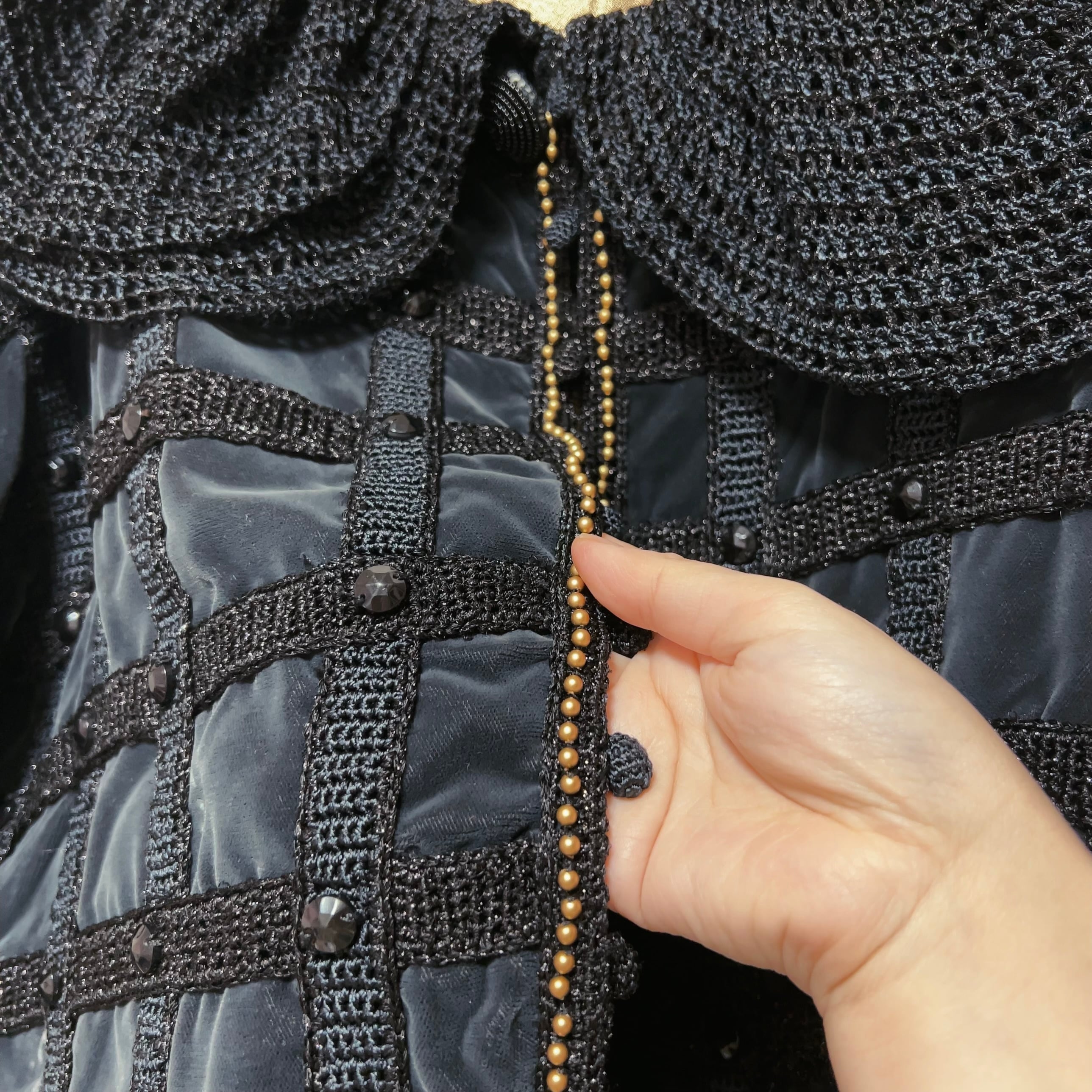 贅沢な黄金色の裏地、ビーズや金色のブレード、飾り、ニットのショールカラーなど、レトロクラシカル全開のジャケットです。