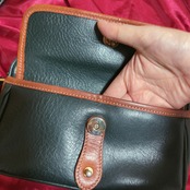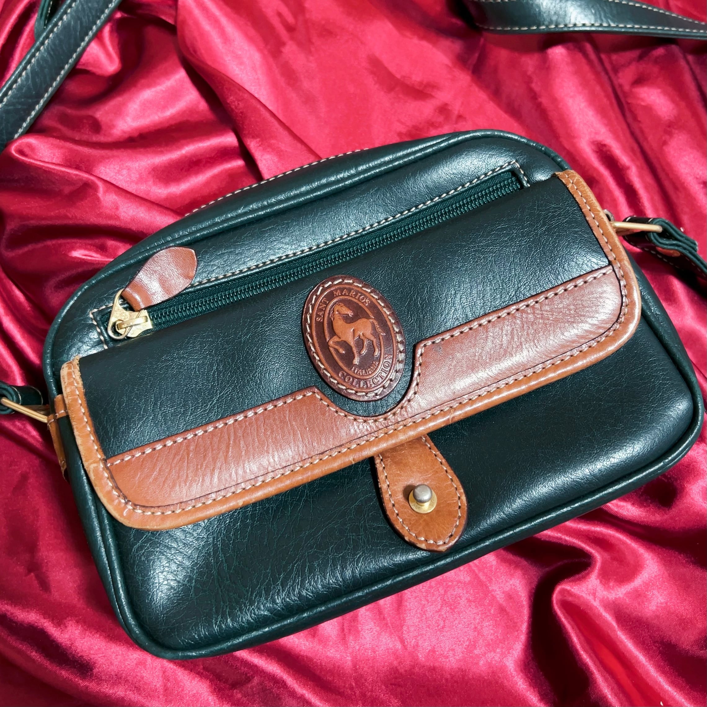 深いグリーンの柔らかな生地にブラウンカラーの刻印レザーがついた、コンパクトなショルダーバッグ。