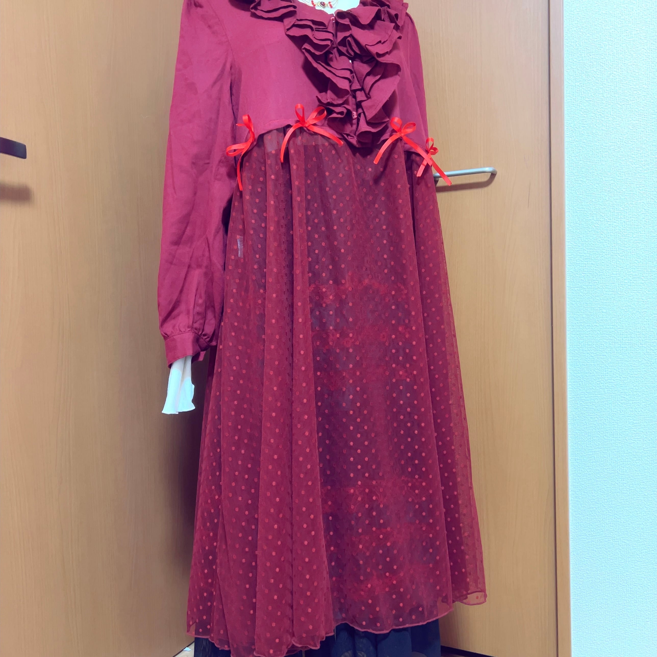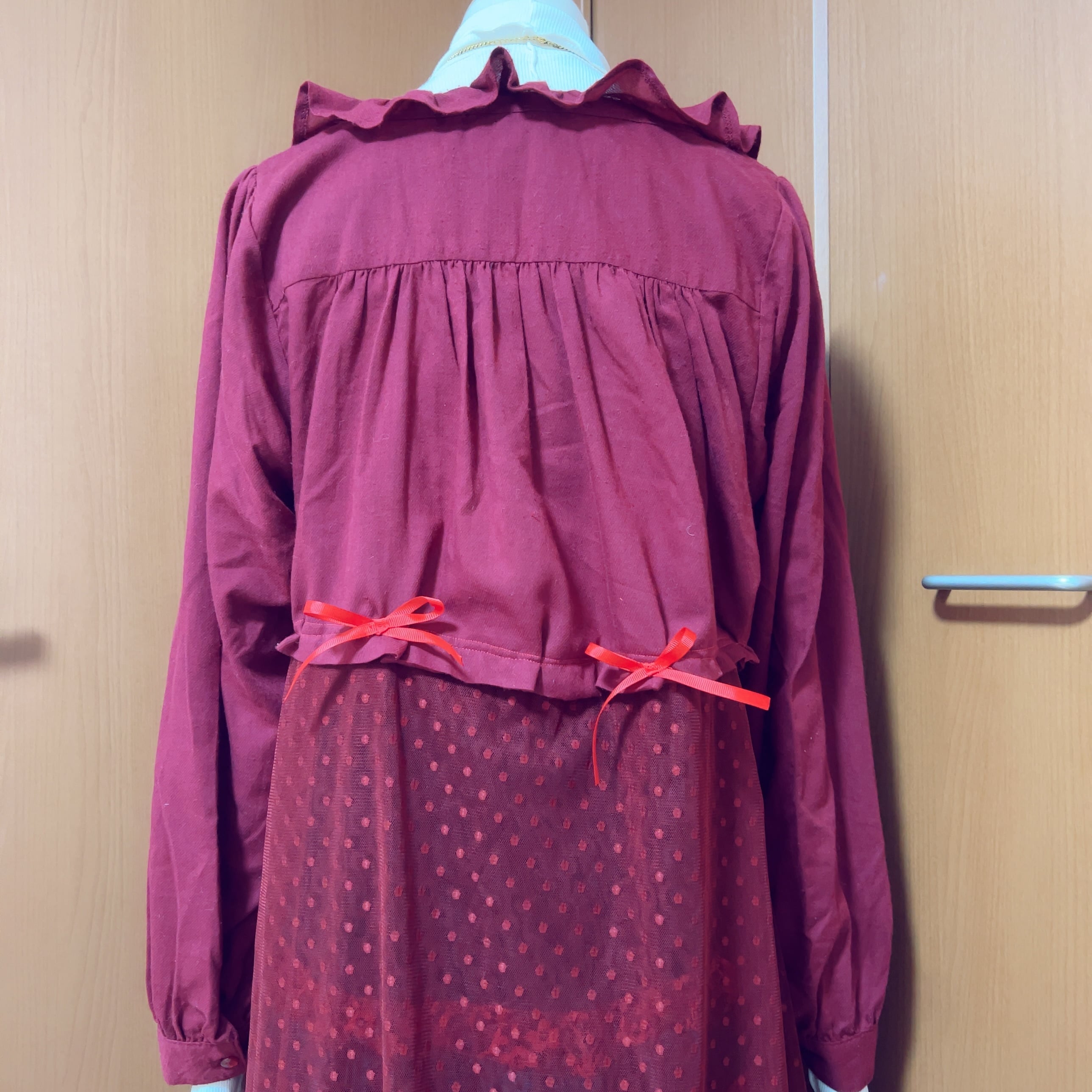 葡萄酒色のフリル襟チュニックをショート丈に仕立て直し、同色のドットチュールを二重に重ねて透け感の魔法をかけた、特別仕立てのリメイクオーバーワンピースです。
