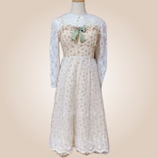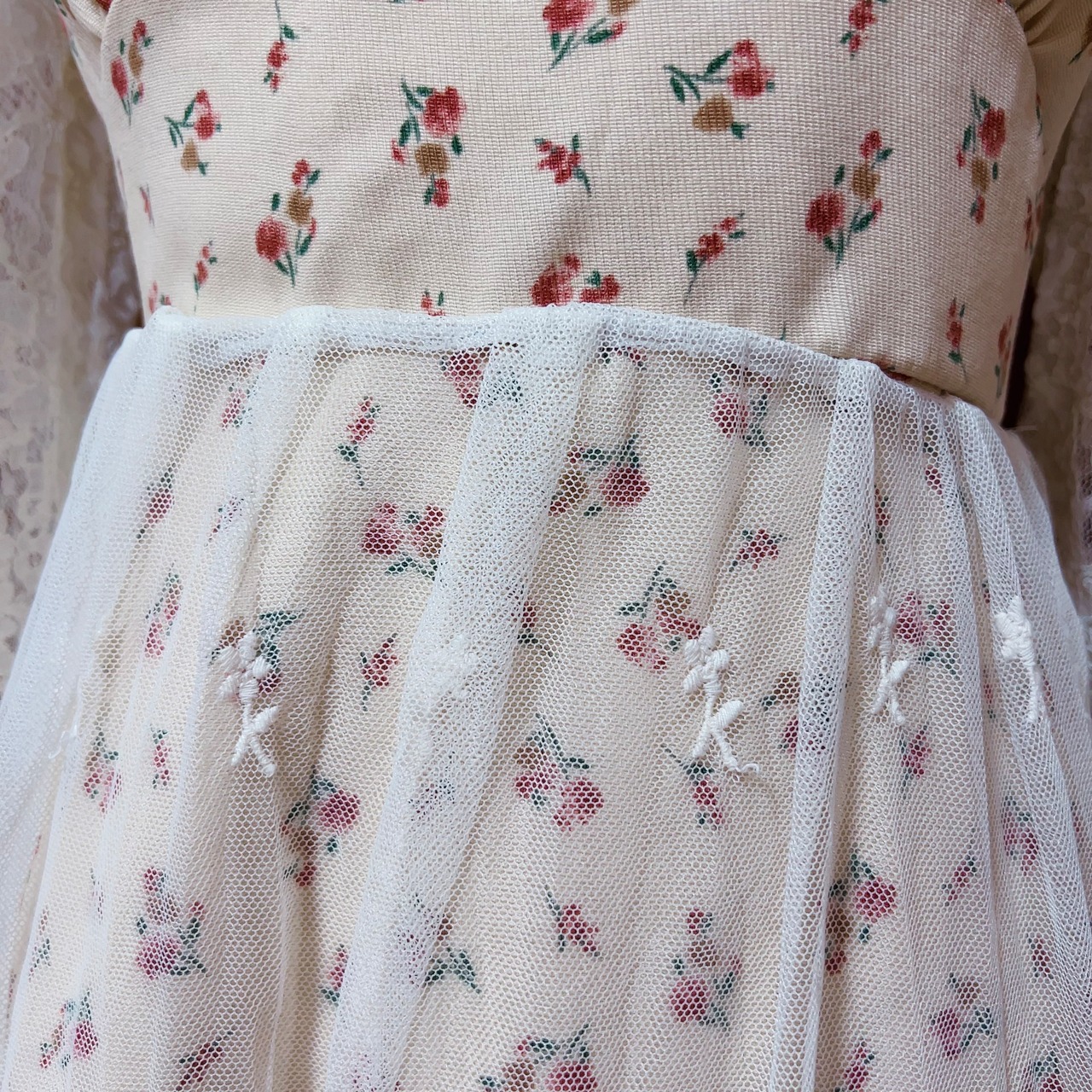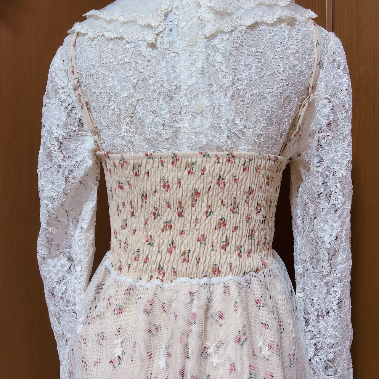 腰から下は刺繍入りチュールを重ねたオーバースカート仕様。裾にはさらにレースフリルを添え、奥行きのある表情に。