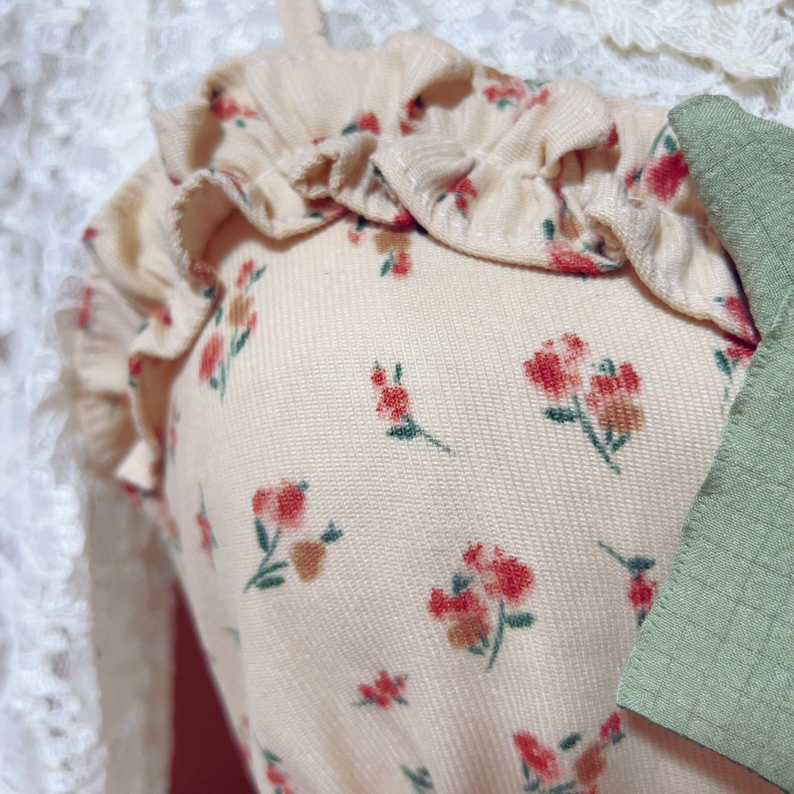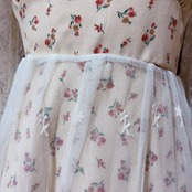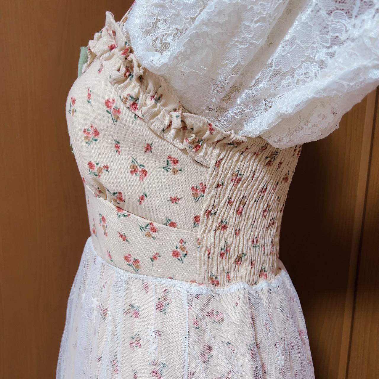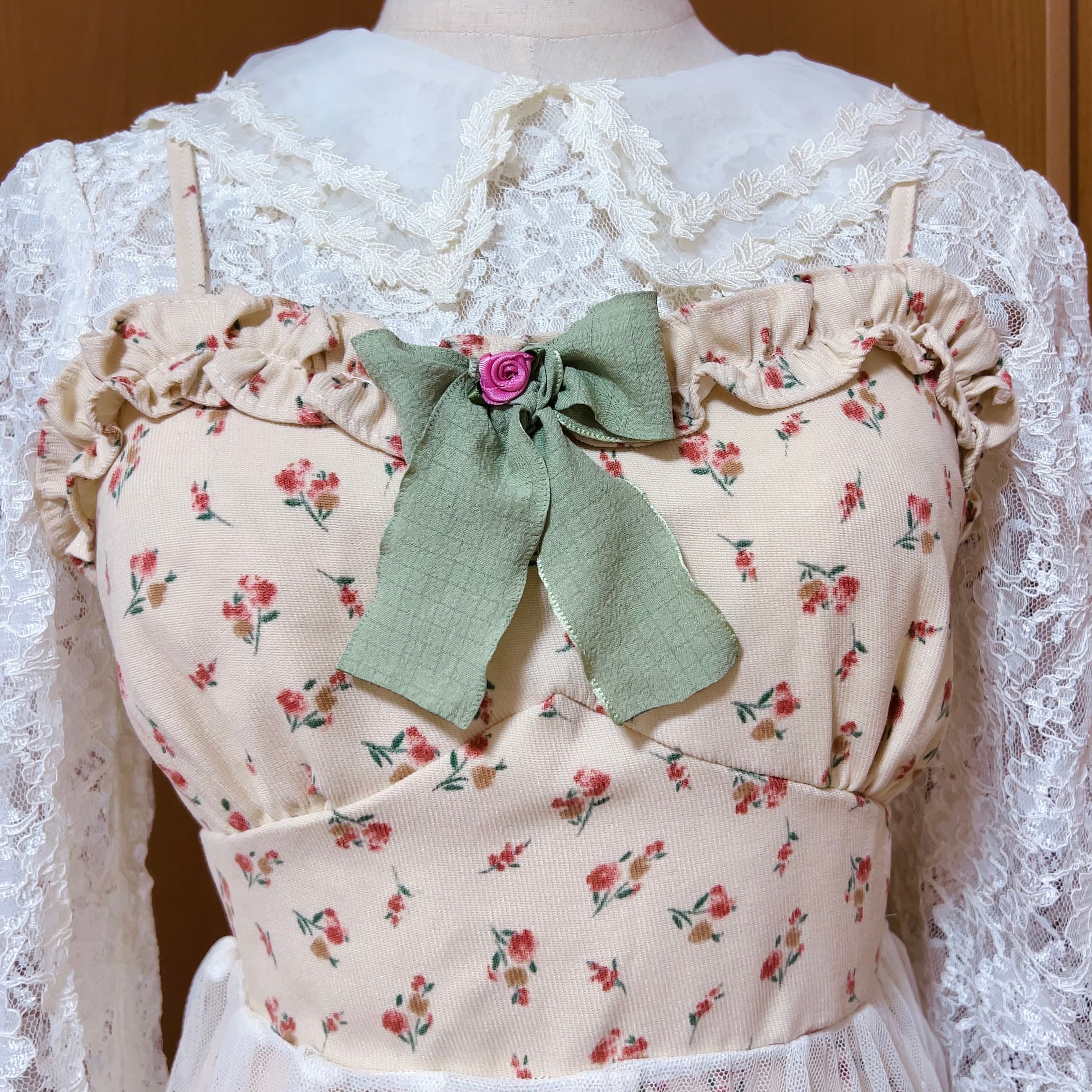 胸元はフリルをあしらったコルセット風の切り替えで、薄緑色のリボンと薔薇のモチーフが小さな焦点になります。