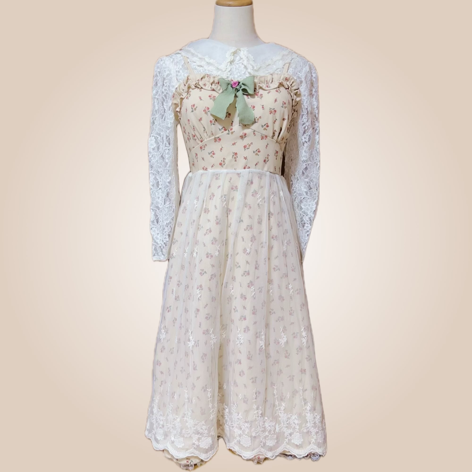 ベージュの花柄を基調に再構築した、キャミソールタイプのリメイクワンピース。
