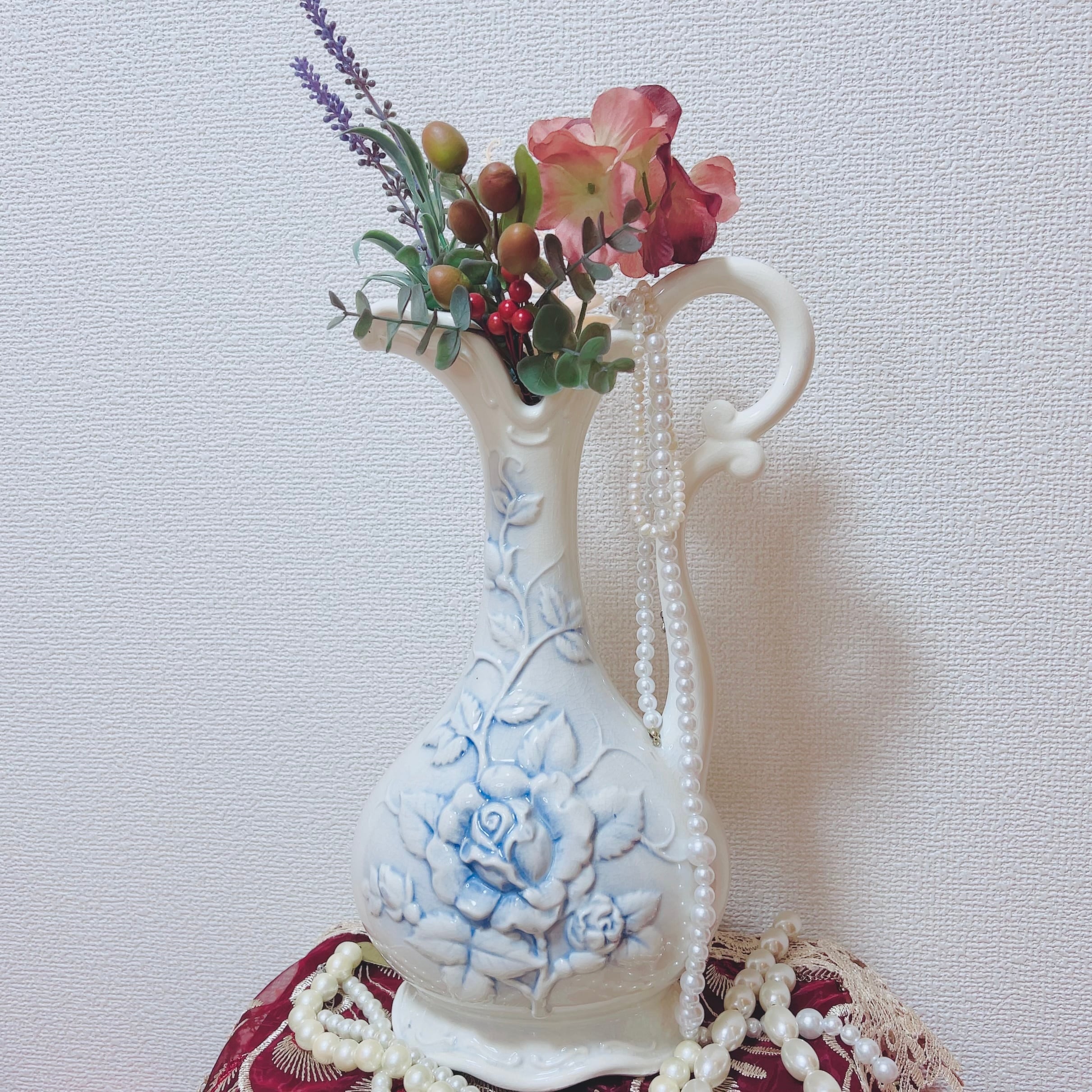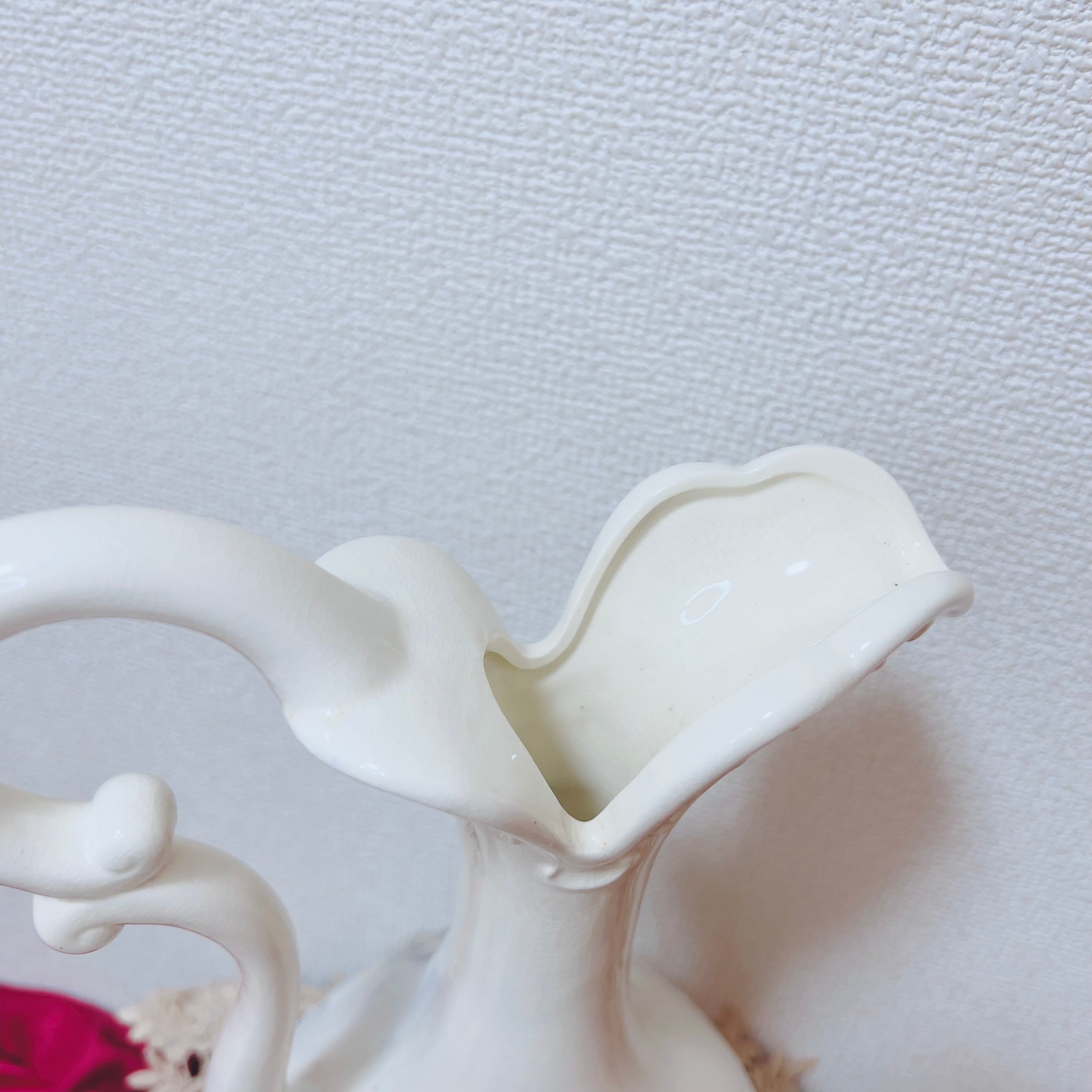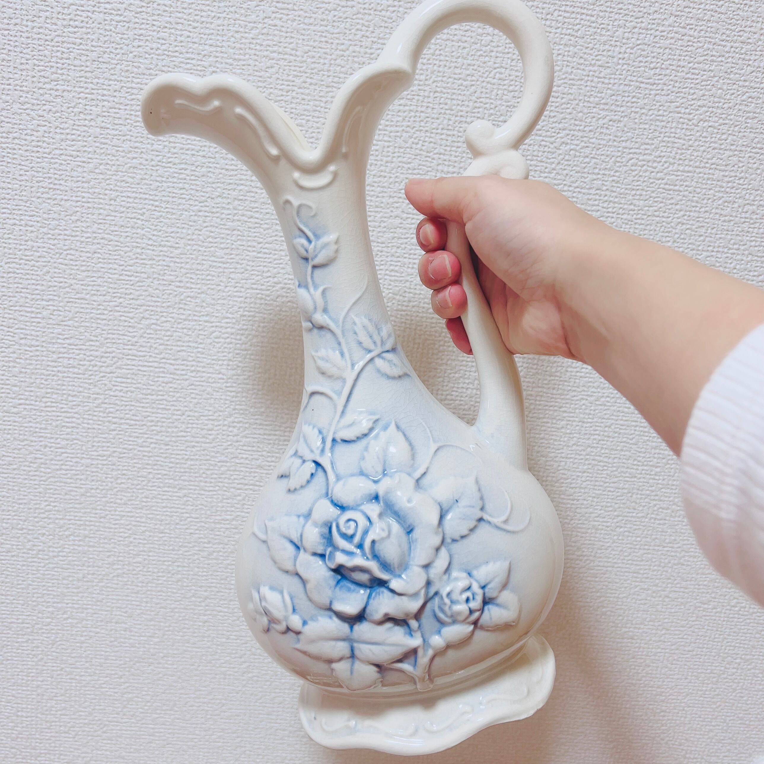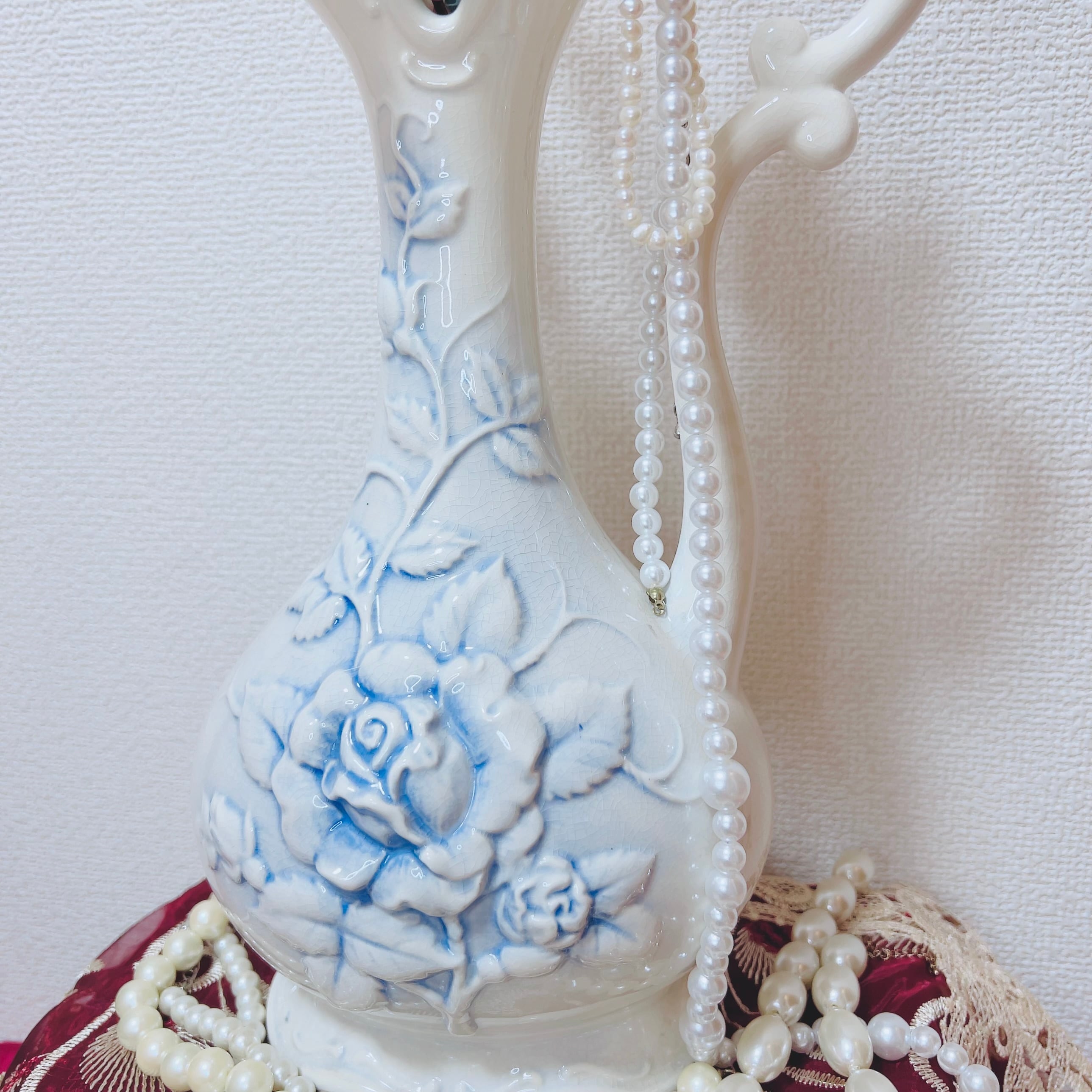 表面には群青色の影を伴う薔薇のレリーフ装飾があります。持ち手が付いた形状で、水瓶やミルクポットのようなスタイルです。