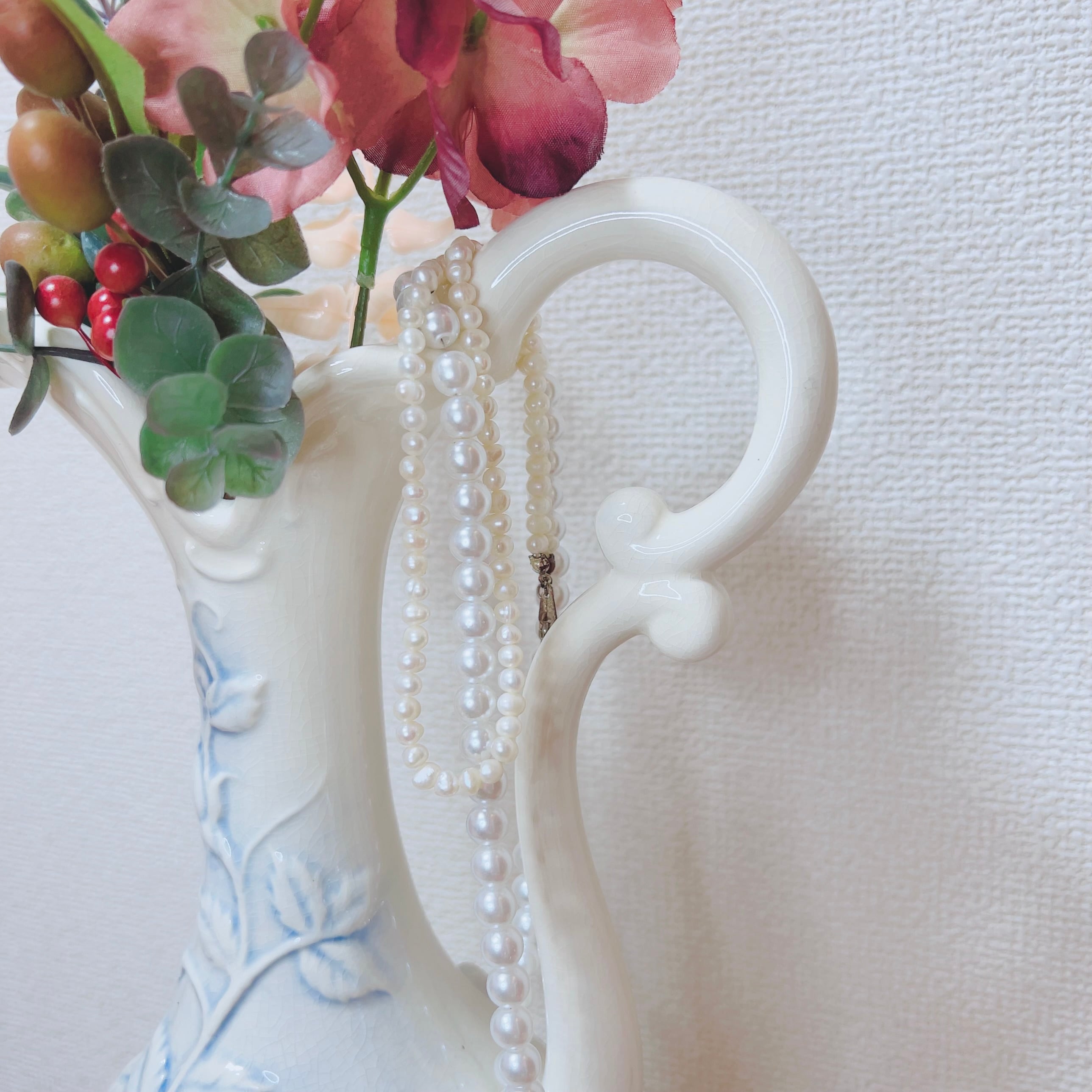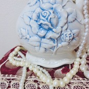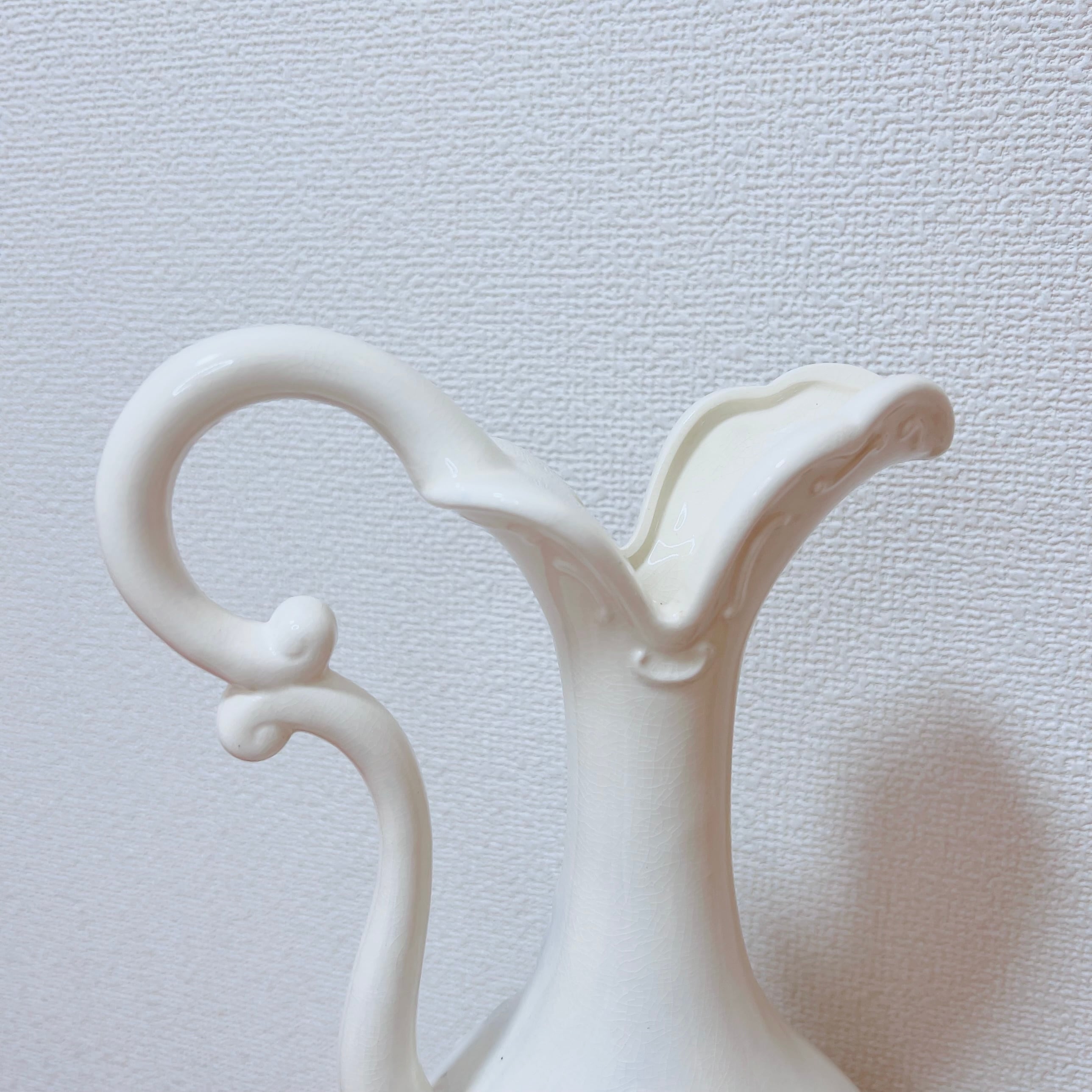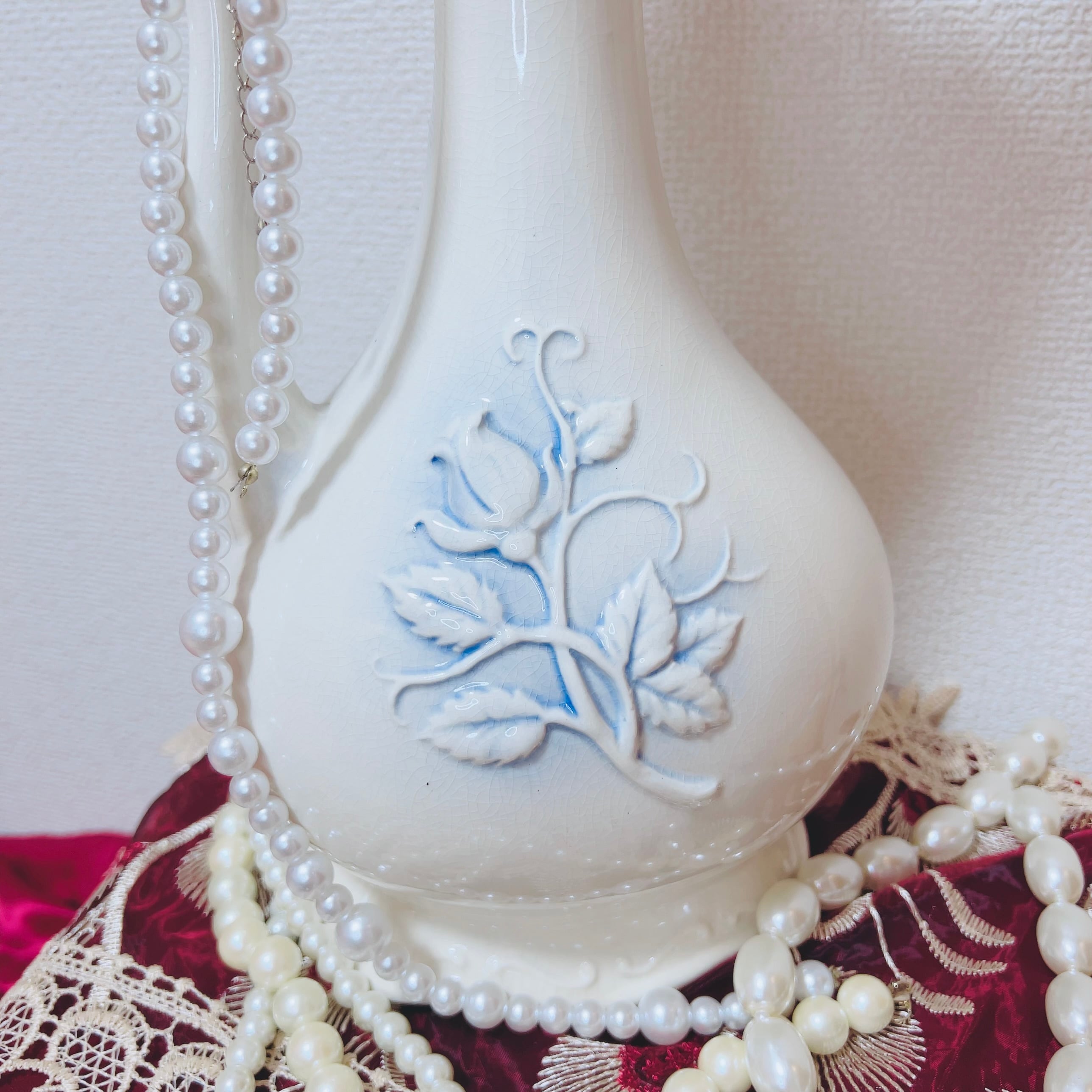 表面には群青色の影を伴う薔薇のレリーフ装飾があります。持ち手が付いた形状で、水瓶やミルクポットのようなスタイルです。