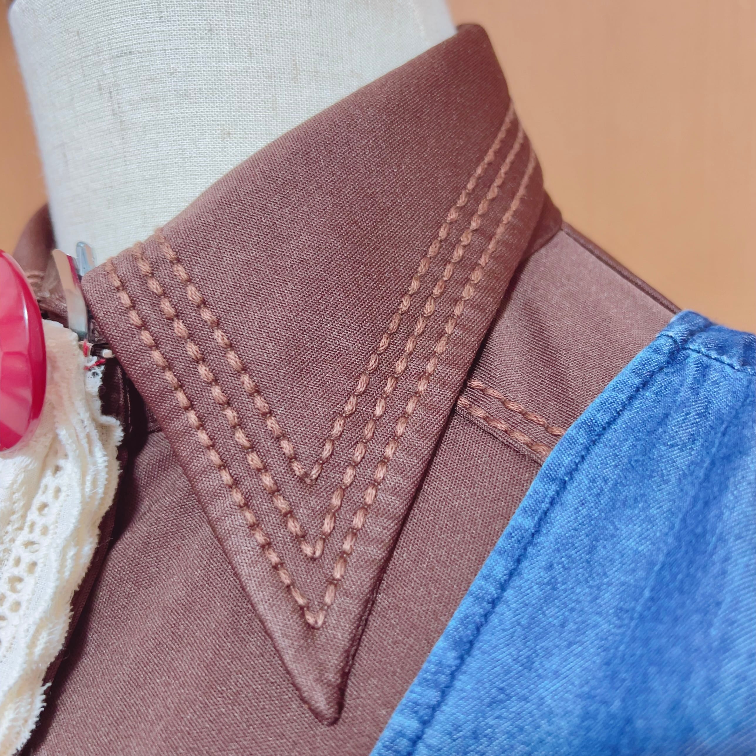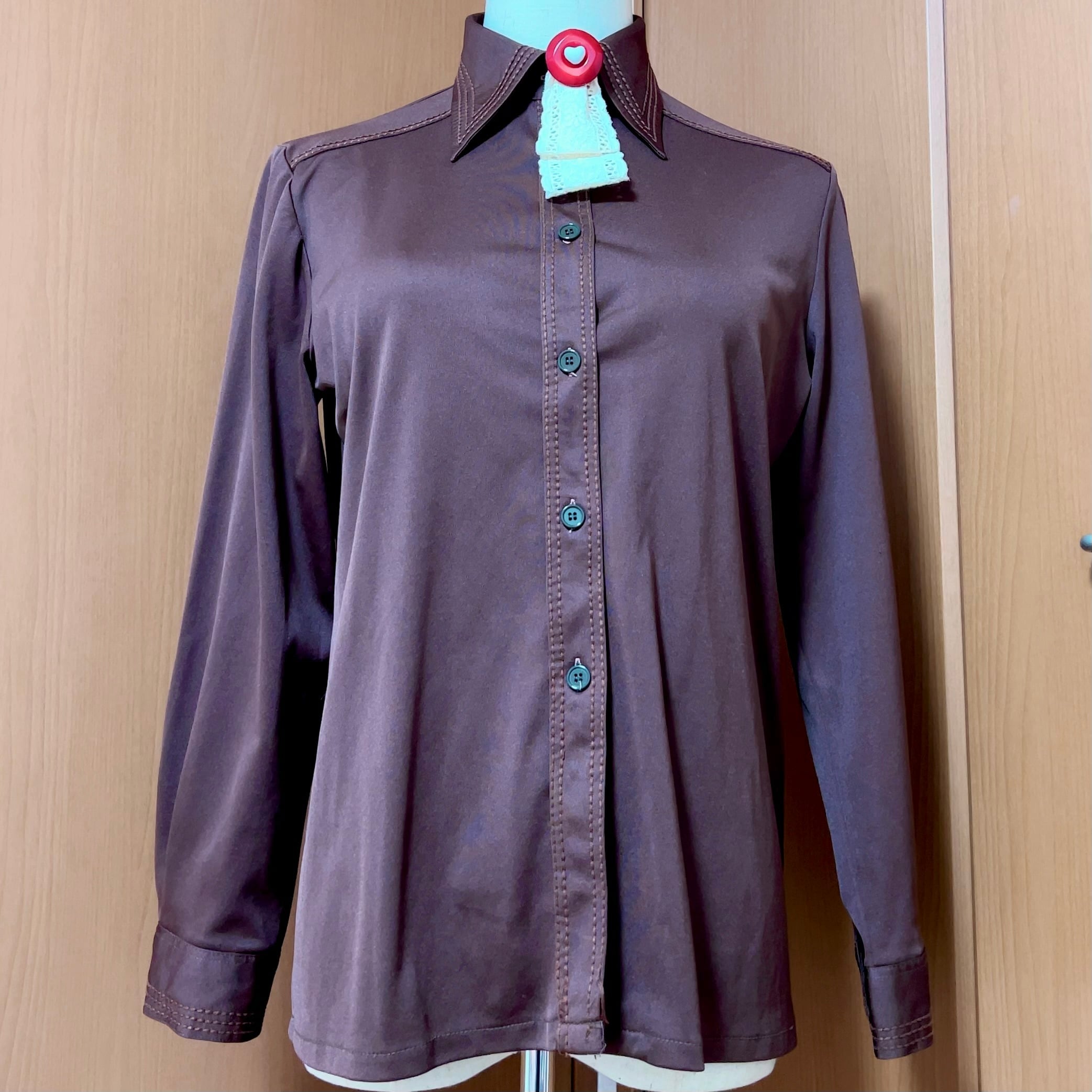 ステッチが美しいブラウンのヴィンテージ襟シャツは、伸縮性のあるジャージー素材。