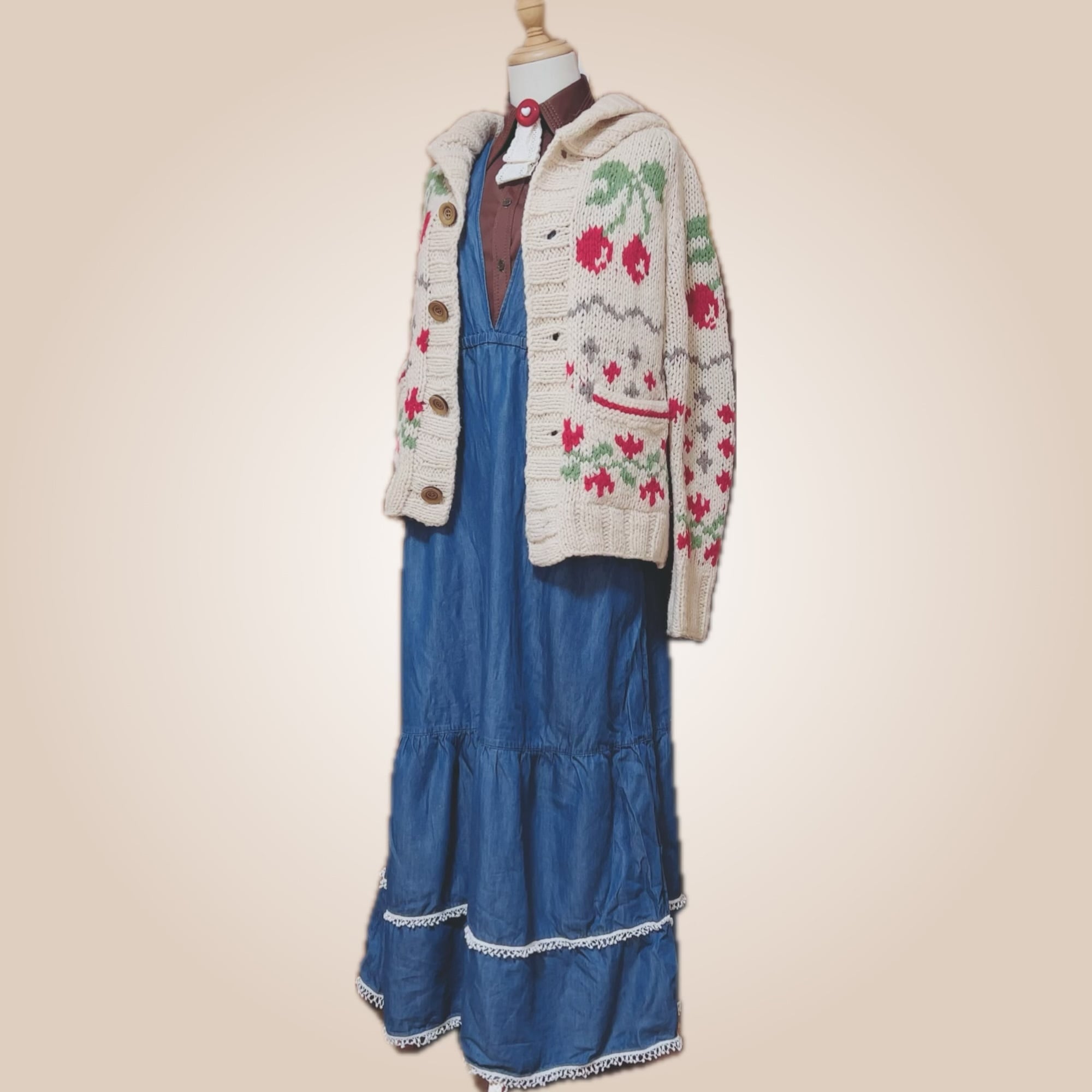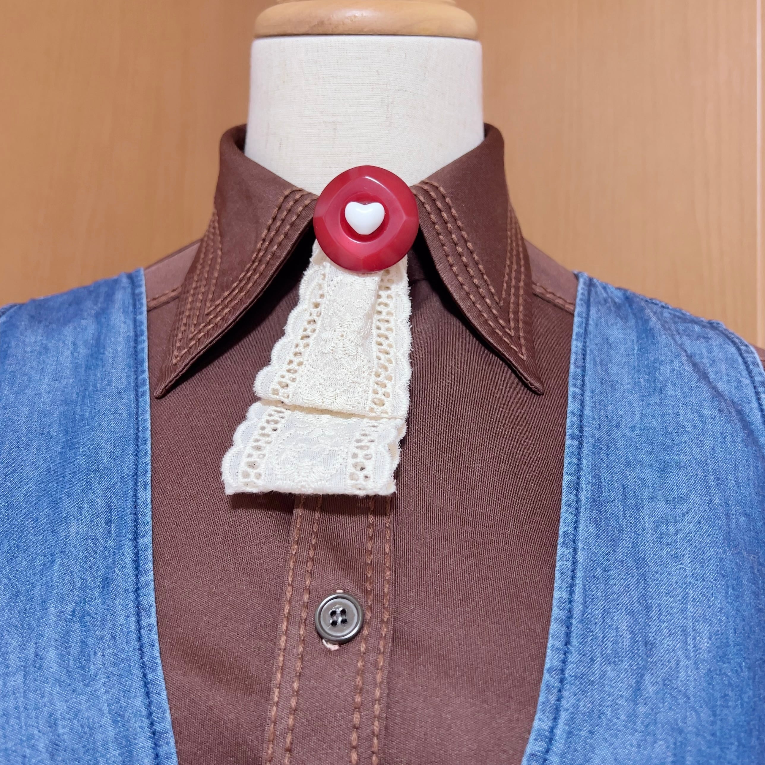 ヴィンテージシャツ × デニムジャンパースカート × リボンタイブローチのコーディネート3点セット。