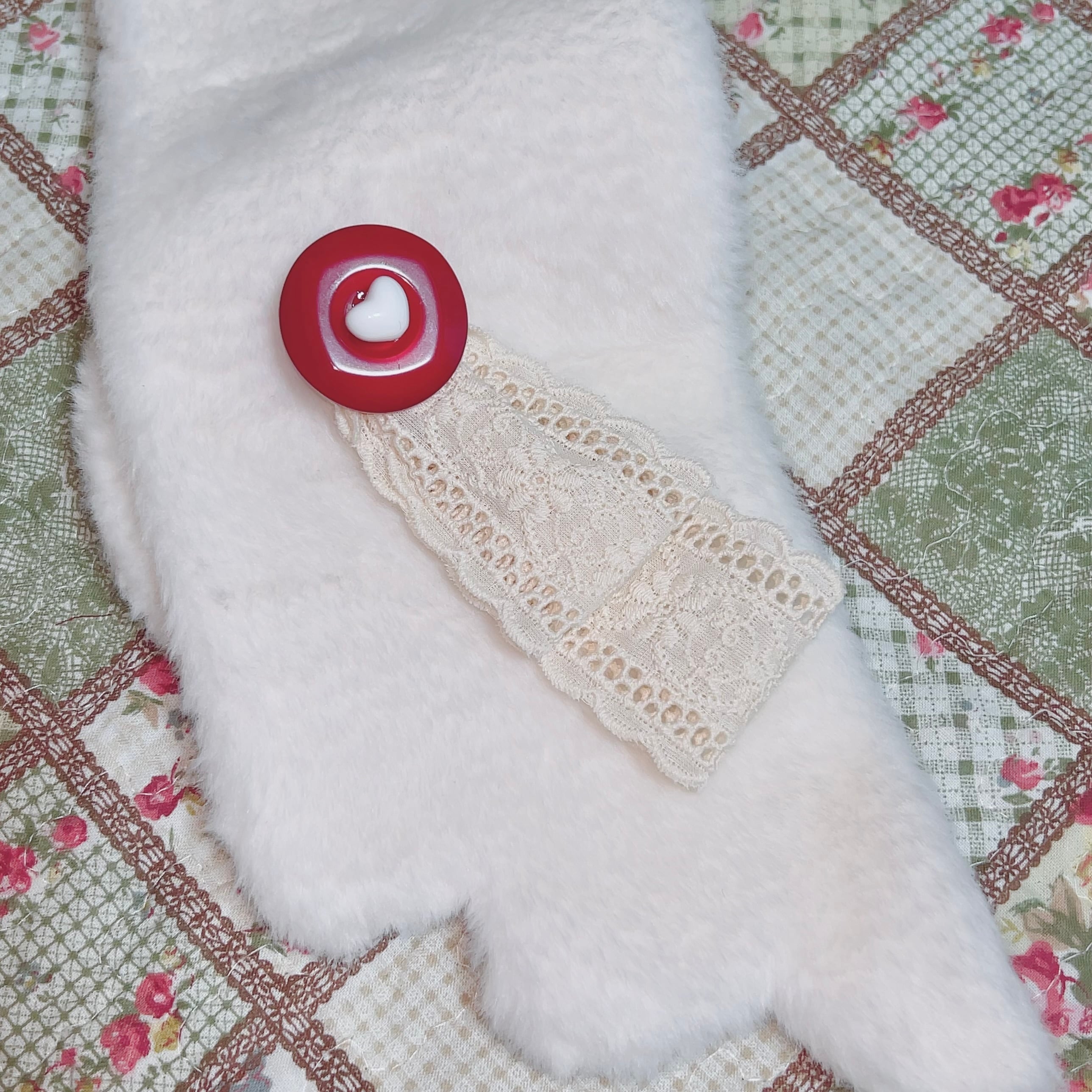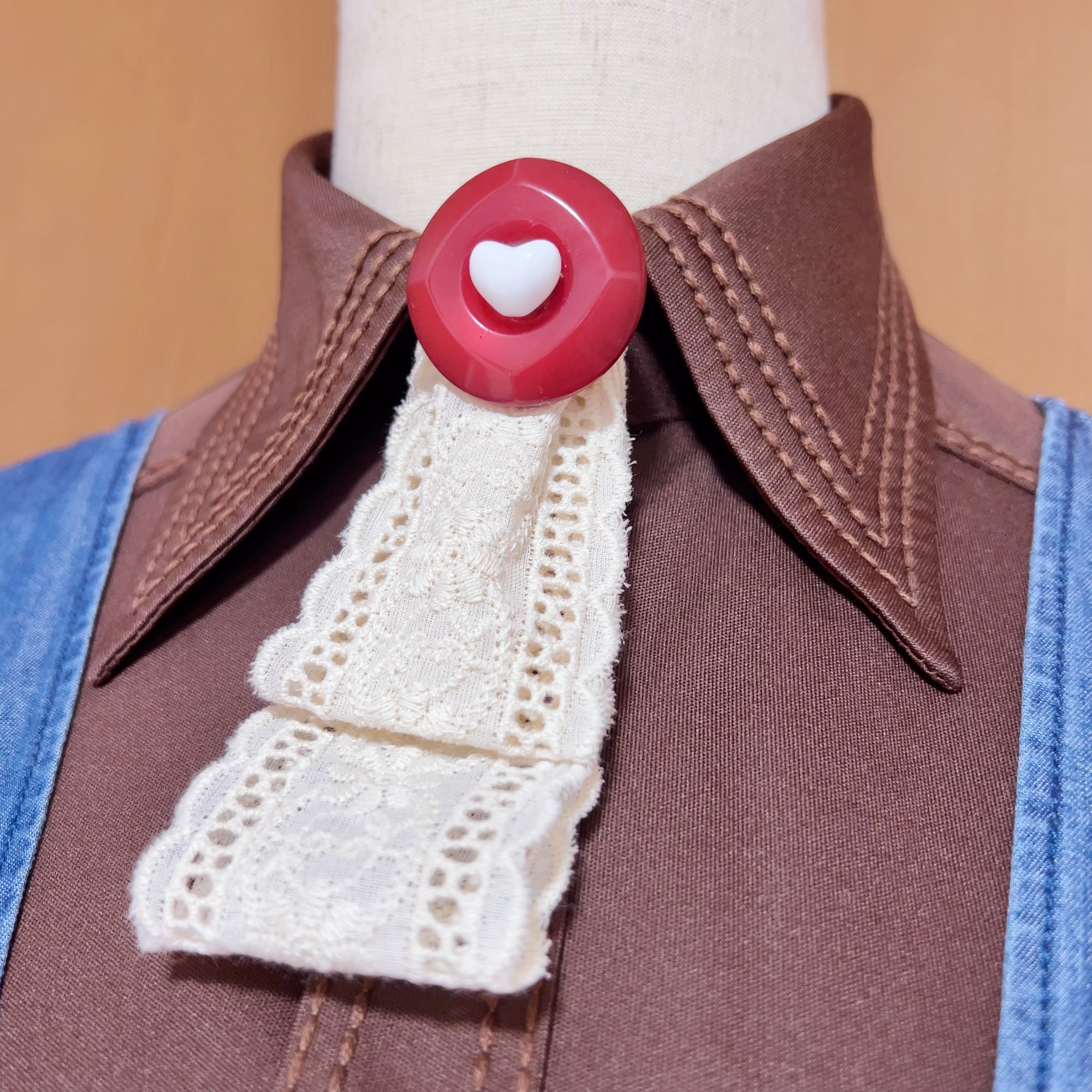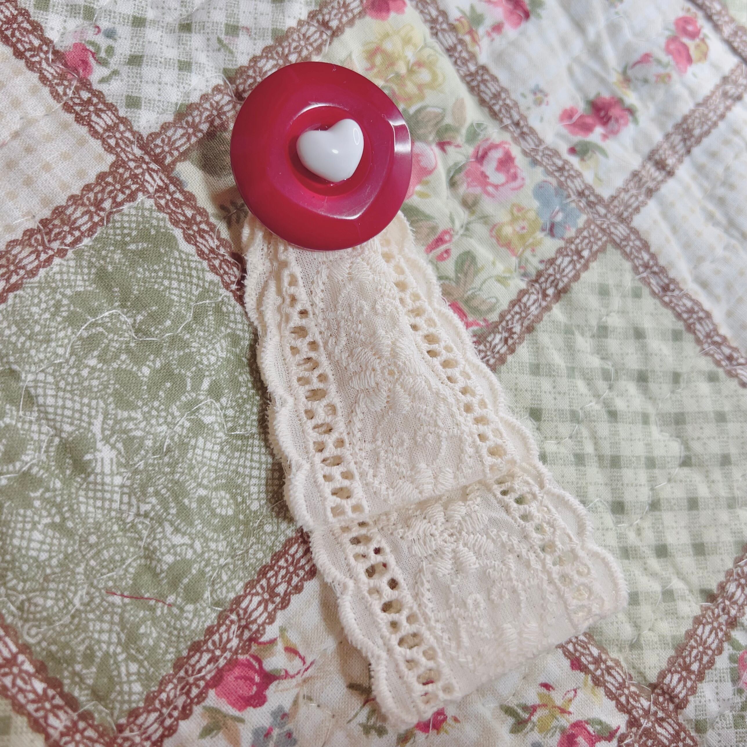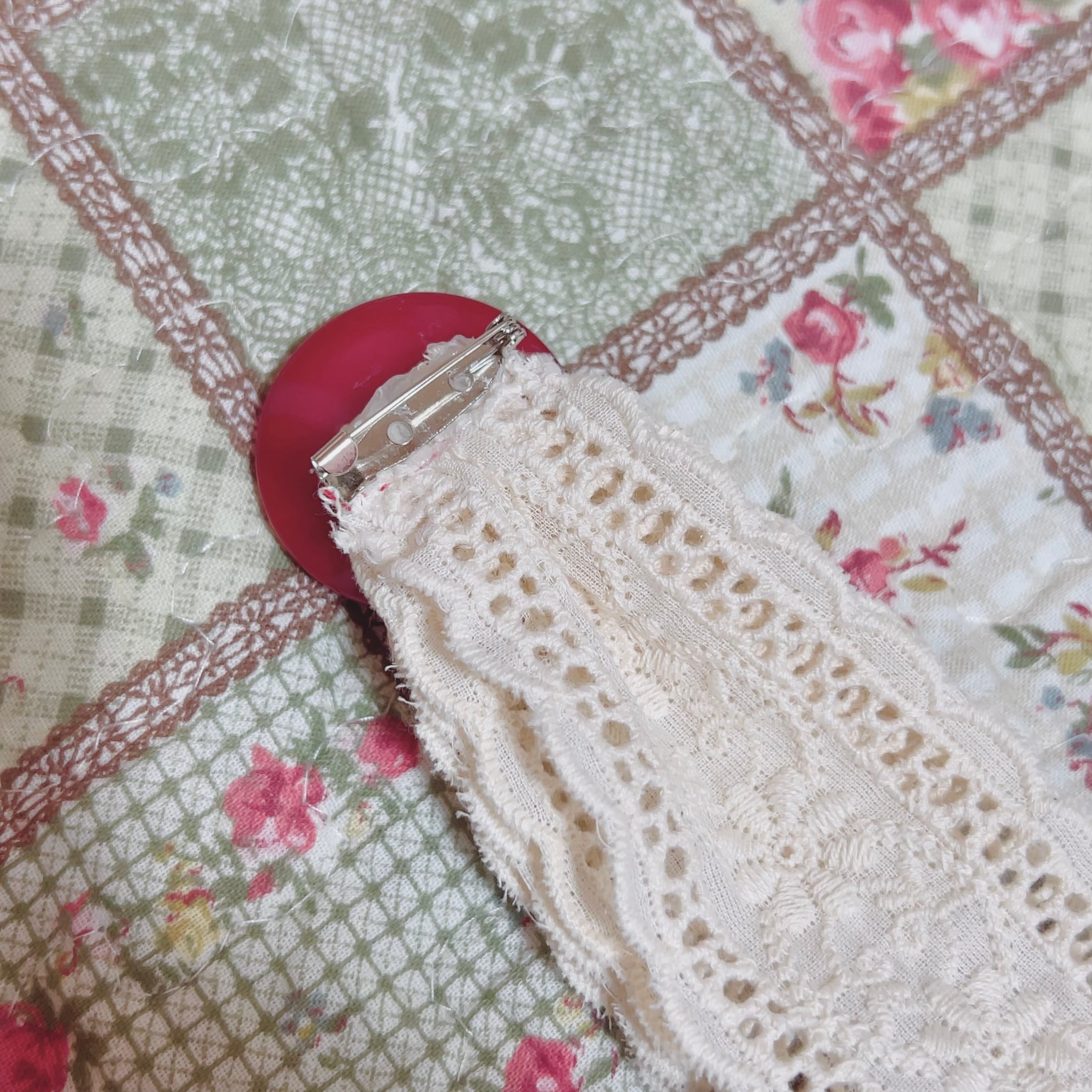 リボンタイブローチは、赤くて大きなキャンディみたいなヴィンテージボタンをレースリボンでリメイクした一点物。