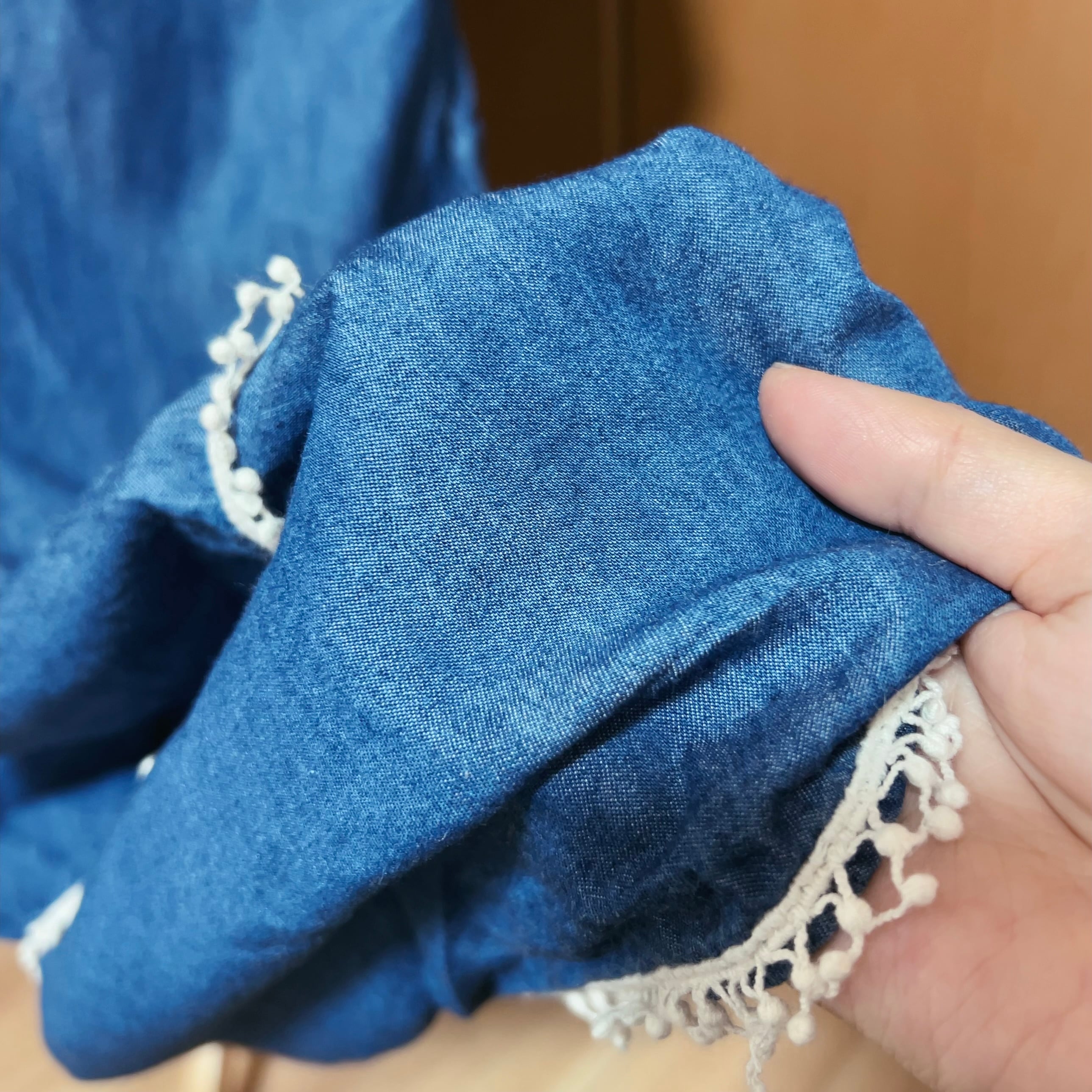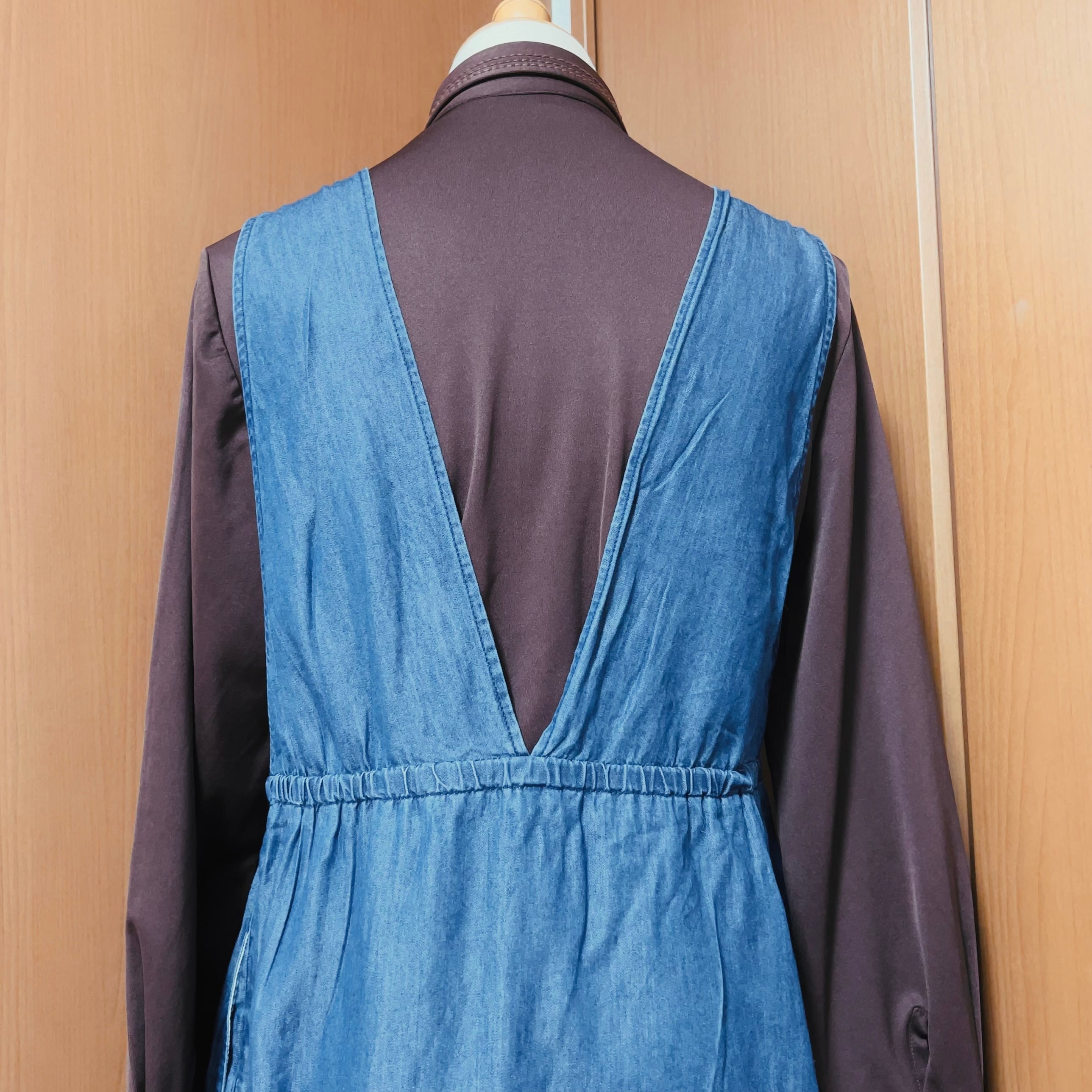薄手のコットンデニムのフレアジャンパースカートは、裏地がない分長い季節で活躍。