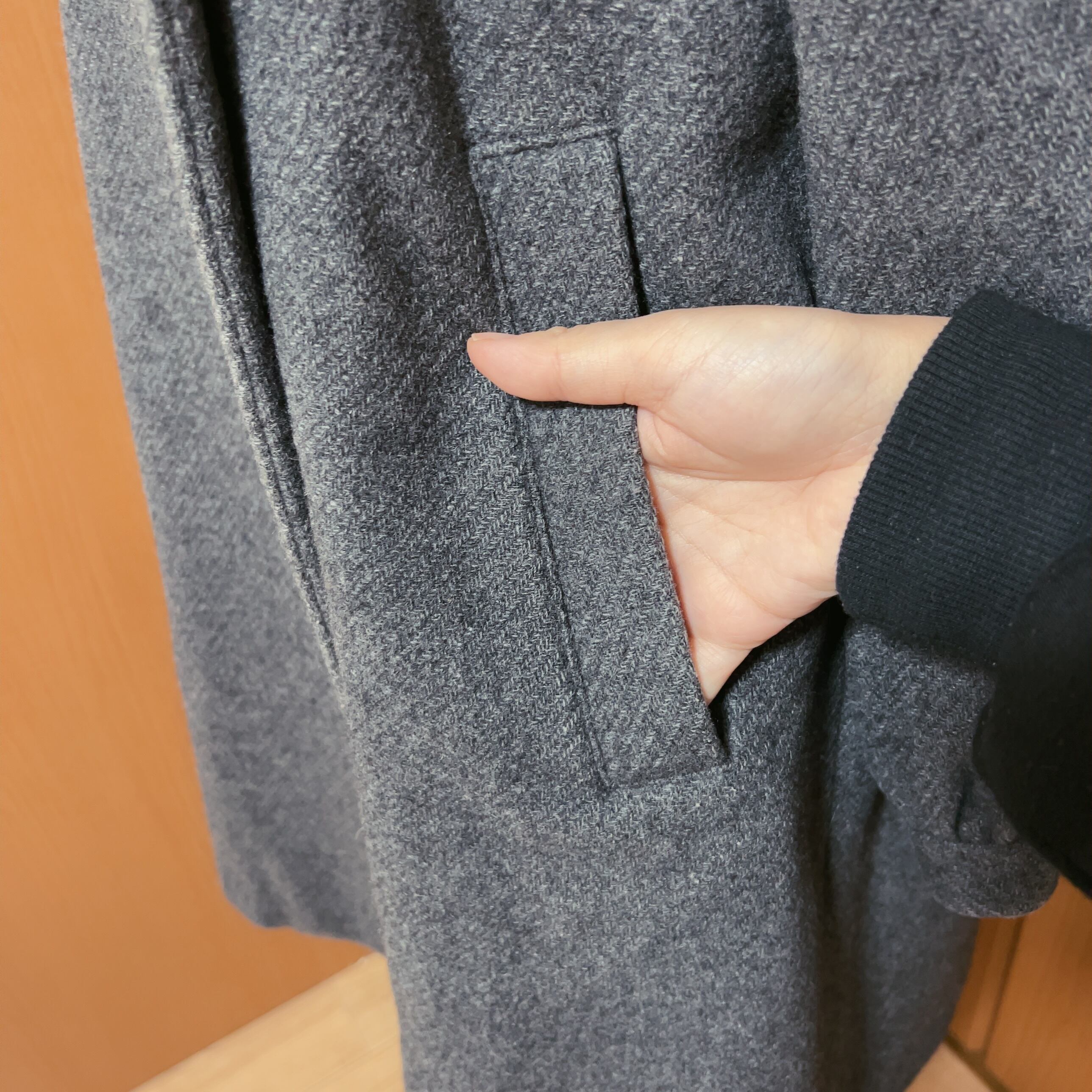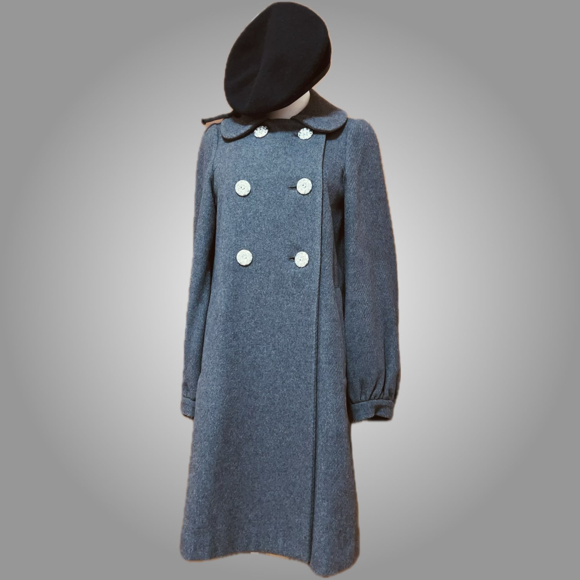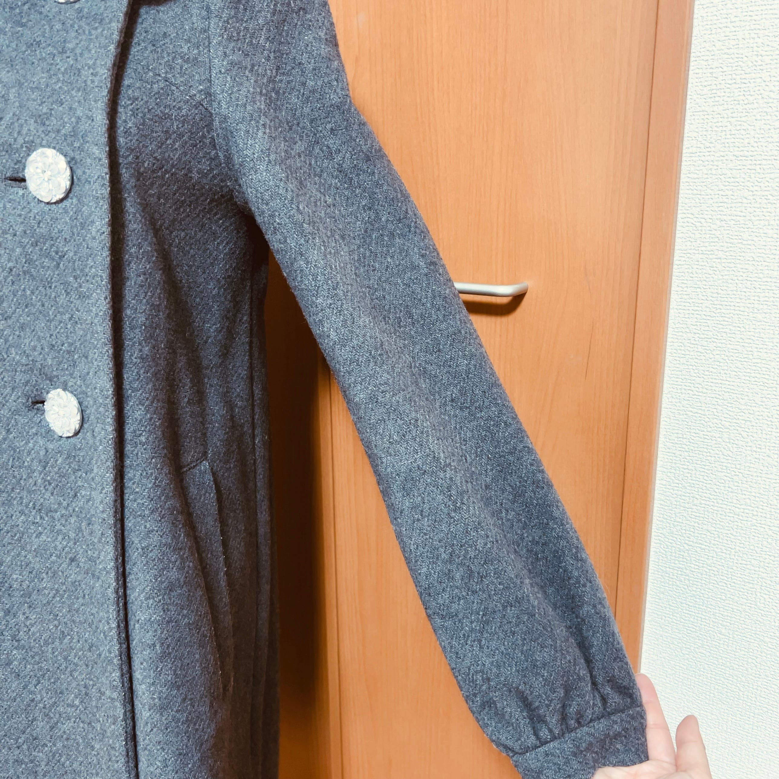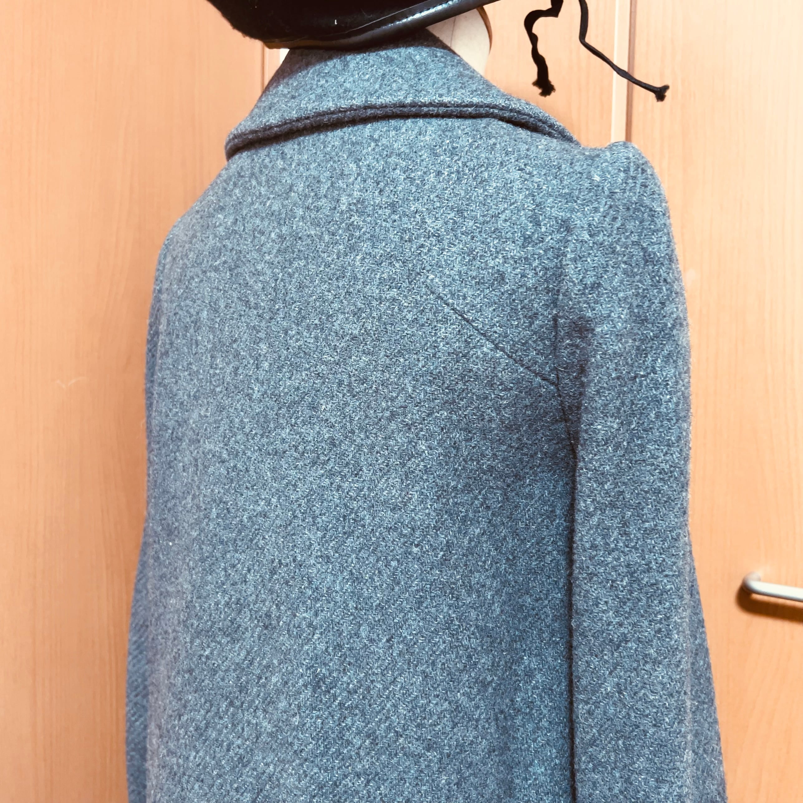 上品なグレーのウール生地に、丸襟のやわらかなフォルムが印象的な一着です。