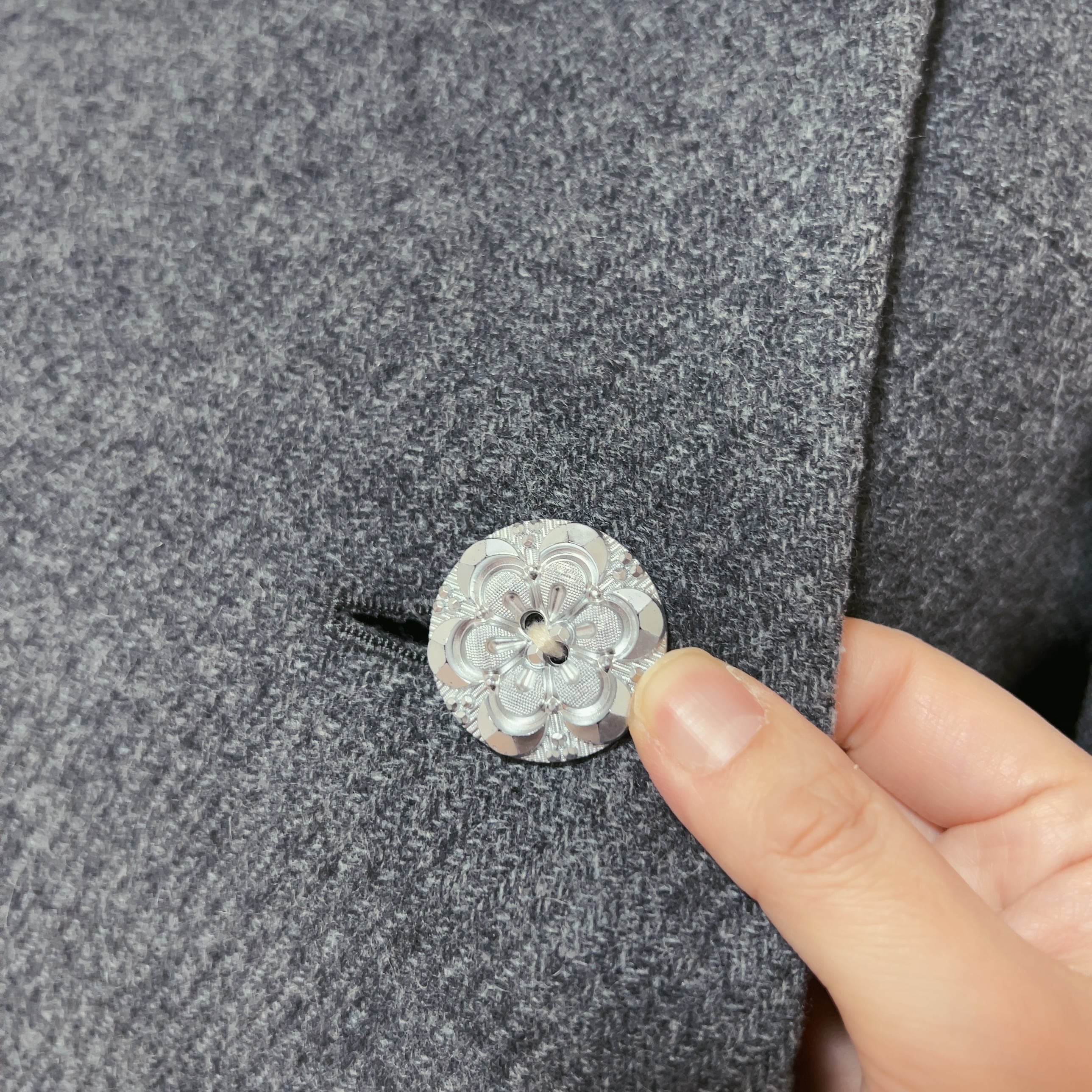 大粒のシルバーレリーフボタンは欠けやくすみのない良好なコンディションで、きらきらと雪の結晶のよう。