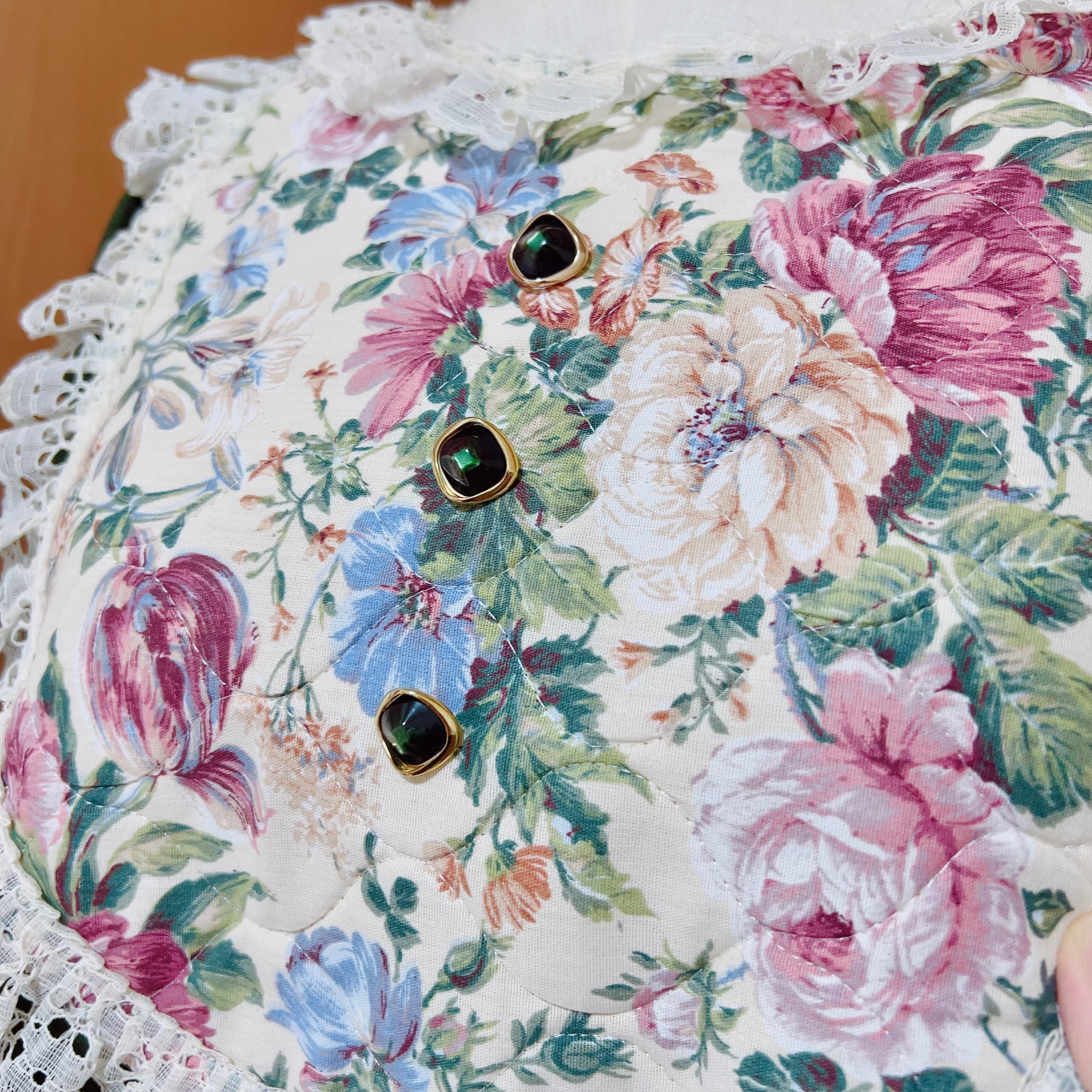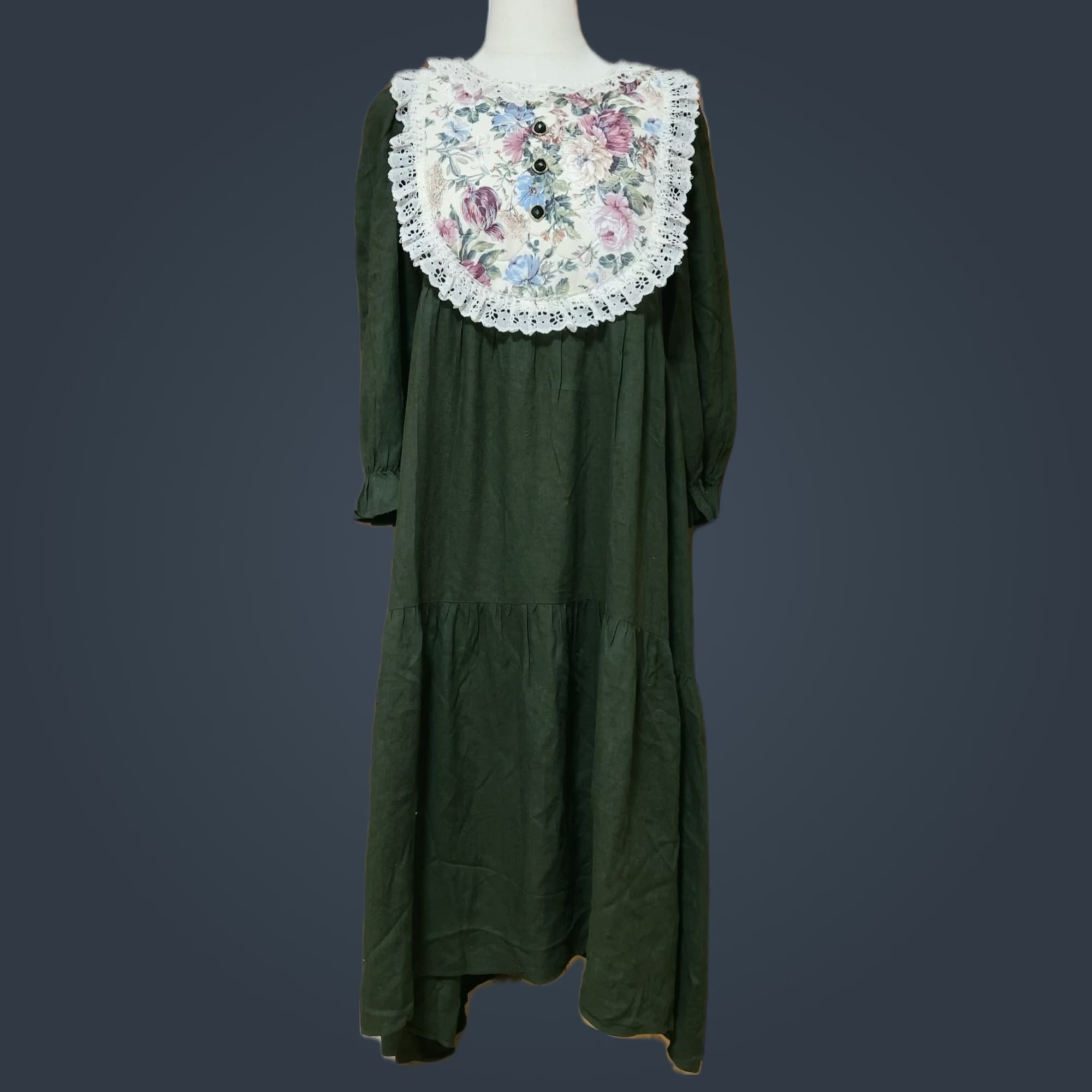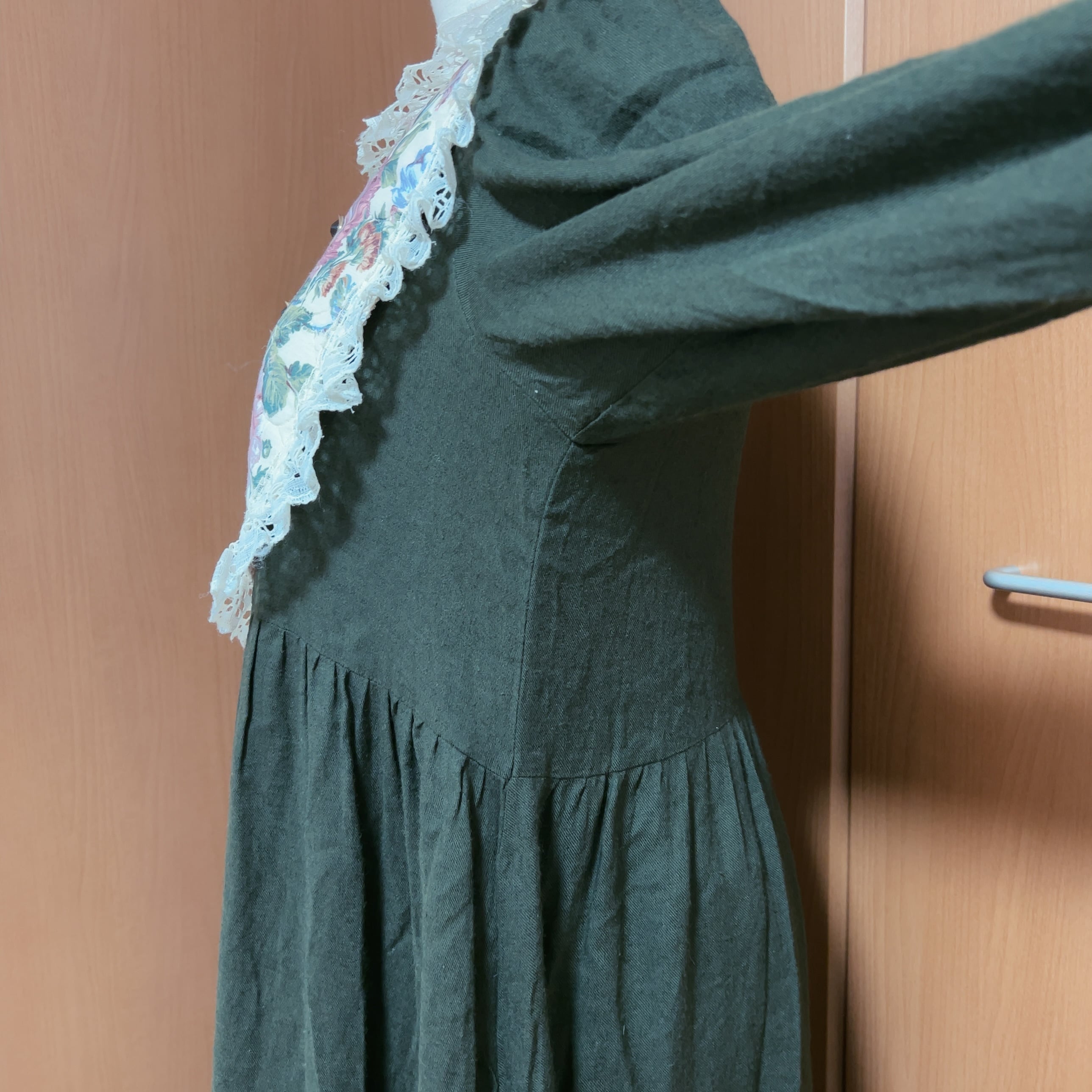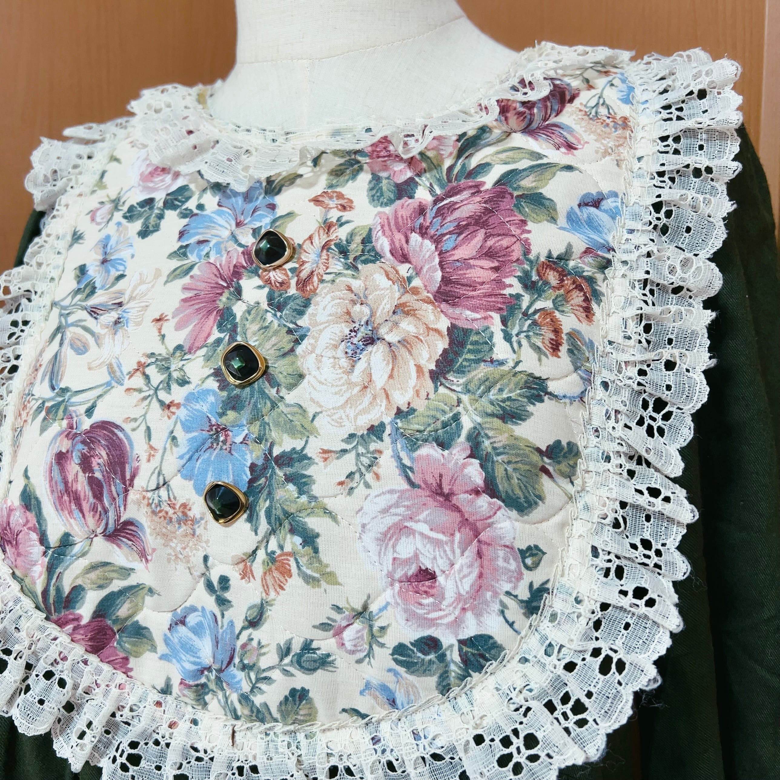 モスグリーンのフレアワンピースに、ヴィンテージのキルトテーブルランナーの楕円の花柄をそのまま生かしてヨーク襟へと仕立てた一着。