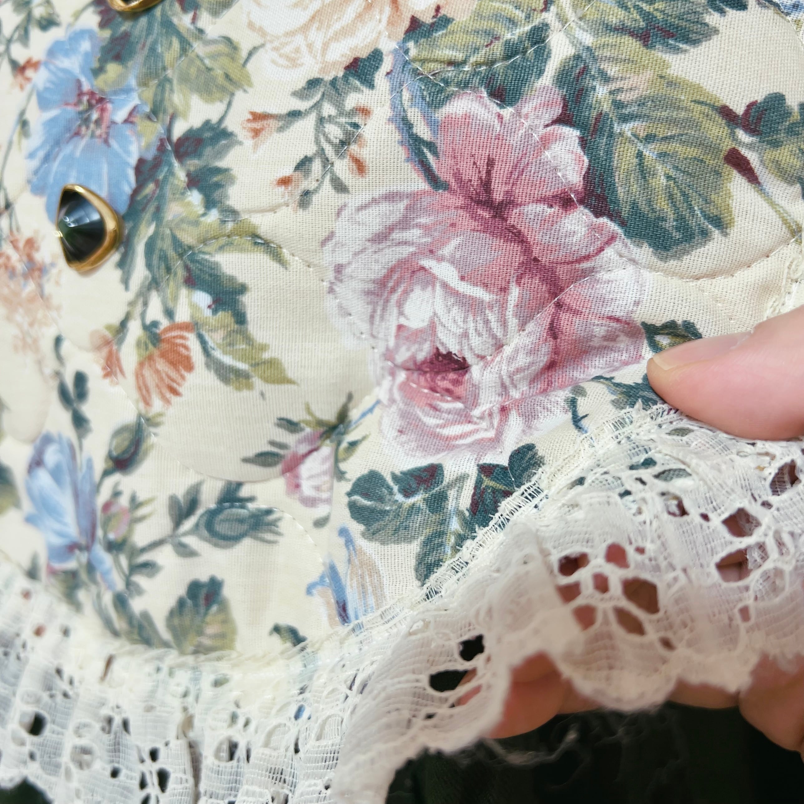 クラシカルなフラワーキルトが、“記憶”として胸元に残ります。