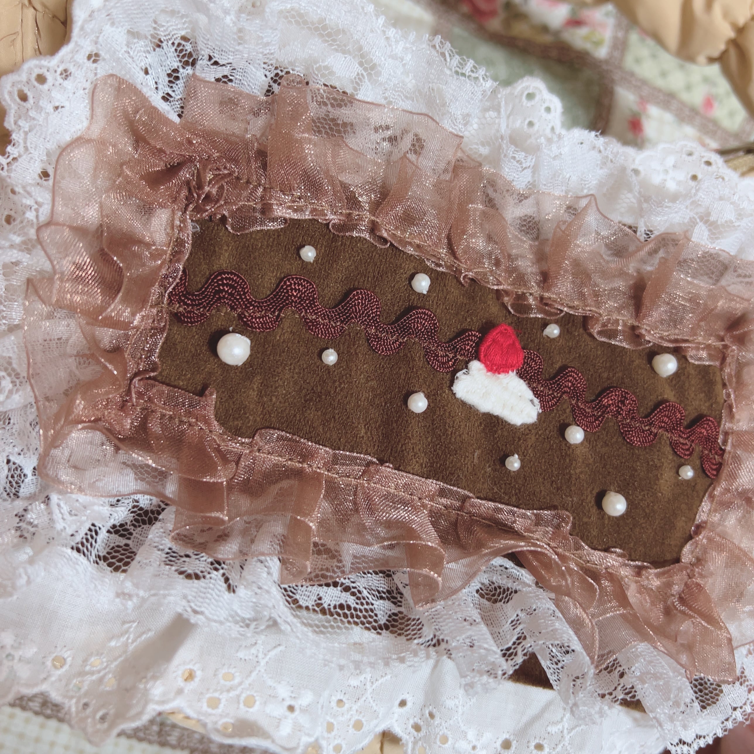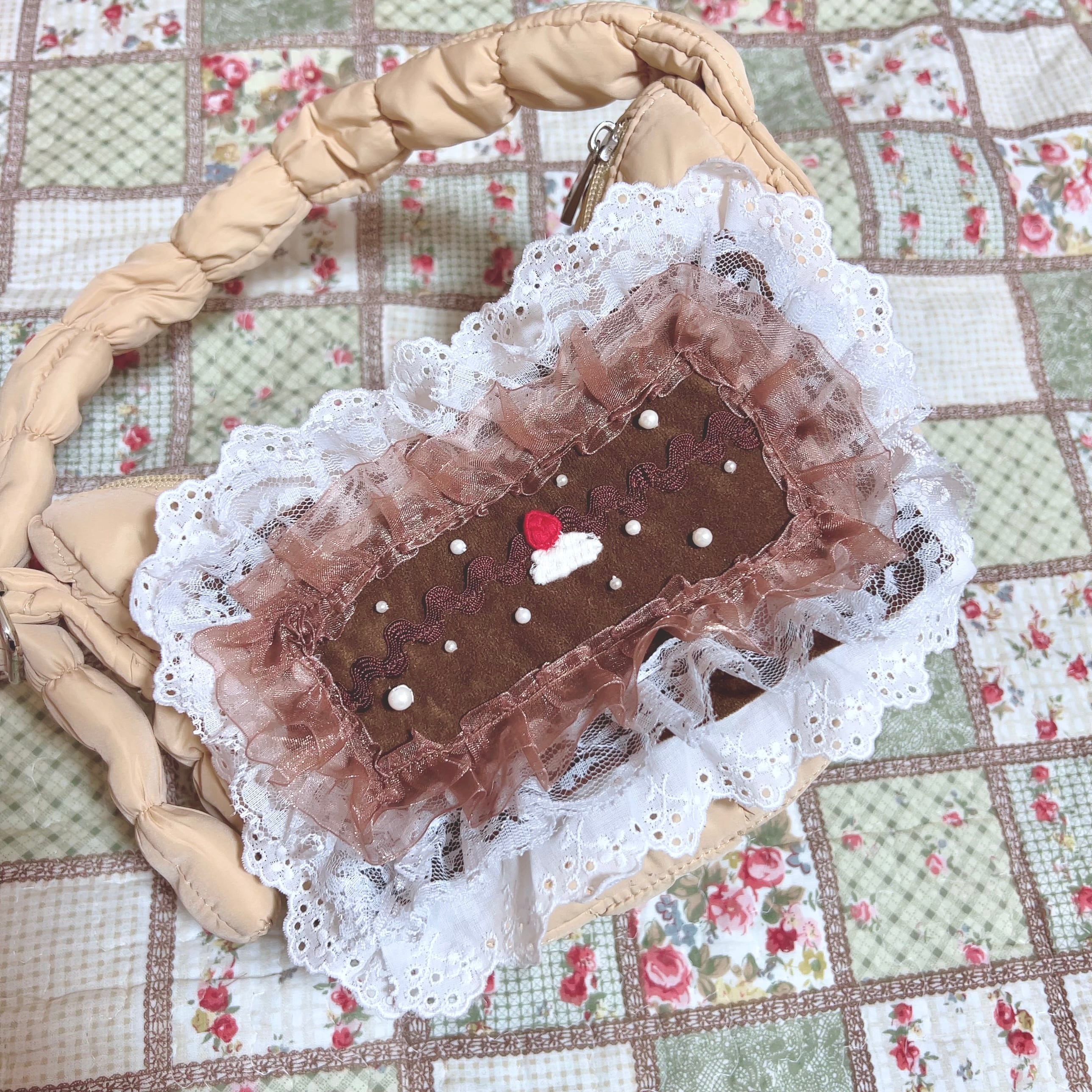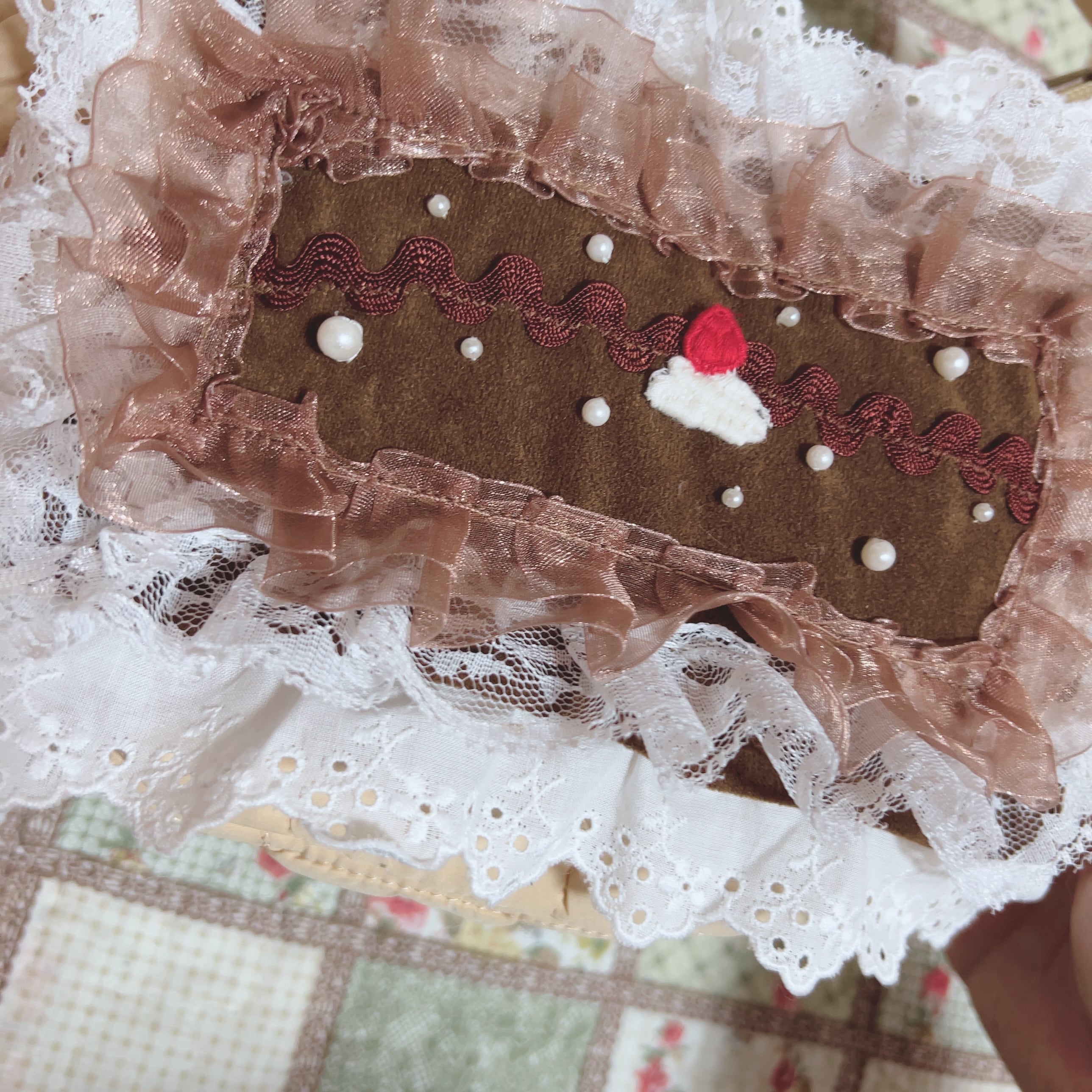 ヴィンテージスカートのこってりチョコレートカラーなスエード生地を使って、コットンフリルでマスカルポーネをたっぷりつかったティラミスケーキに仕上げました。
