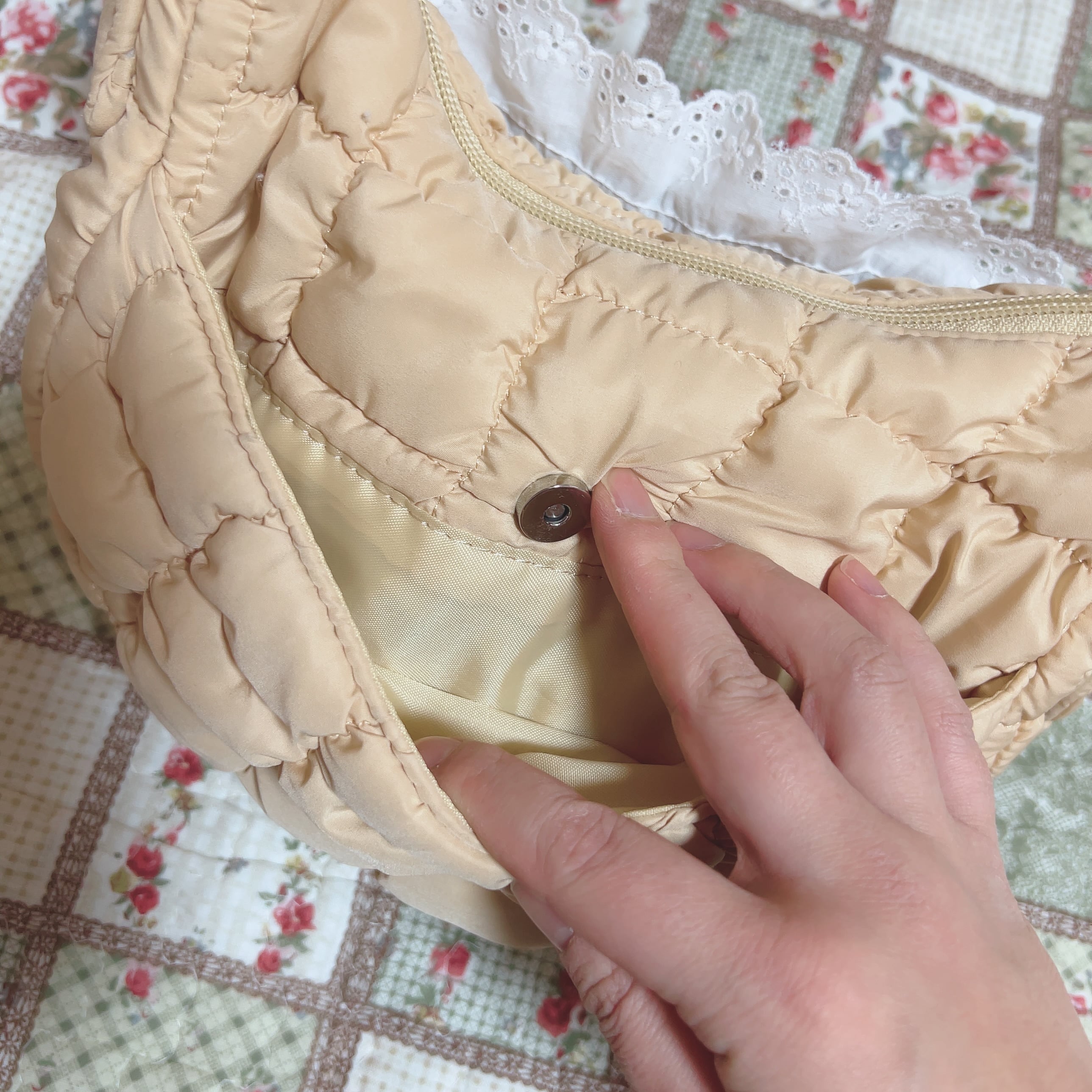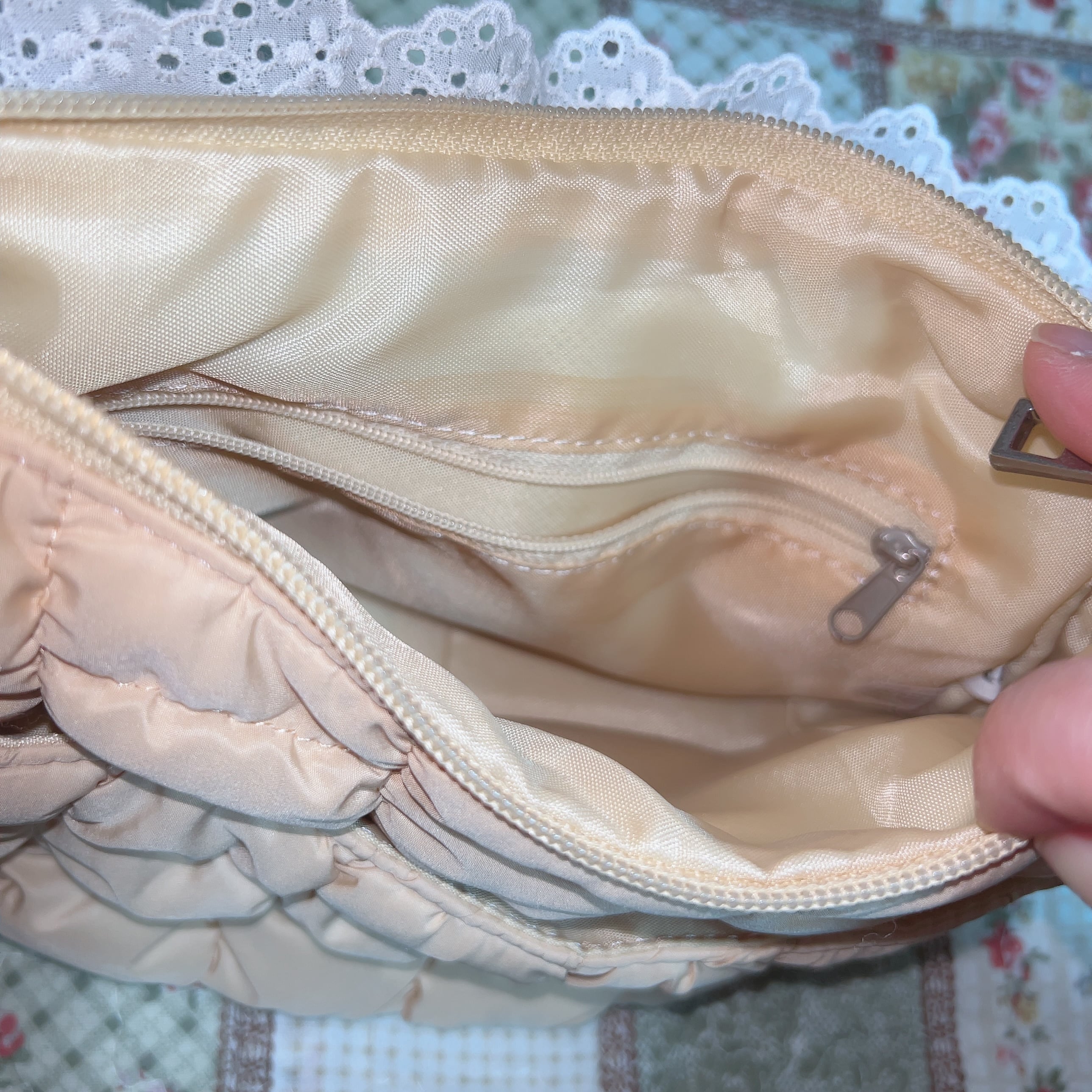 キルティング部分はベージュで、内外にポケットが一つずつ。