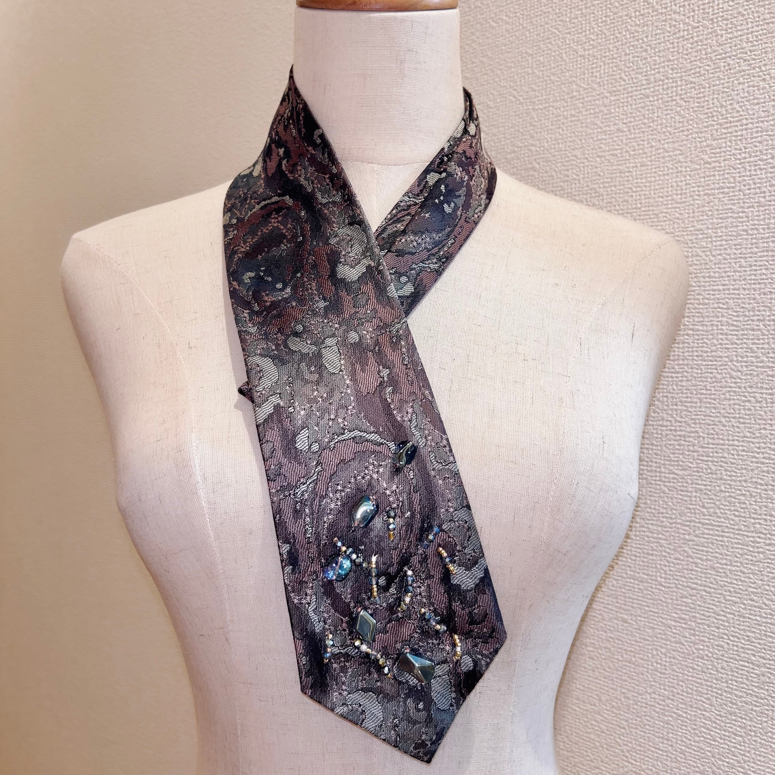 グロッシーな質感の生地にくすみカラーのマーブル模様が入ったヴィンテージネクタイ。