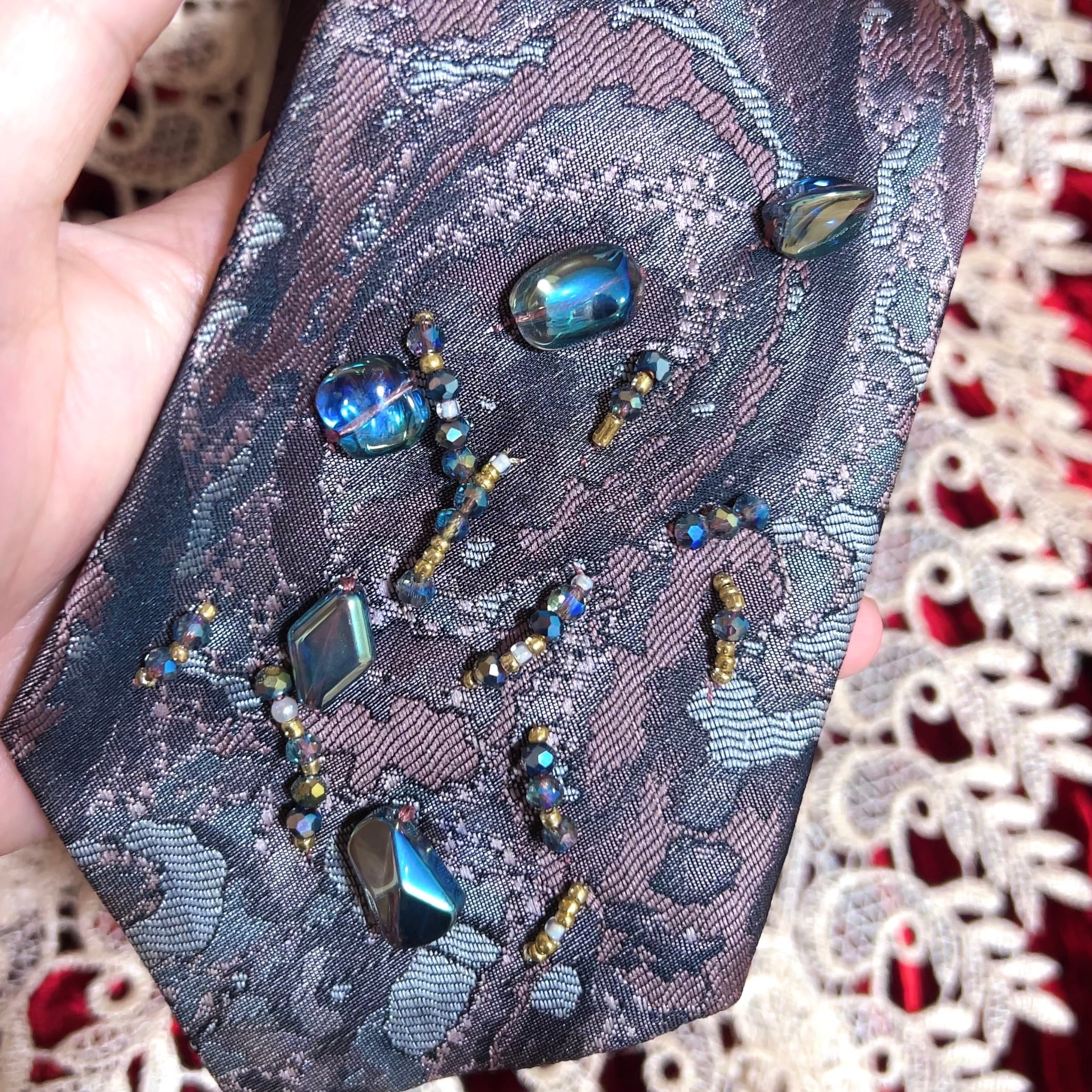 青や緑に輝く偏光ビーズを鉱石に見立て、大小組み合わせて手縫いで縫い付けています。