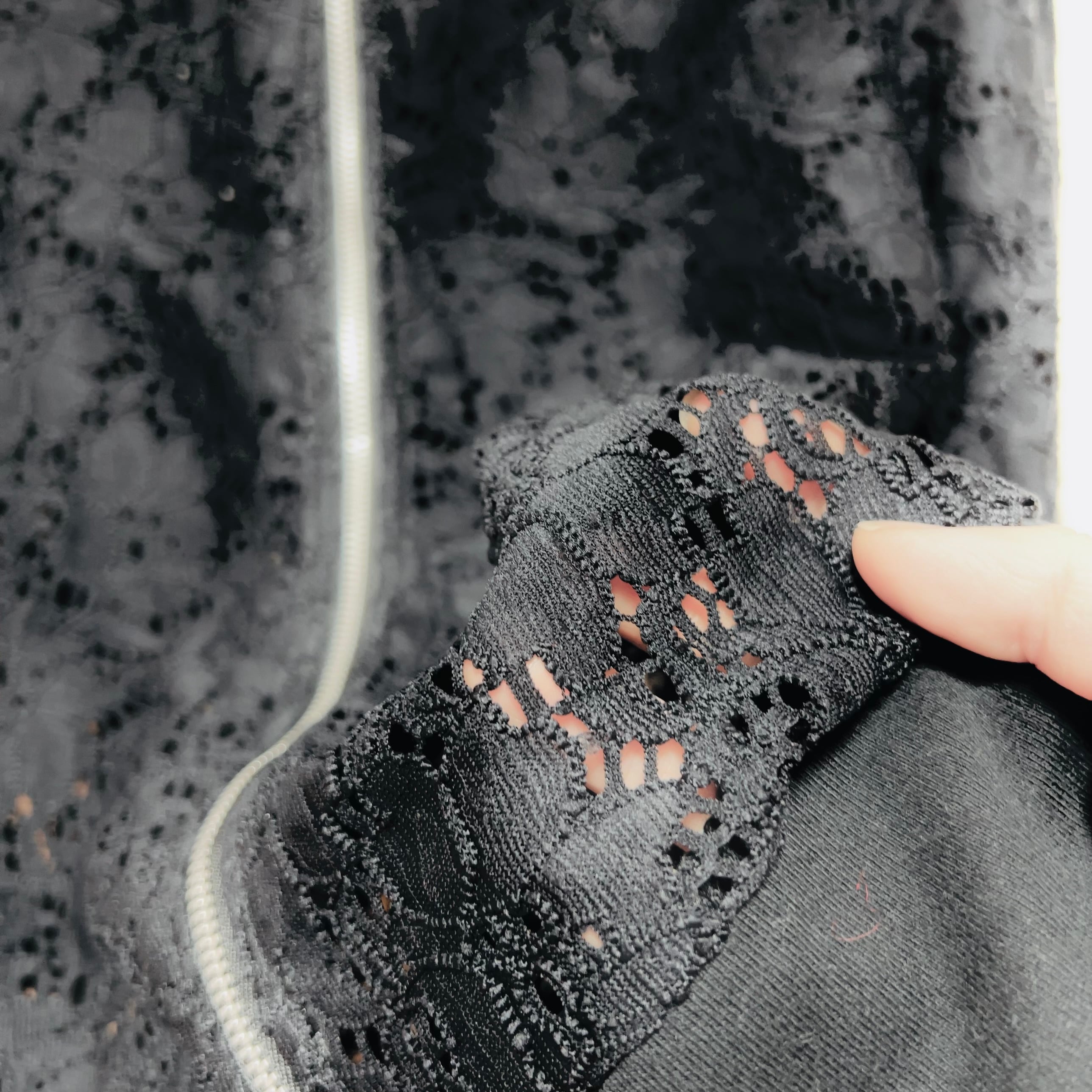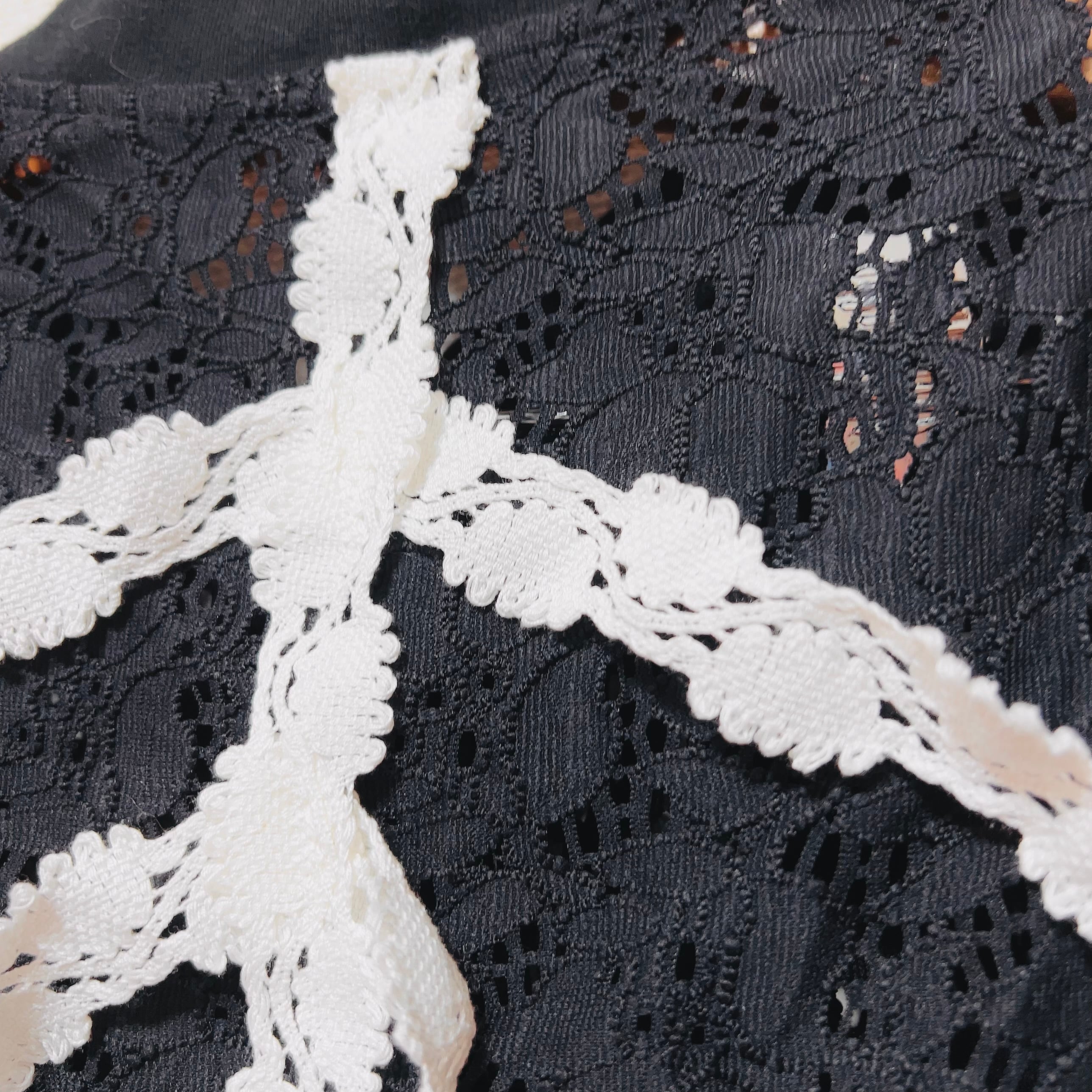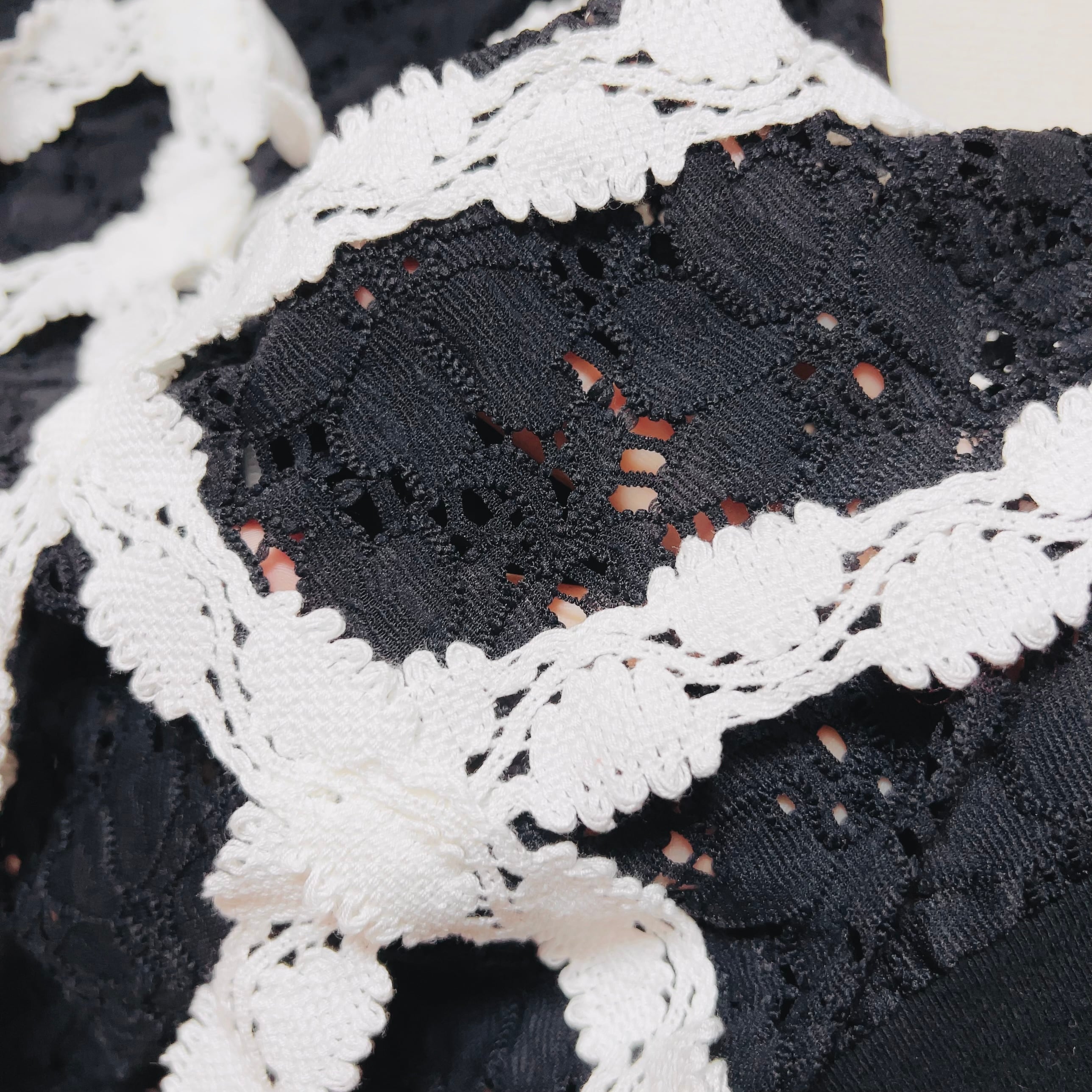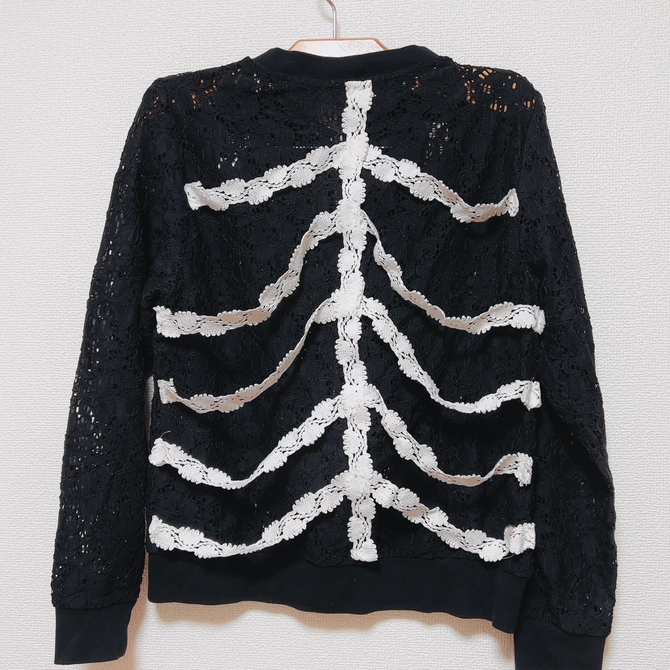 ブラックのレースブルゾンに、白いレースブレードで脊椎と肋骨を表現した「ガーリー×退廃」のリメイクアイテムです。