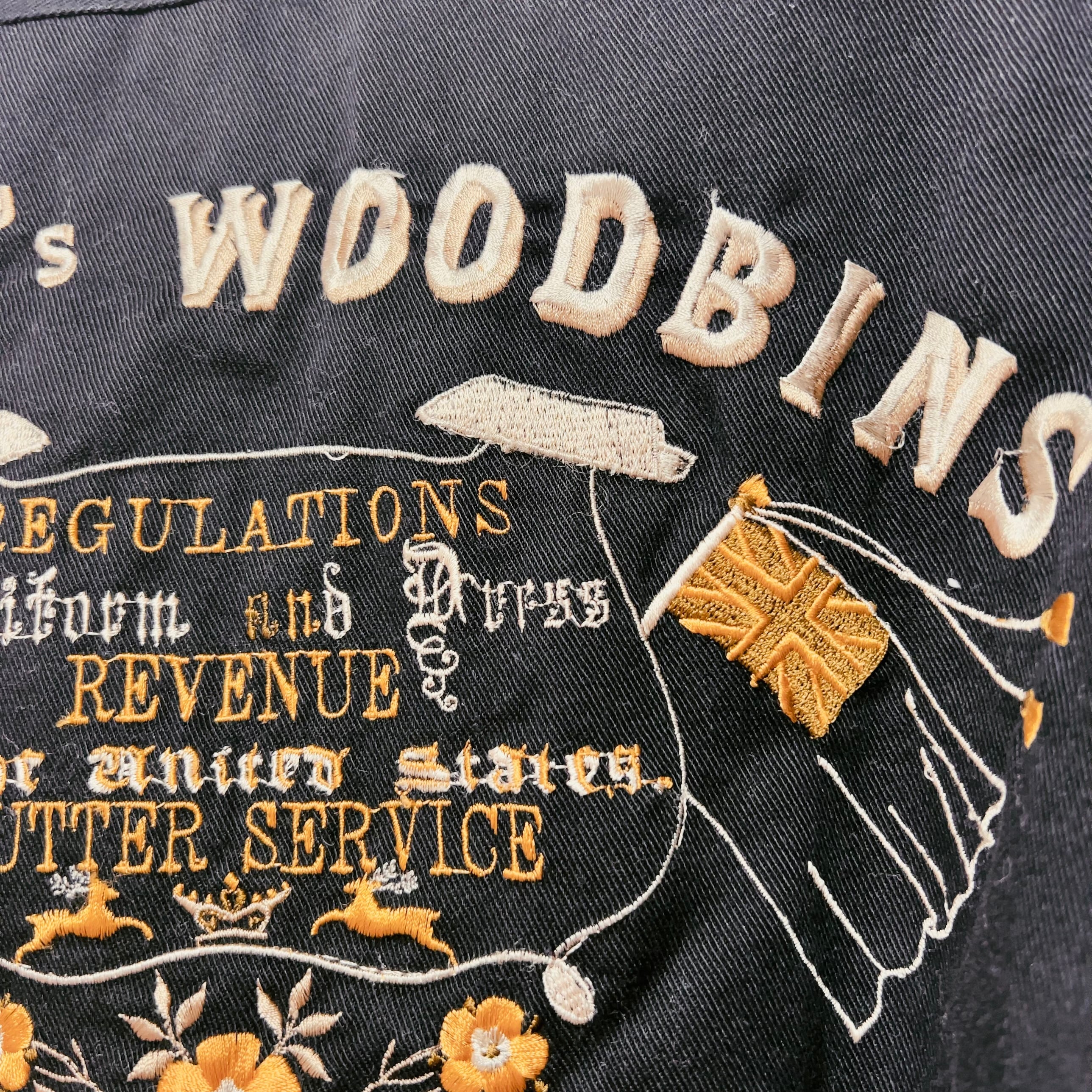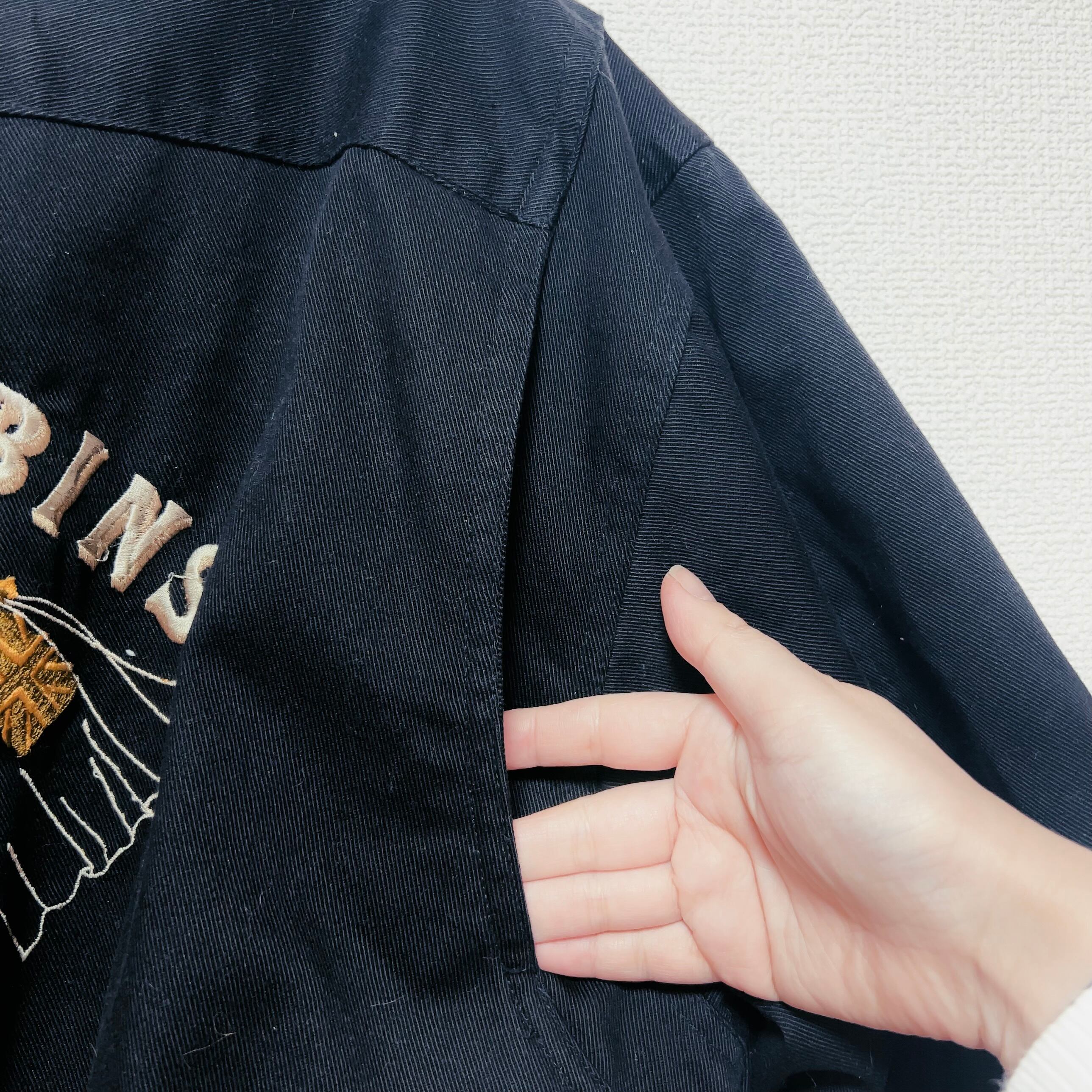 ブラックの厚手コットン生地をベースに、背面と胸元へ贅沢に施された刺繍が目を引く一着です。モチーフは密度高く配置されていながら、どこか余白を感じさせるバランス。