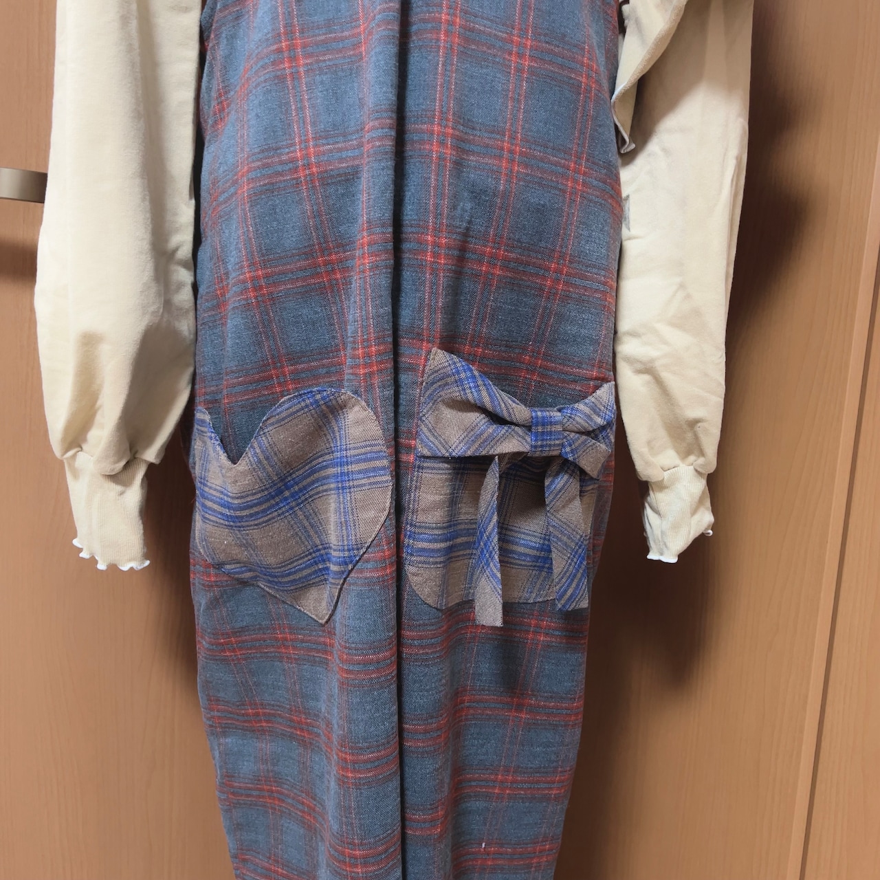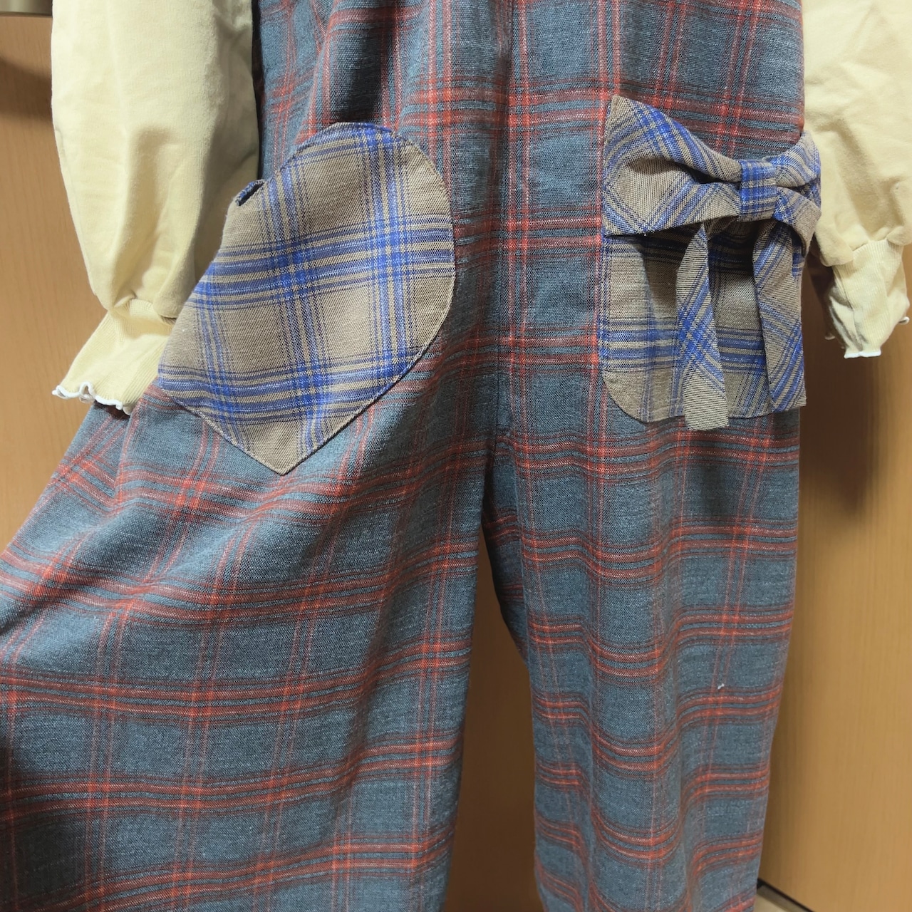 サロペットは胸当て部分に別布で仕立てた大きなリボンが付いたデザイン。