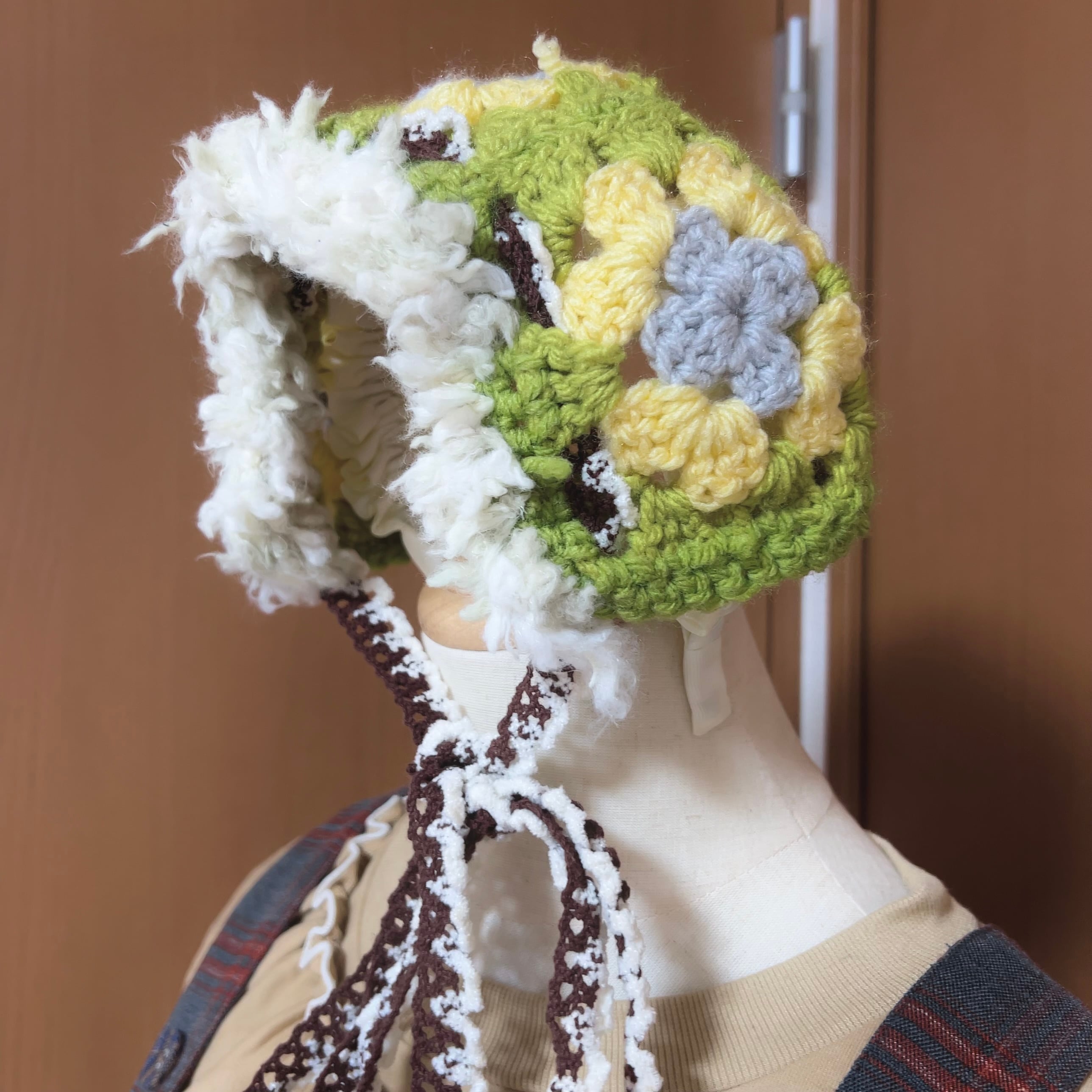 ヘッドドレスはモール毛糸を含む複数の毛糸を使用し、ふんわりとしたボリューム感。