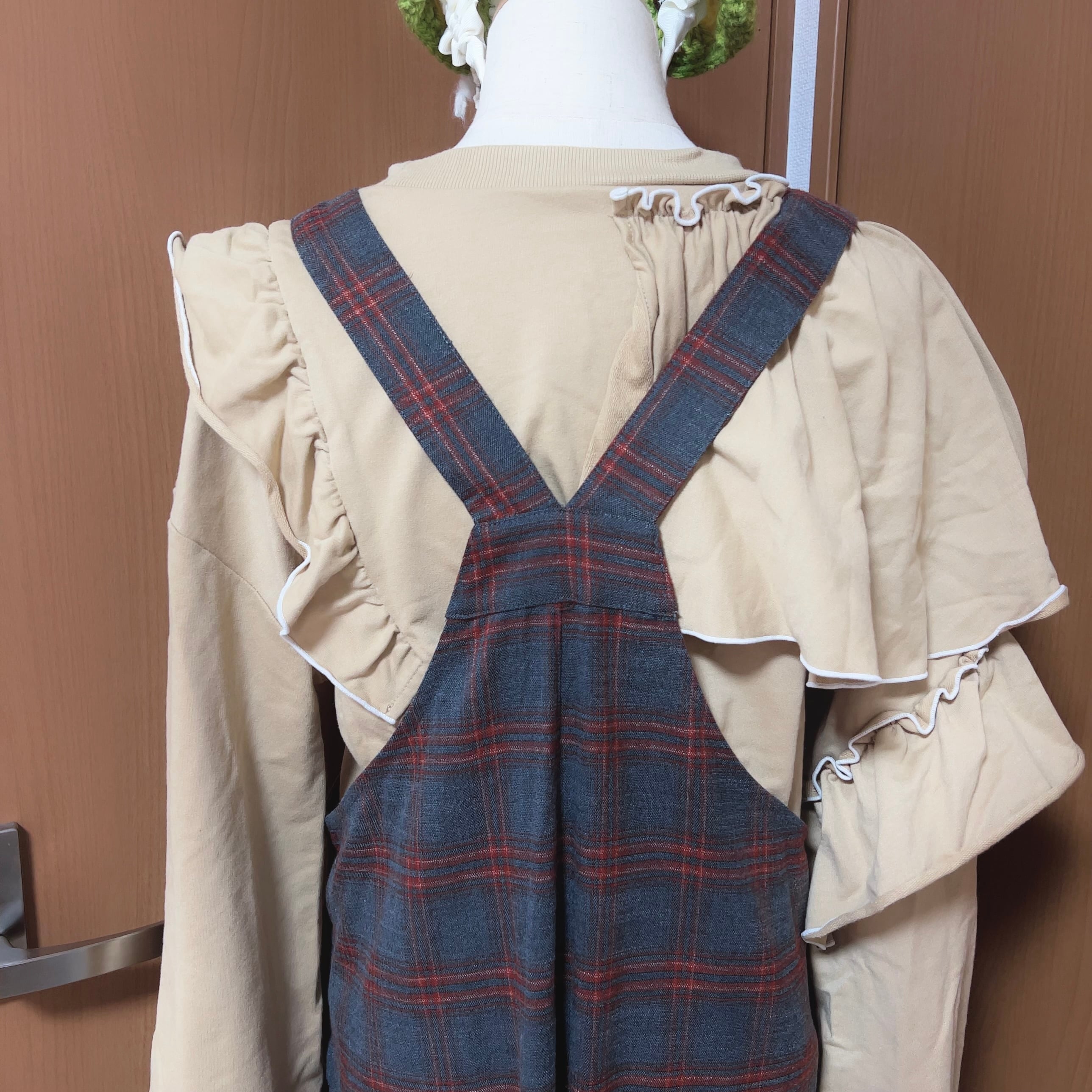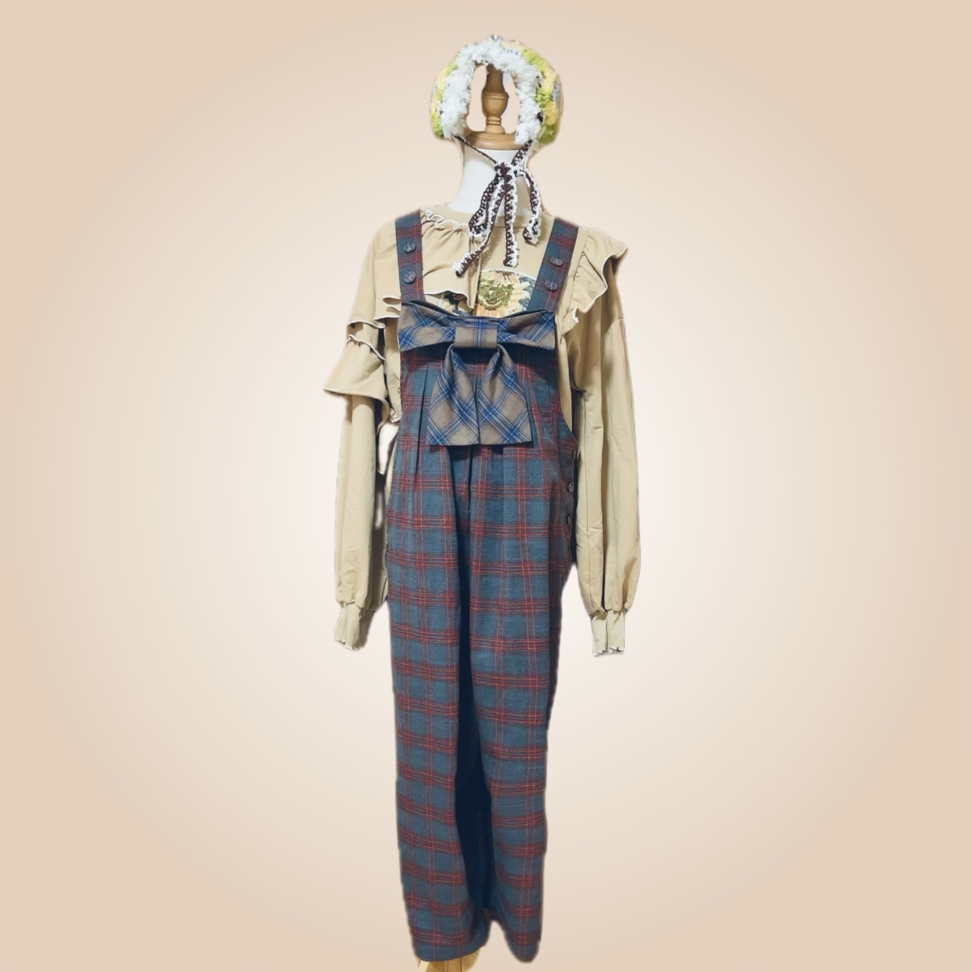 レトロなグレーチェックのサロペットパンツと、毛糸のヘッドドレスの2点セット。