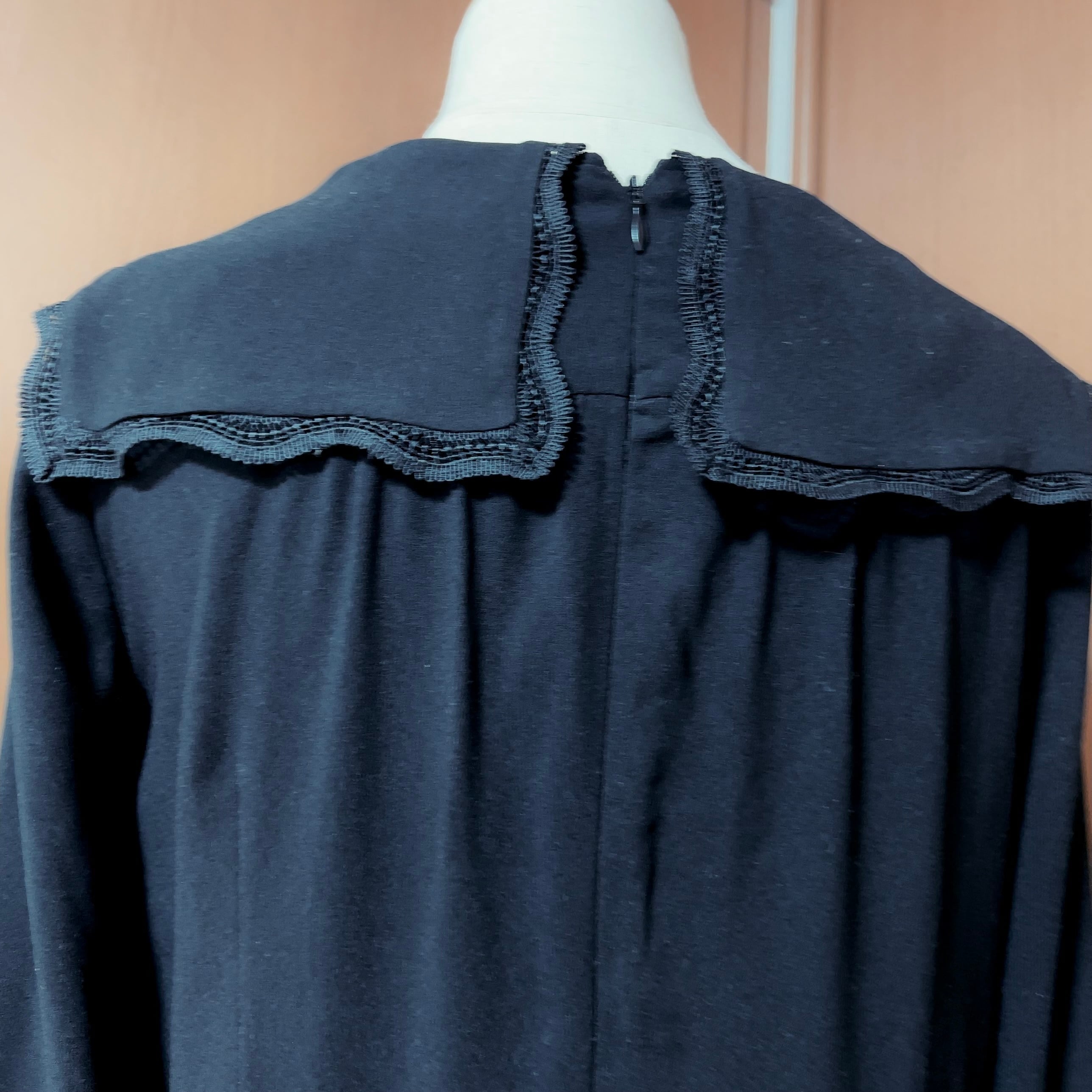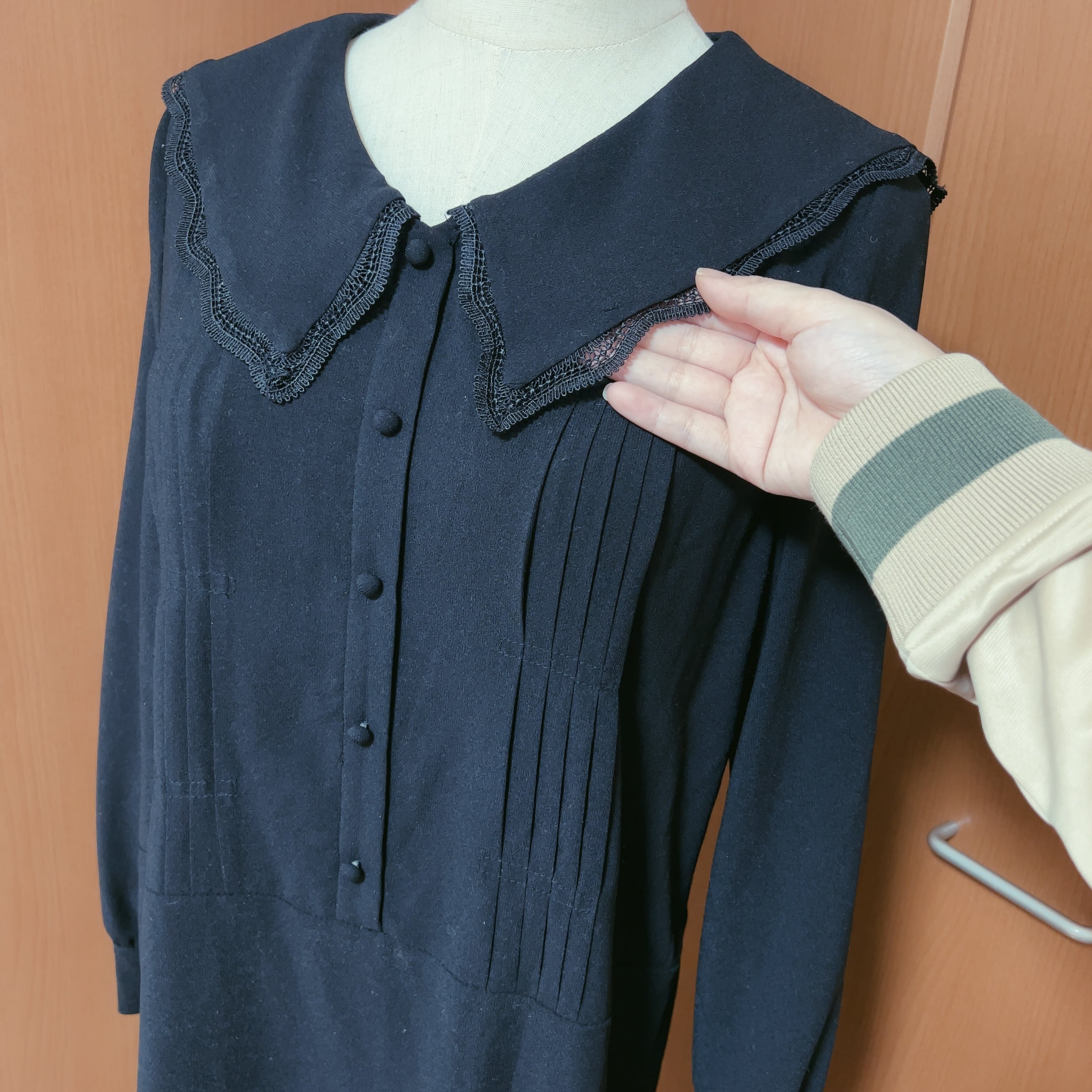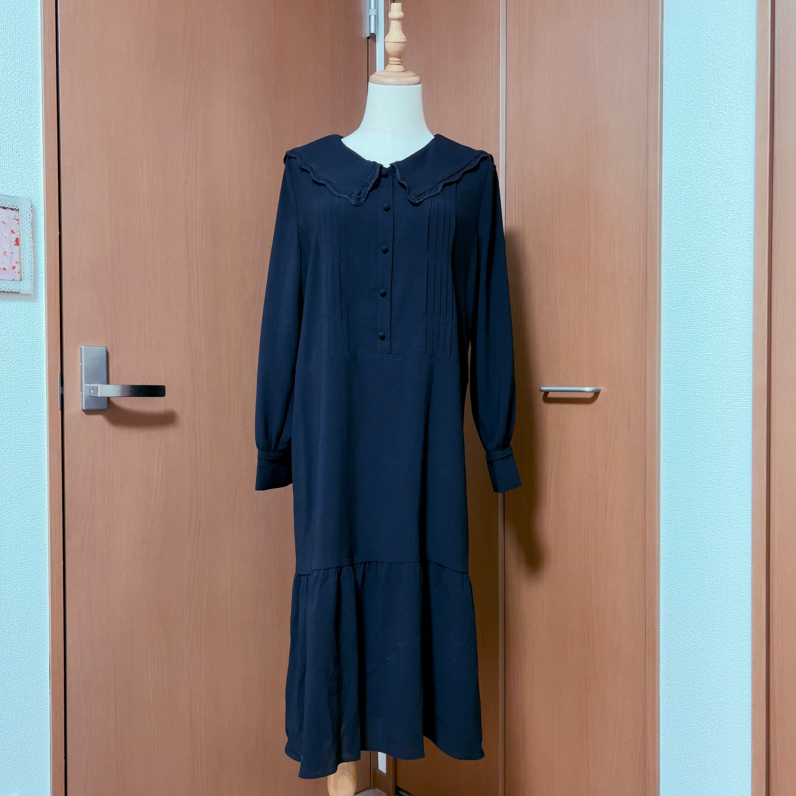ワンピースはシャリ感のあるさらりとした生地感で、ブラック一色ながらピンタックやボタン、襟元のレースが上品な表情を生み出します。裏地付き。