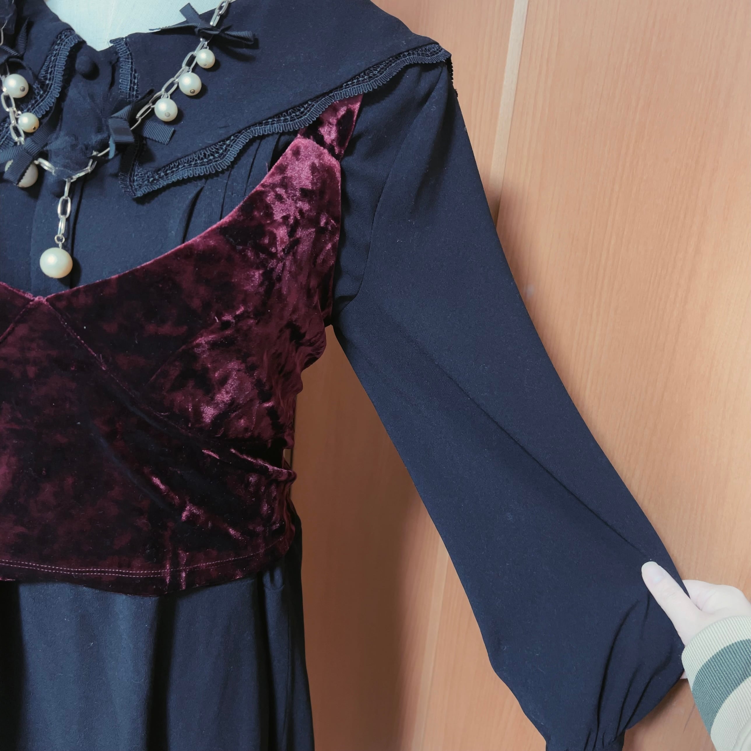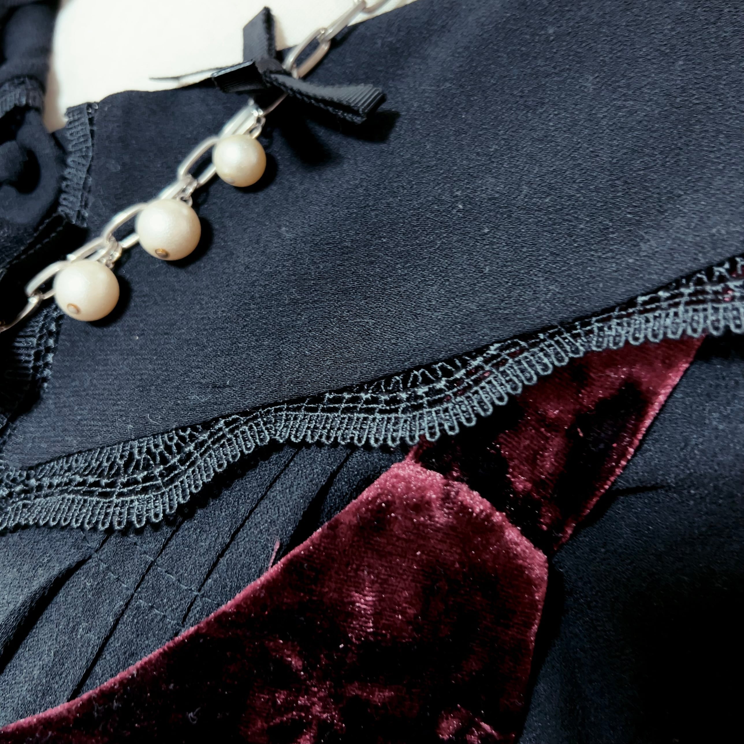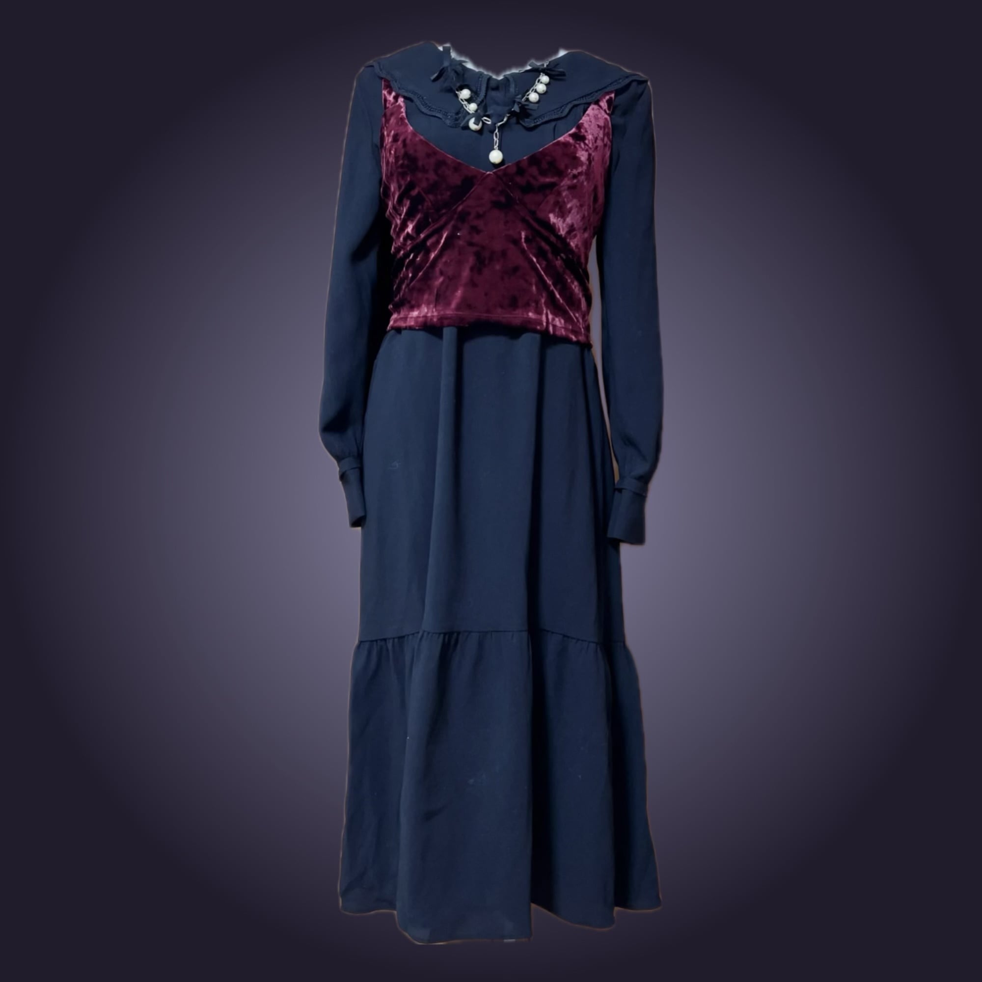 黒の海外製ヴィンテージスクエアカラーワンピース、燕脂カラーのベロアビスチェ、